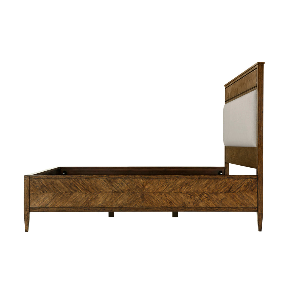 An undeniable super NOVA, this rustic oak design of the NOVA US King Bed, seen in our Dusk finish, captures the essence of a classic silhouette, with a hand-carved starburst design. Featuring an upholstered panel headboard with a framed oak side rail and tapered finished leg.