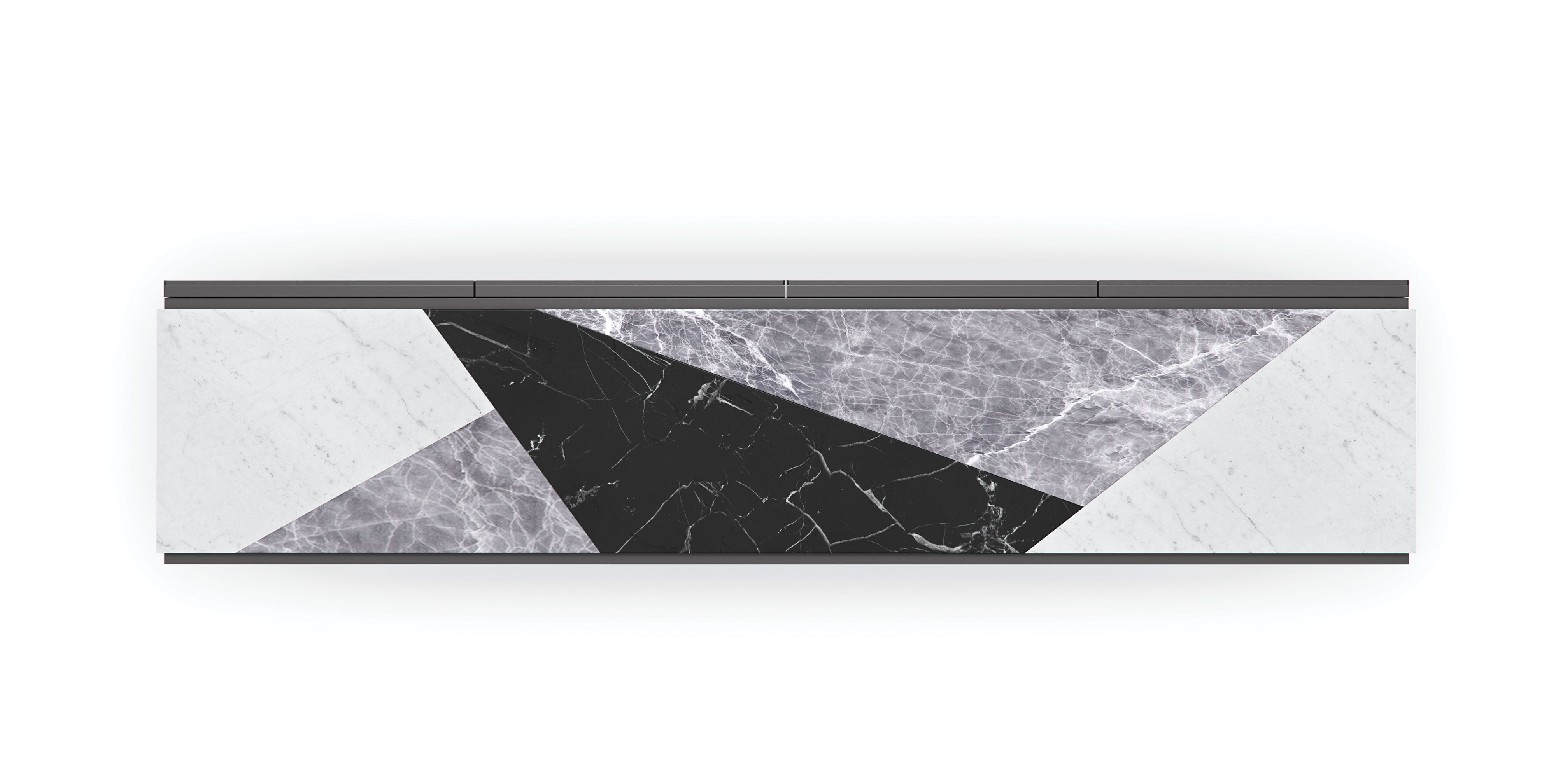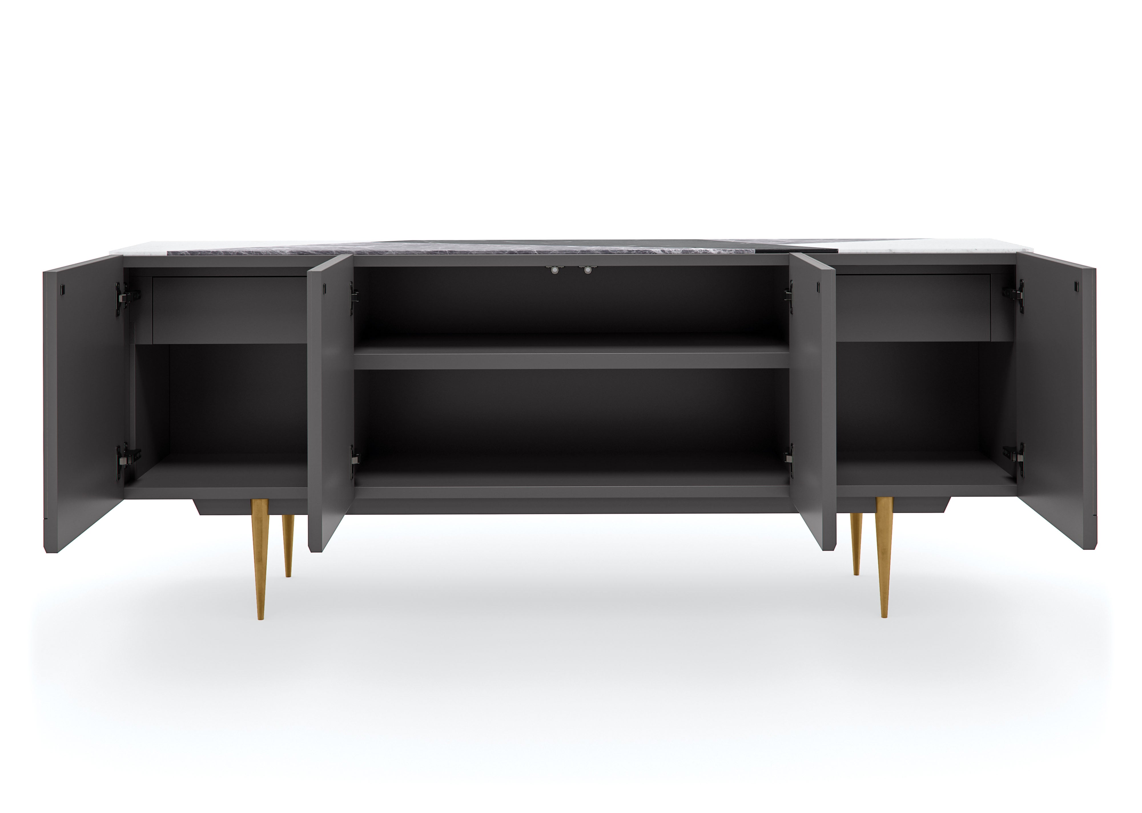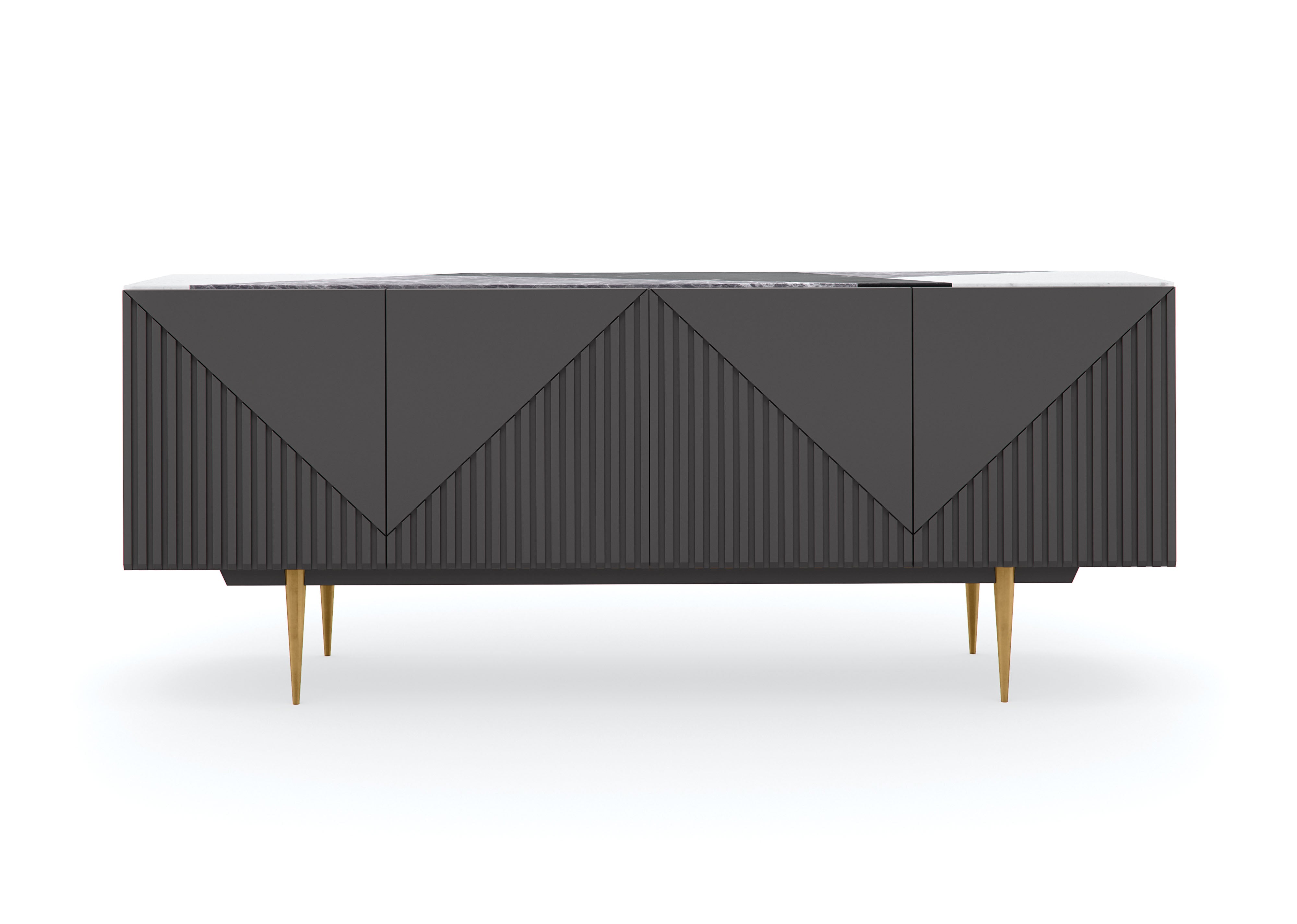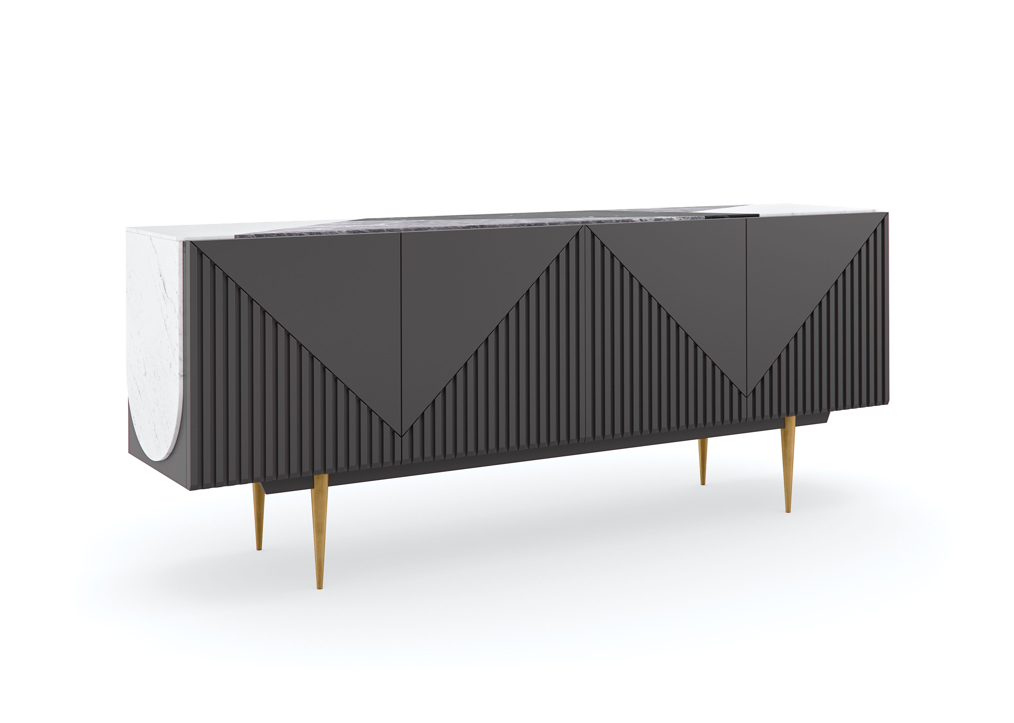Bring a modern form to traditional dining with our Over the Edge buffet, finished in Warm Slate and a mix of polished marble and stone. Graphic slat details add dimension to this contemporary design, balanced on tapered metal legs in Champagne Gold. Perfect for happy hours and hosting, it offers generous storage with two drawers, adjustable shelves and open space, neatly concealed by touch-latch doors. Or, style as a statement-making console in living rooms, halls, and entryways.
