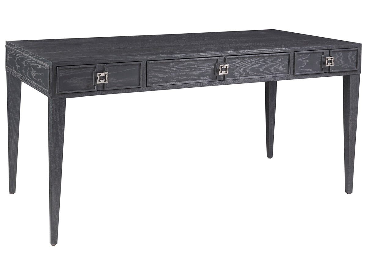 Mahogany solids and white oak veneers in an anthracite ceruse finish featuring light gray liming, stunning brass hardware plated in nickel. Features include 2 full-extension soft-closing storage drawers, and a full extension drop-front keyboard drawer in the center. 2 full extension soft-closing storage drawers, full extension drop-front keyboard drawer in center . . , SIGNATURE DESIGNS ,