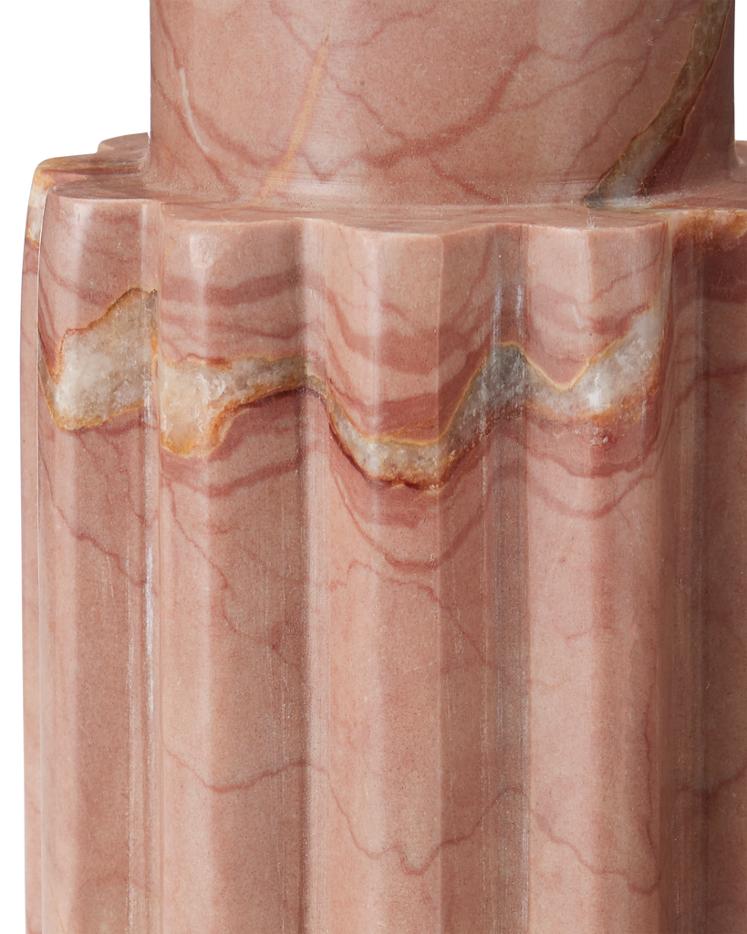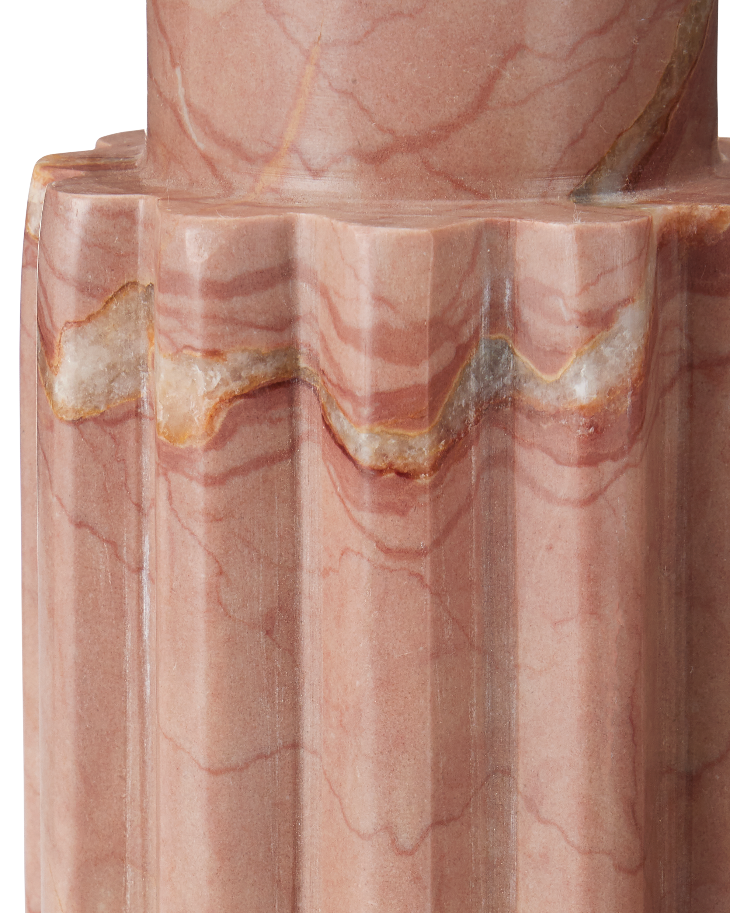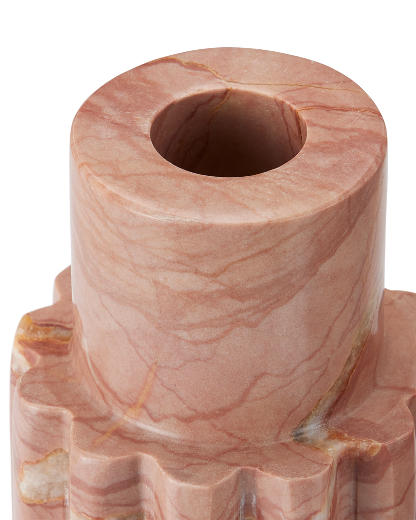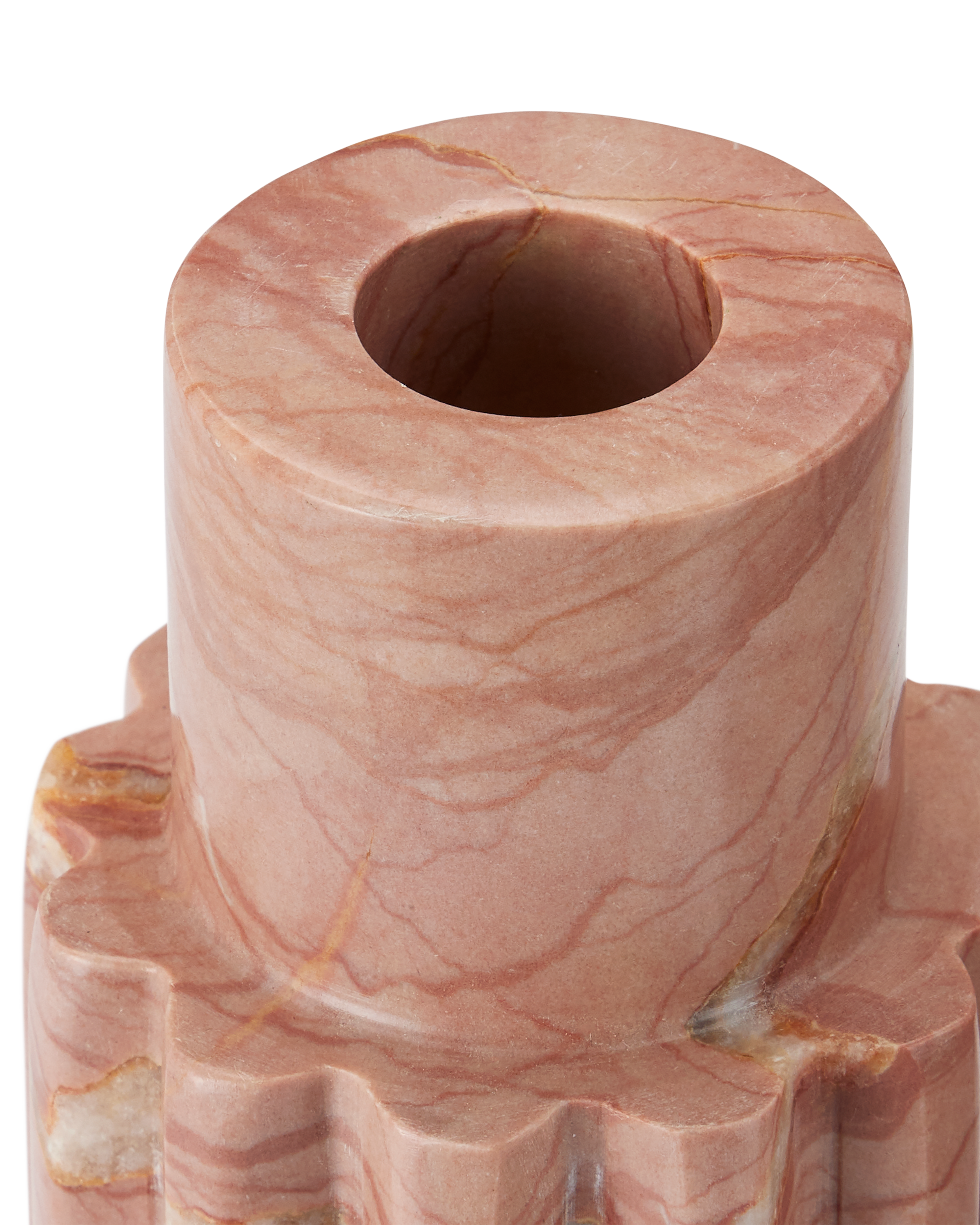 The Penrose Pink Candle Holder Set includes two candle holders made of a Rosa Cappuccino marble. The geometric shapes that comprise its profile are enlivened by the natural veining of the stone, making each one unique. The characteristics of this stone bring a warm pink and deeper rose interplay to their surfaces.