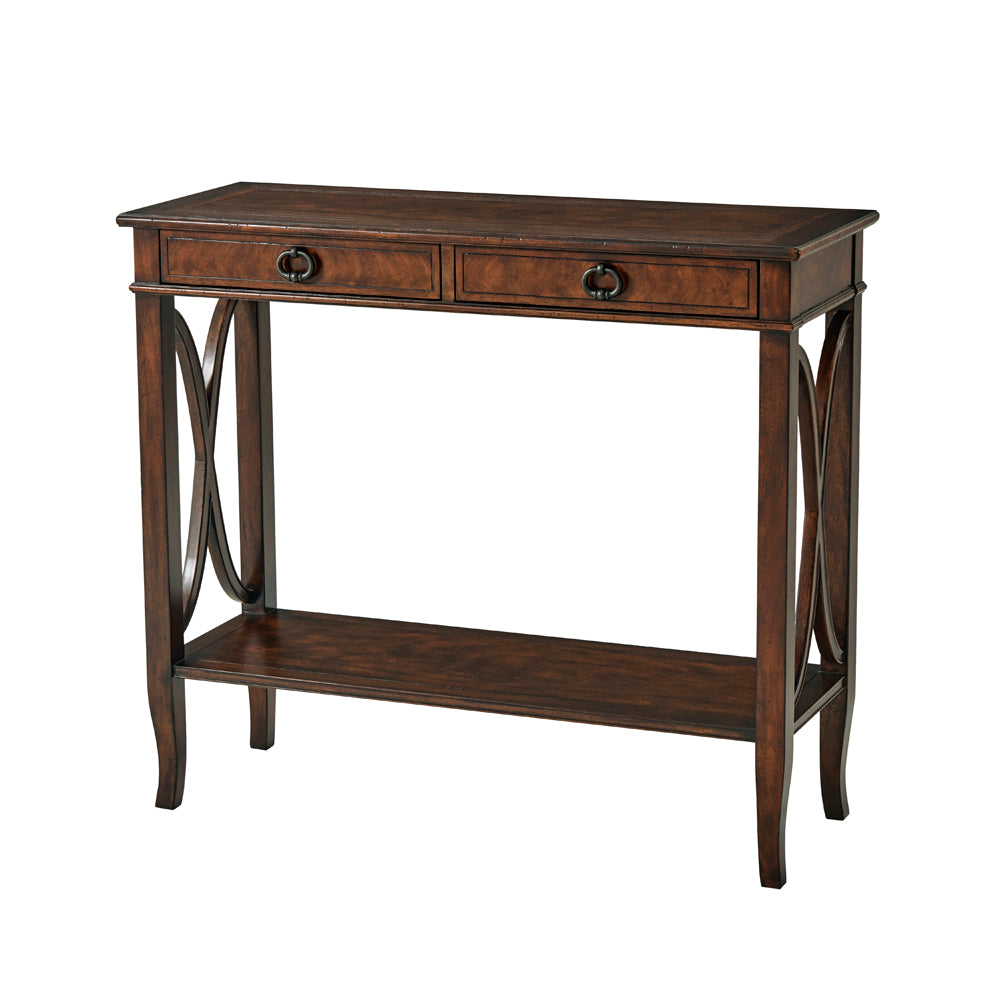 A cerejeira veneered and mahogany console table, the rectangular crossbanded and moulded edge top above two frieze drawers, on square legs joined to the sides by wavy 'X' stretchers and on splayed legs, joined by a crossbanded undertier. Inspired by a 20th century French original.