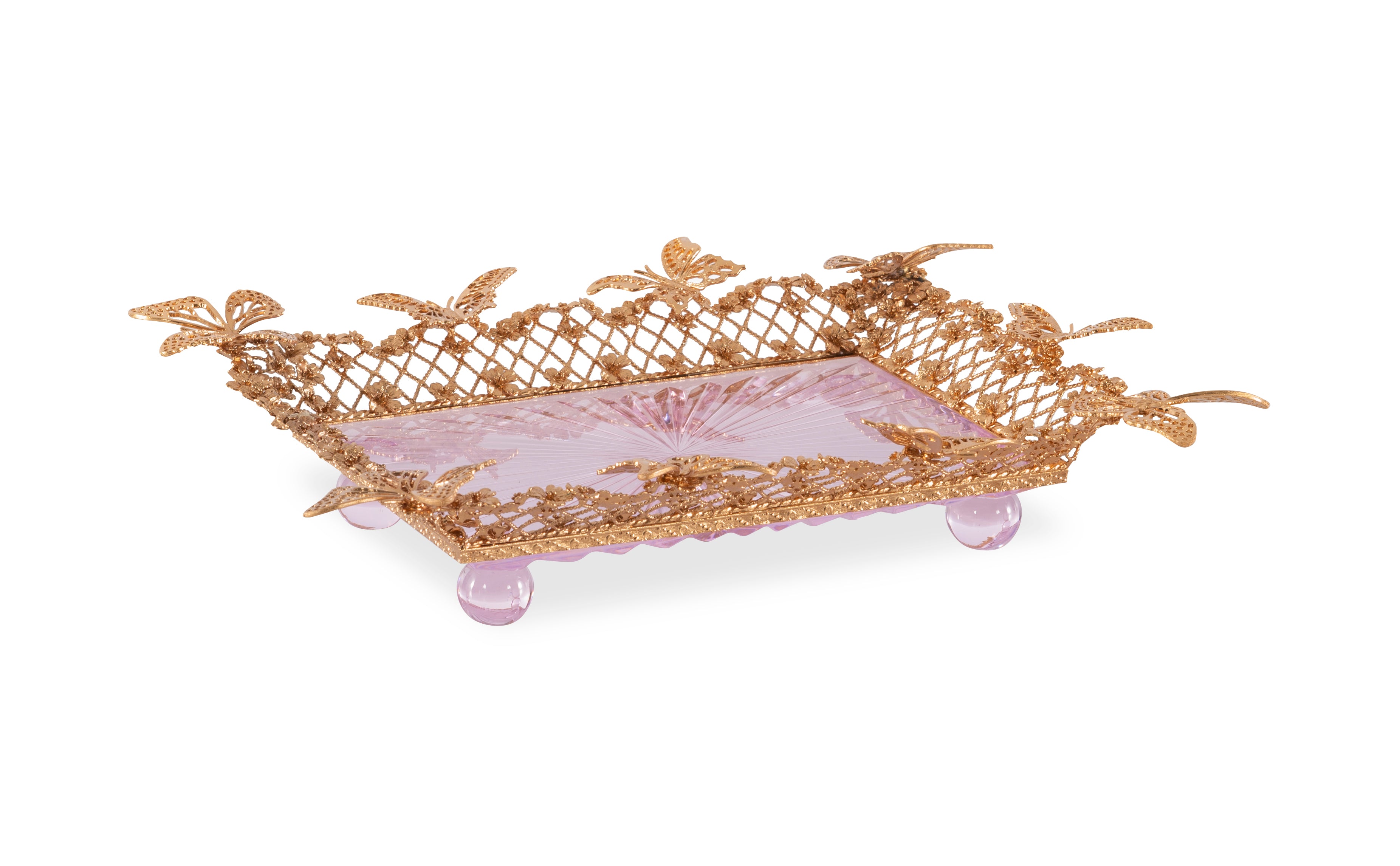 Rectangular Pink Crystal tray, engraved by hand with a central starburst pattern. Metal details, including the delicate butterflies perched on its frame, are lost-wax cast in solid brass and finished in gold.