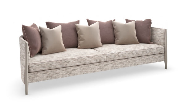 An iconic silhouette is reimagined in a menswear-inspired, tactile fabric for a statement-making sofa that’s chic and sophisticated. Clean lines and curves with a smooth upholstered back define this classic style, accentuated by contrast piping along the frame and seat cushions. Fluted tapered legs in Soft Silver paint add a hint of glamour, complemented by down toss pillows in a lush velvet colorstory.