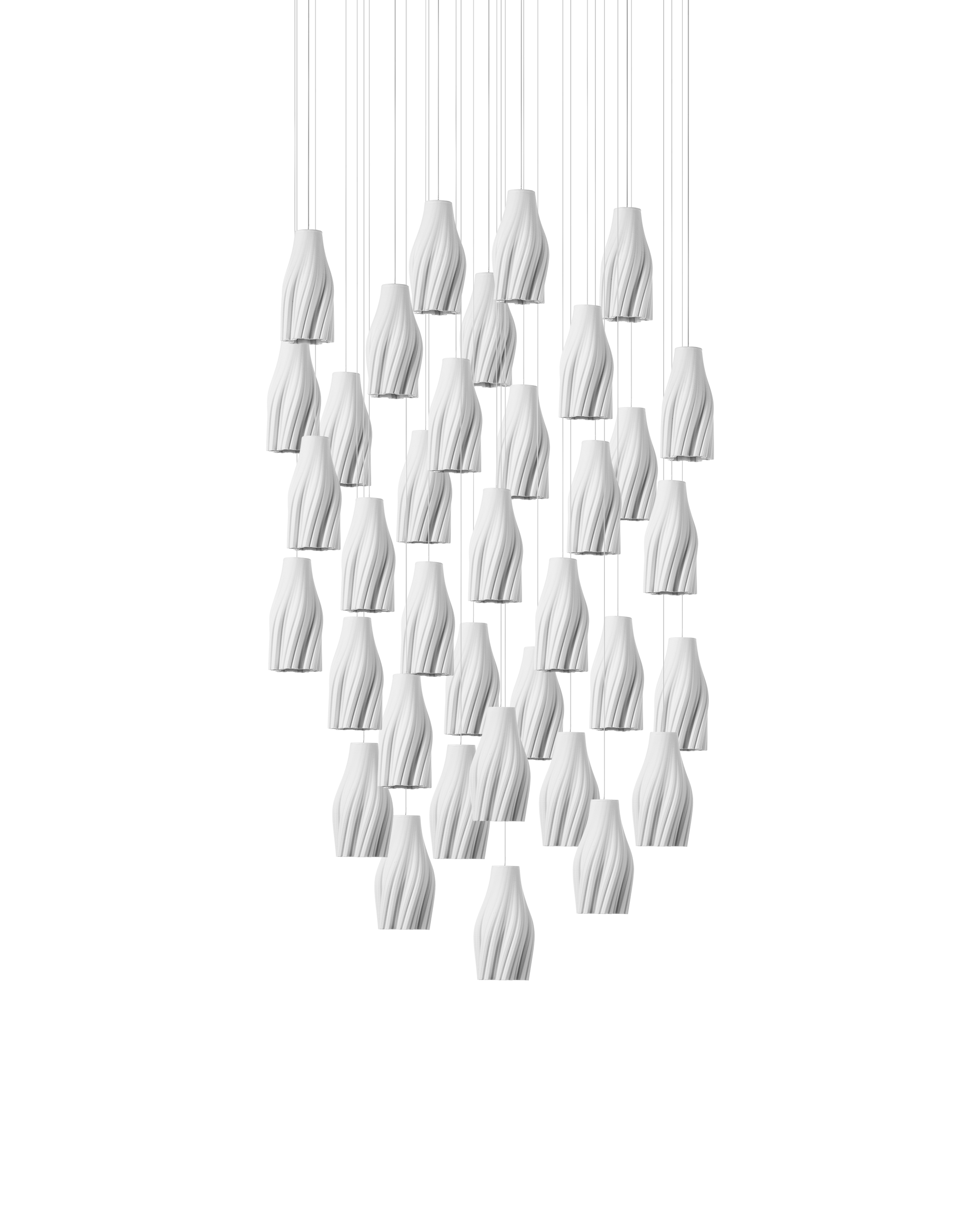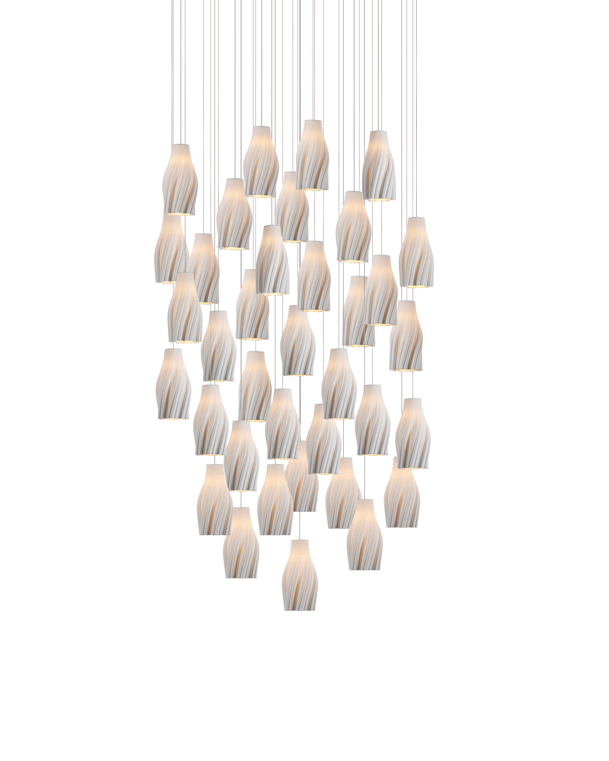 The Posh 36-Light Round Multi-Drop Pendant has shades made of white ceramic crafted to resemble tassels. The sense of movement created by the material is an artisanal touch that brings the shades a lovely graceful quality. The thin silver cables from which they hangs leave the shades themselves to be the star of the design.
