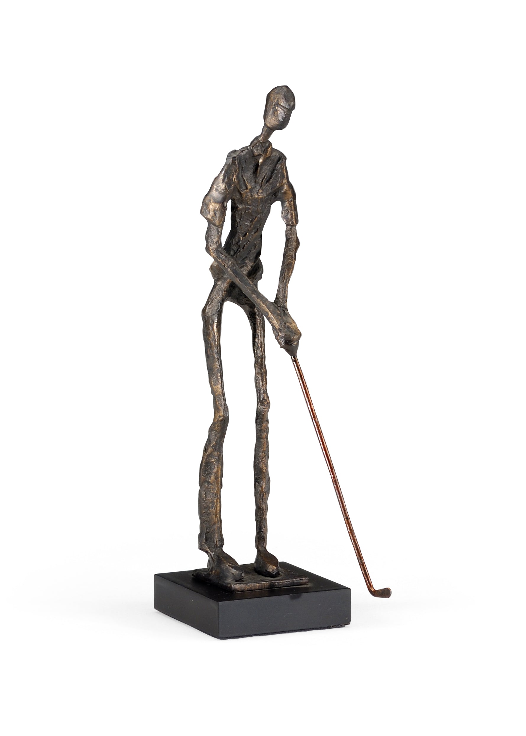 As most golf enthusiasts will tell you, the game of golf is won on the putting green. Featuring a cast metal elongated figural sculpture with a bronze finish, Putting Golfer is a playful accent for a library, den or office.
