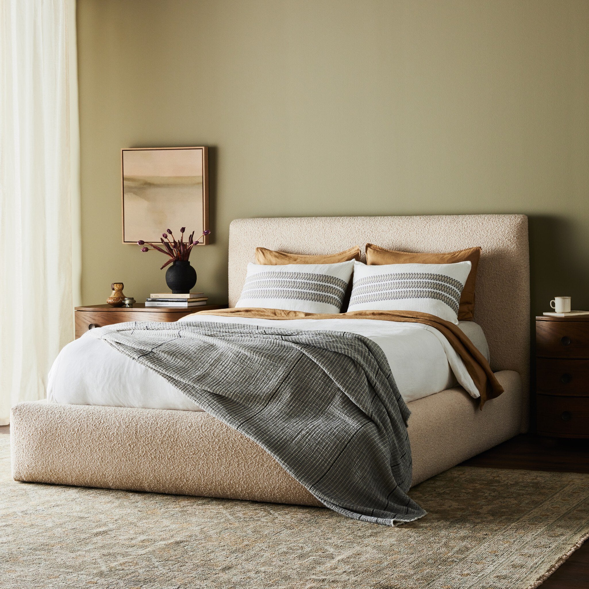 Modern, clean shaping meets inflated comfort with this padded, upholstered bed frame in a textural boucle-like pattern.