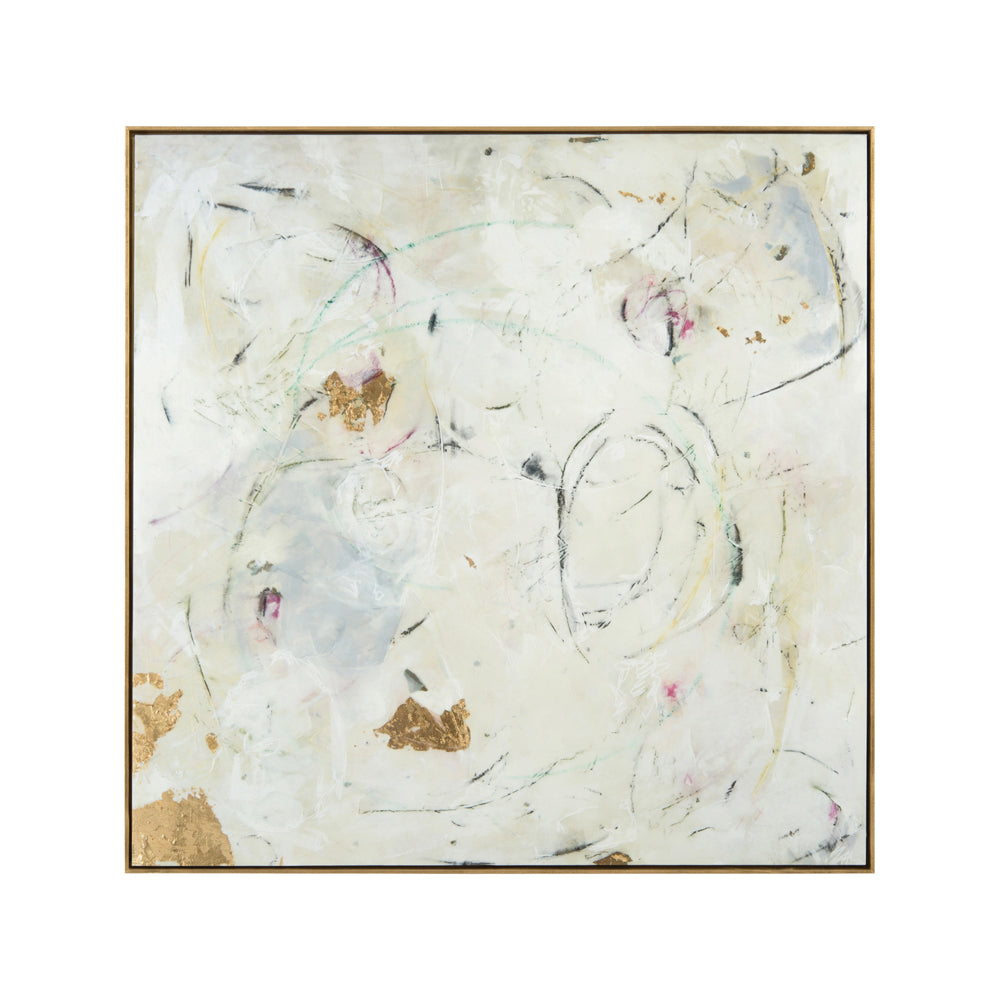 This whimsical piece by artist Rebekah Lea is a lovely addition in springlike colors. The piece is touched by hints of gold leaf and added gel for texture. An aged silver molding surrounds the artwork.