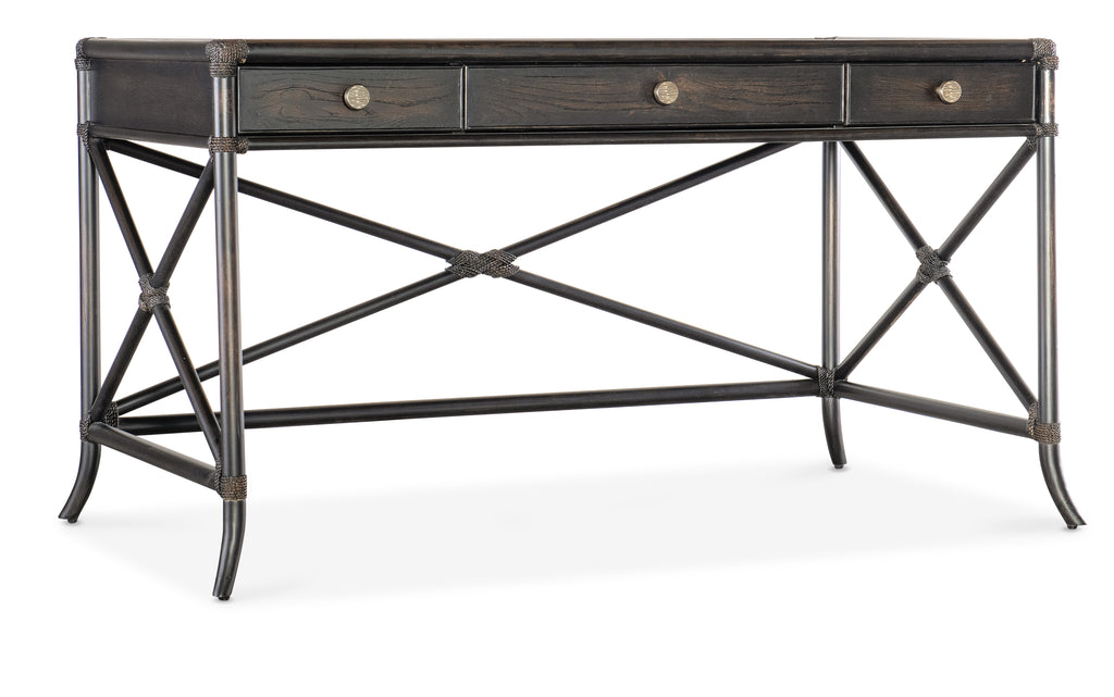 With the sublime vibe of an island oasis, the Retreat Writing Desk is crafted of Oak and Maple Veneers in a Bamboo motif and accented by rope. X-design stretchers on the back and sides distinguish the piece, along with the Black Sand finish, transparent by design to showcase the unique patterns of the wood veneer. Featuring three drawers, the left and right drawers have two removable dividers. One pencil tray and one writing slide may be used on either side, and the center drawer has a drop-front for keyboard use. Finished on all sides.