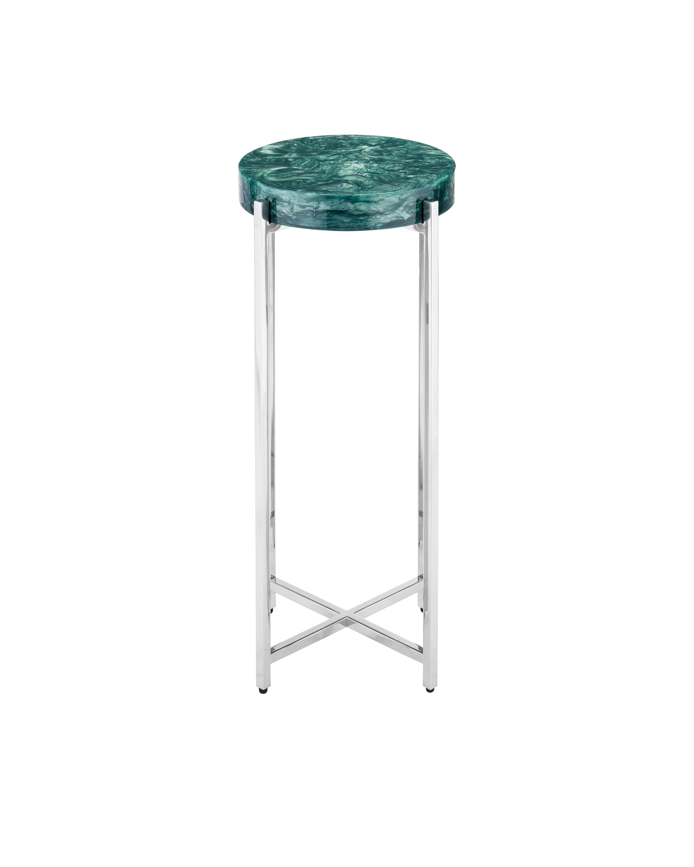 The organic patterning on the top of the Rina Teal Drinks Table is a striking display of fine artisanship. The round disc, which is inset into the metal frame like a gem, has a swirling surface created when pearlescent powder was mixed with composite to create the organic patterning. Four legs made of stainless steel in a polished nickel finish are connected by an ex-shaped stretcher. The silver and teal drinks table will bring radiant charm to any spot even though it’s small.