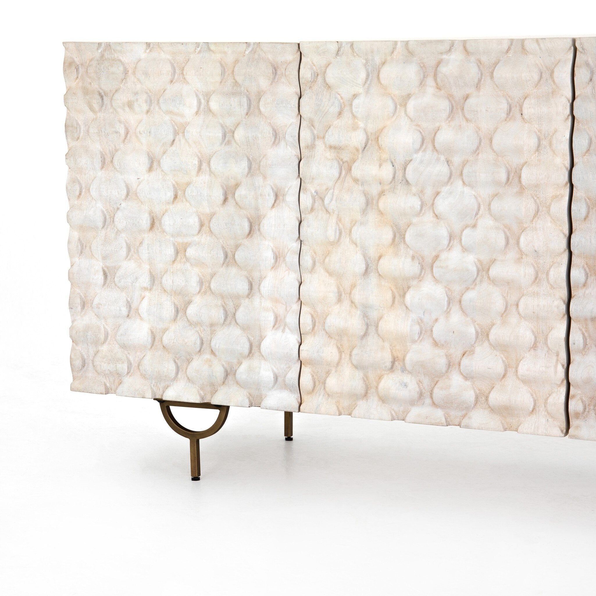 White-washed mango wood adopts intricate CNC carving for a uniquely textured look. Rounded iron legs offer an intriguing material mix with a modern touch. Spacious interior shelving for media, plus rear cutouts for cord management.