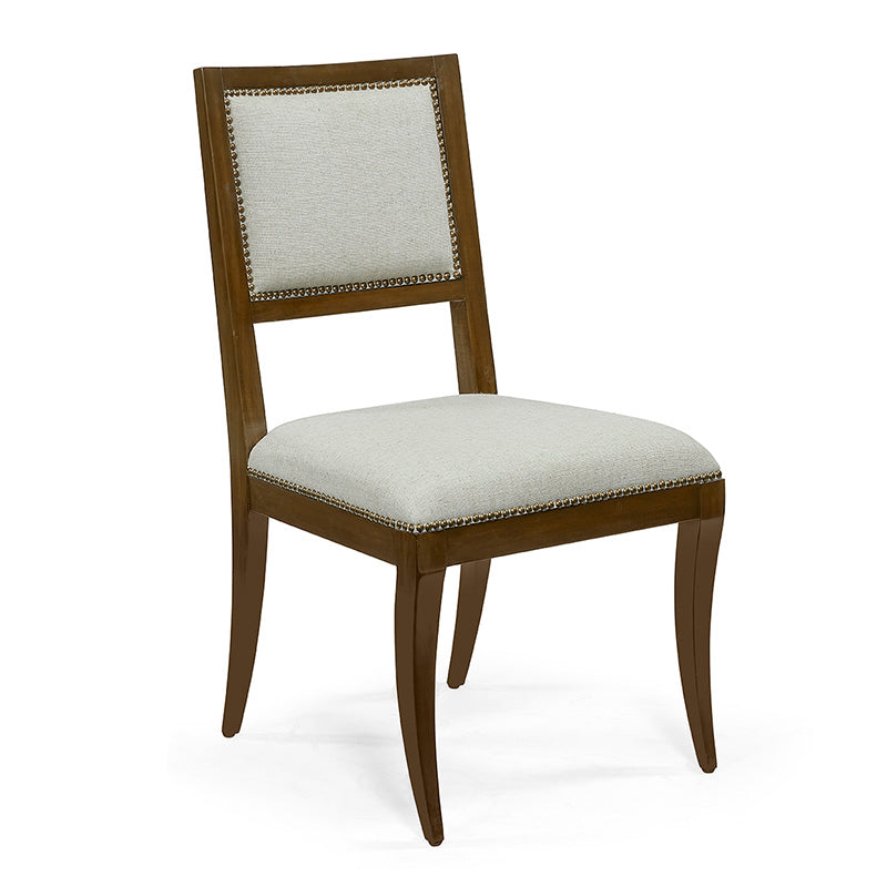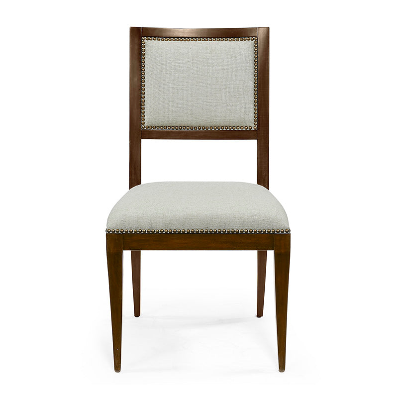 An upholstered fabric back is adorned with antique brass nail heads above an upholstered repel stainguard linen seat raised by tapering posts.