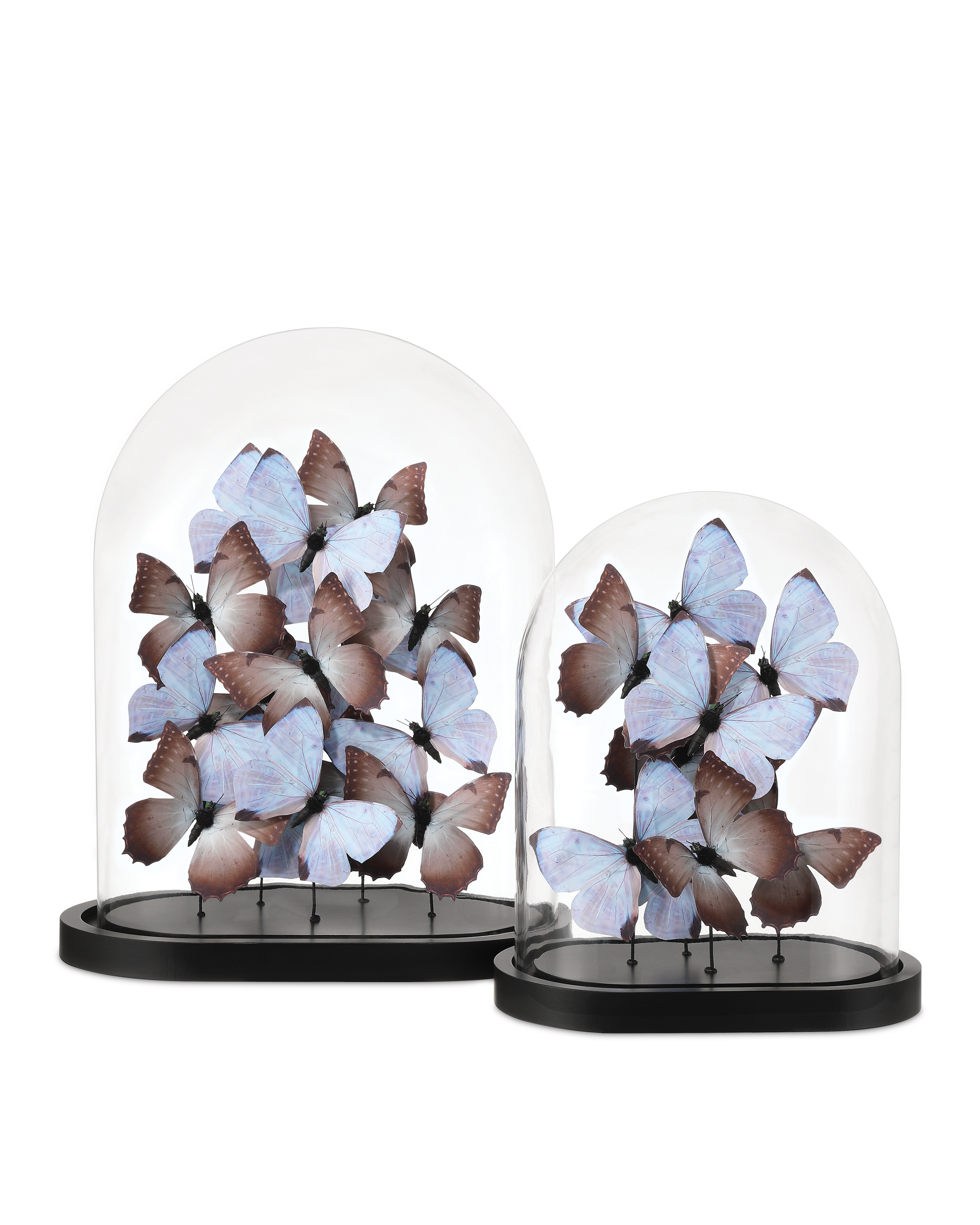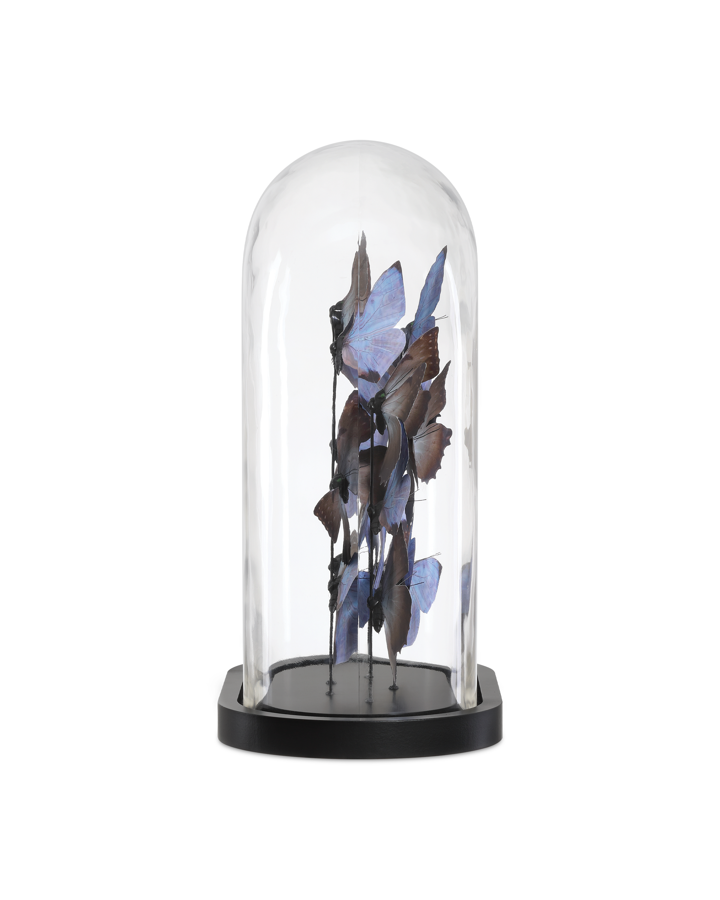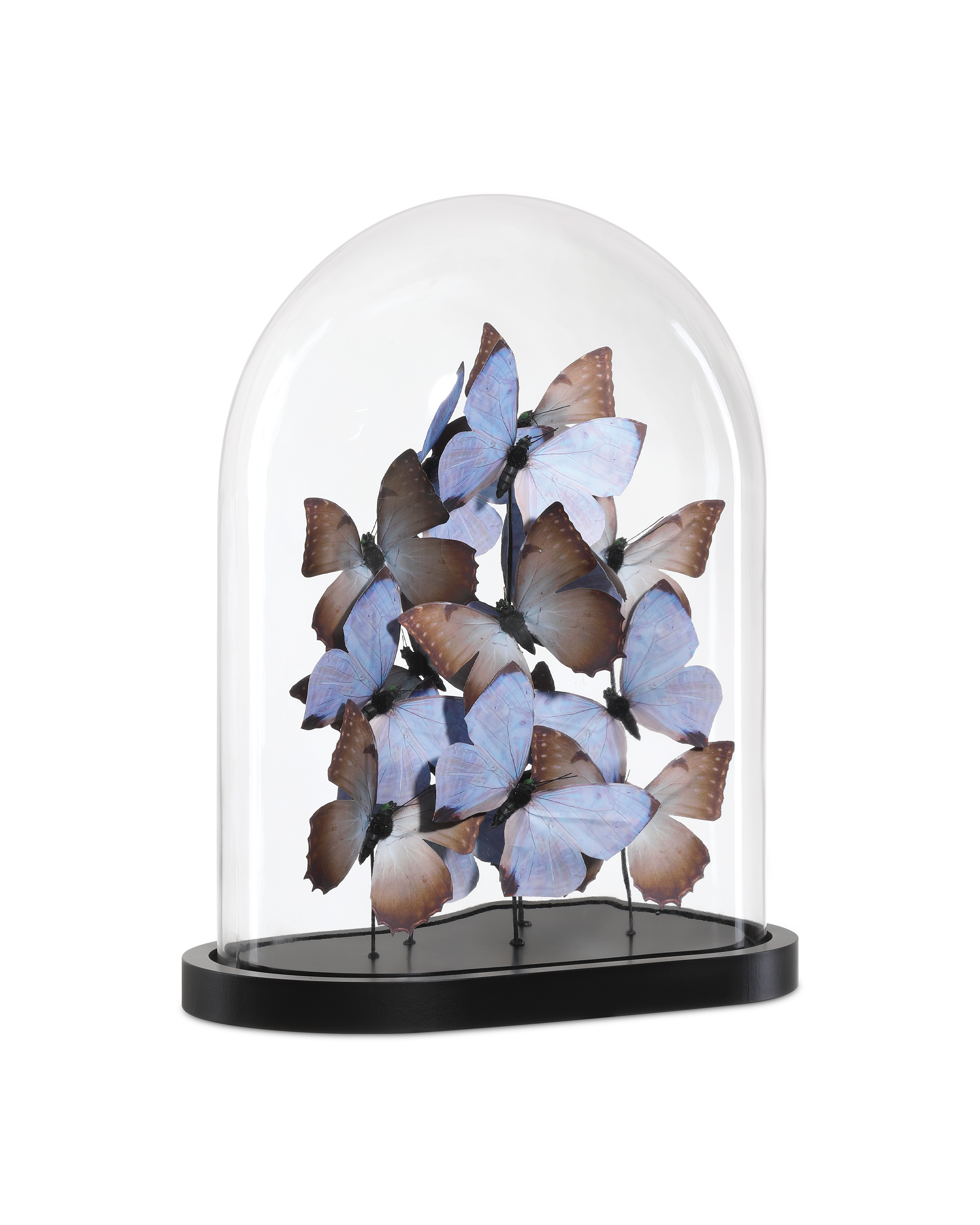 The enchanting Rue de Bac Pale Blue & Pink Large Butterflies are crafted from forging paper, each butterfly meticulously shaped and arranged to appear as though it's gracefully fluttering within a glass dome. Soft pale blue and blush pink tones add a dreamy quality to the composition that is set atop a sleek black oval base to provide a modern contrast to the airy, nature-inspired design.