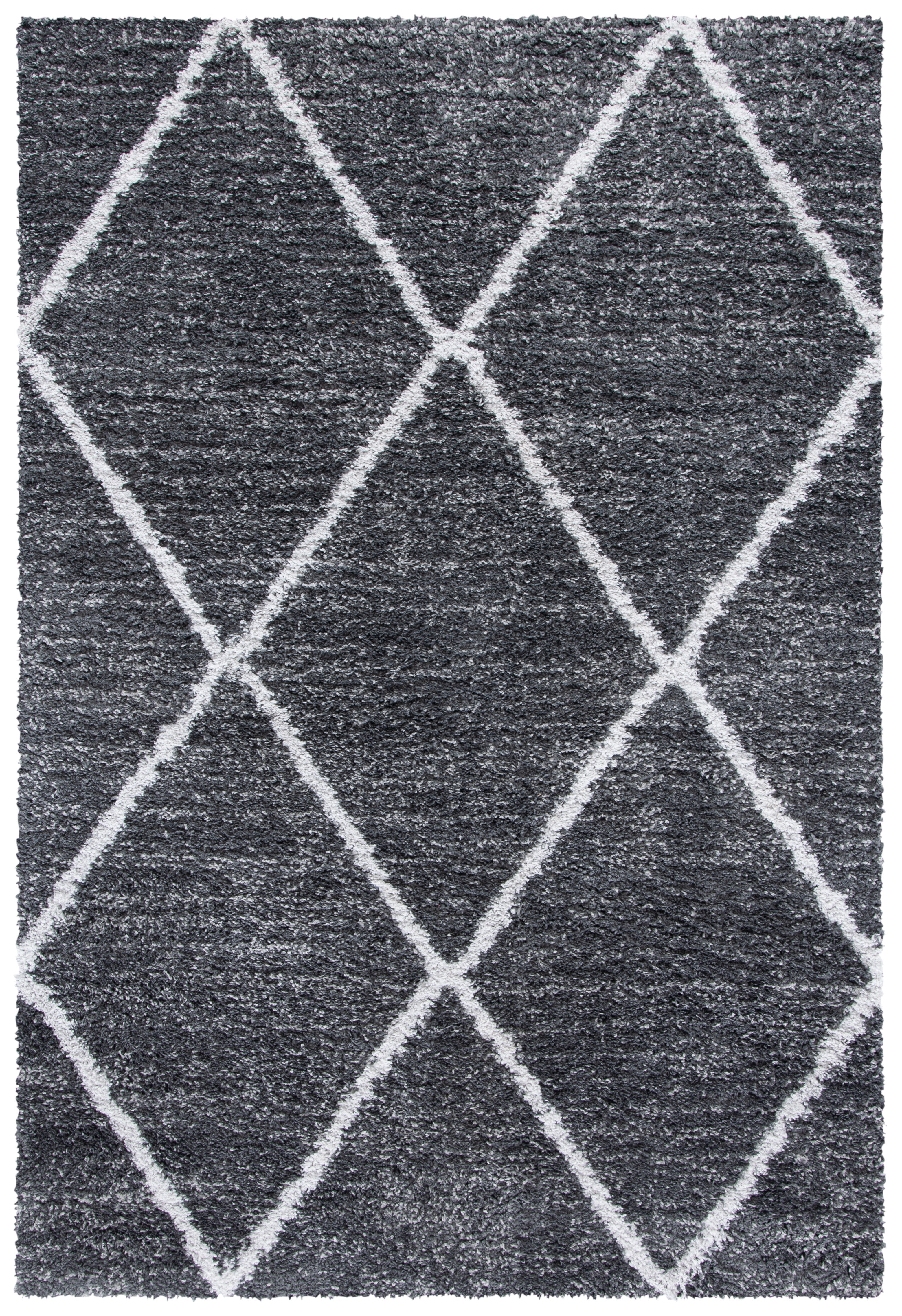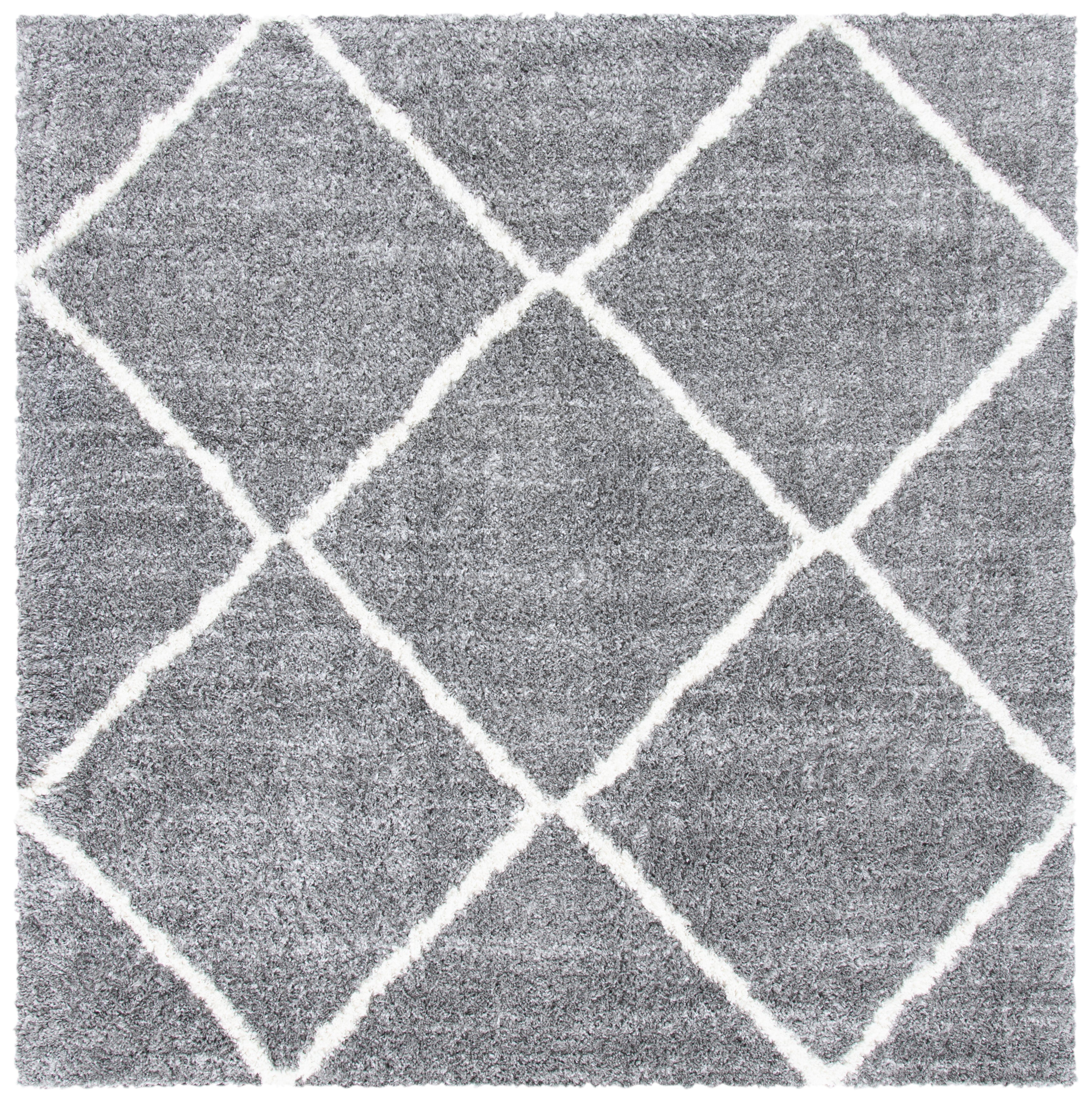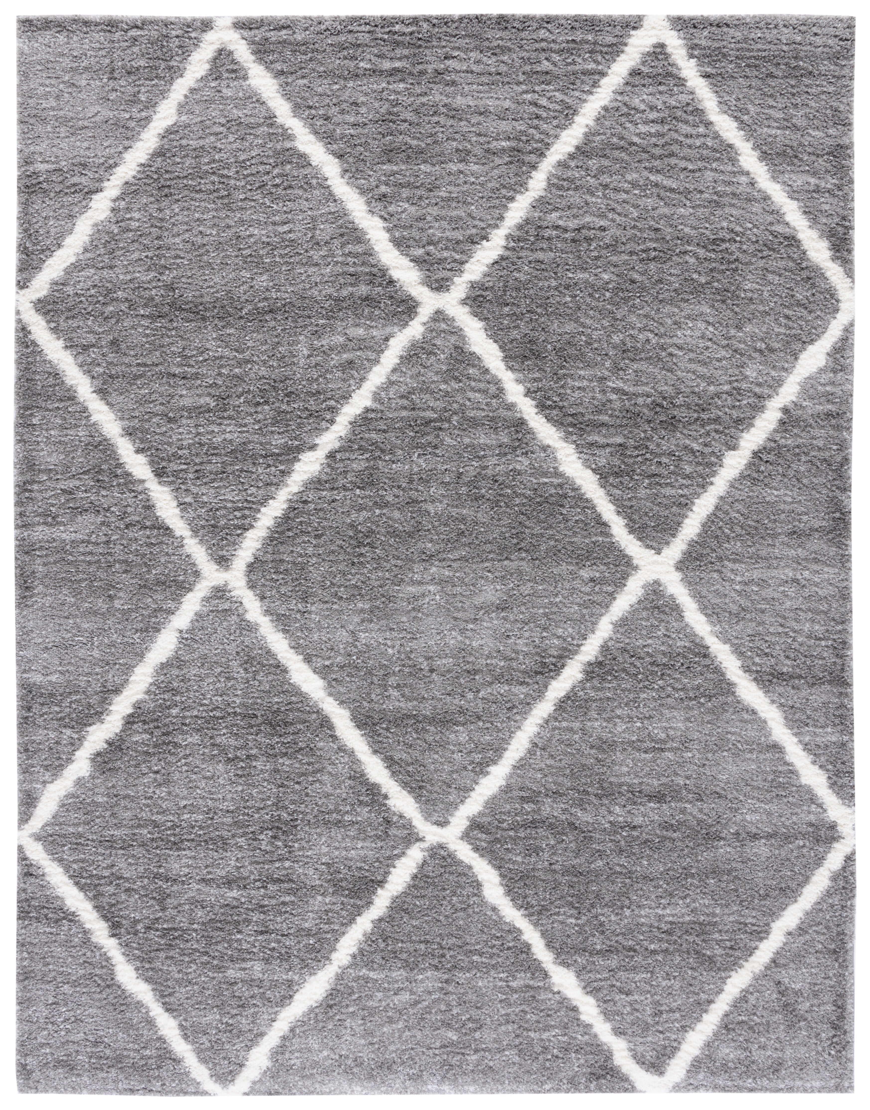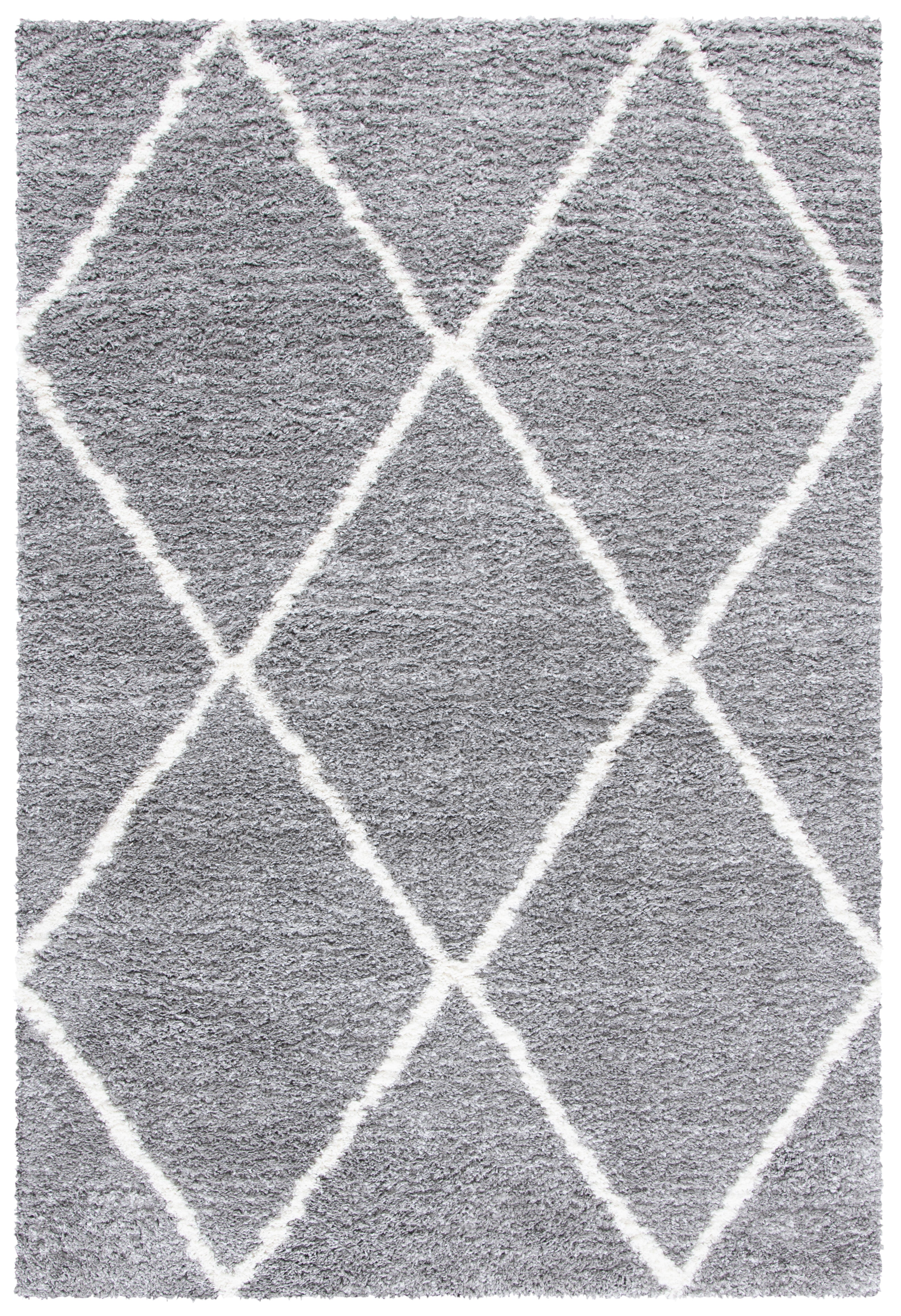 The rug's color palette is a serene harmony of GREY and IVORY, lending itself to a tranquil and sophisticated atmosphere that complements any decor. Its design features a timelessly chic diamond pattern that radiates a sense of calm sophistication in your space while providing a gentle contrast.