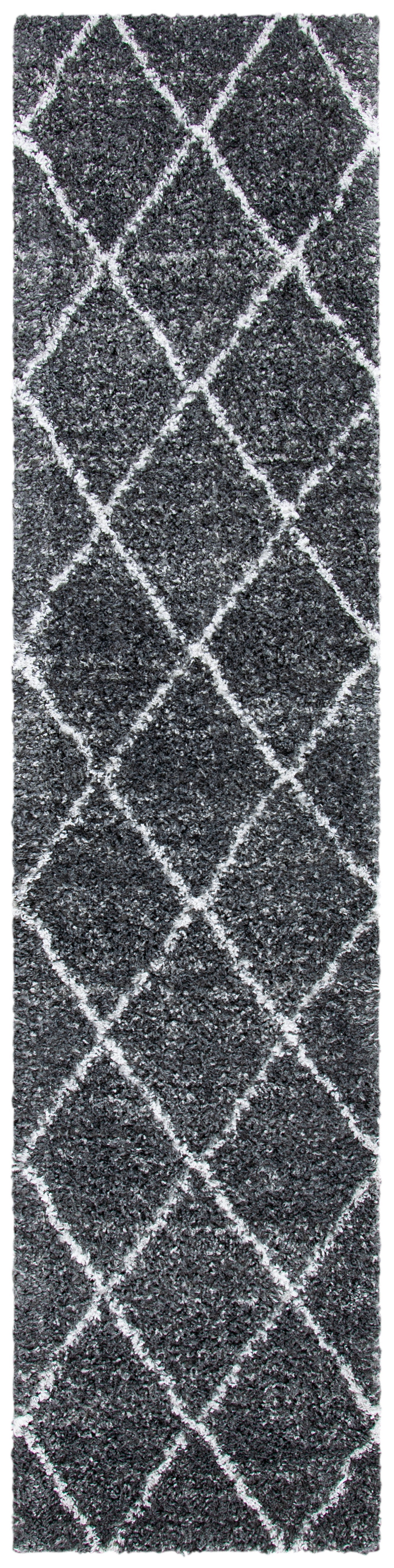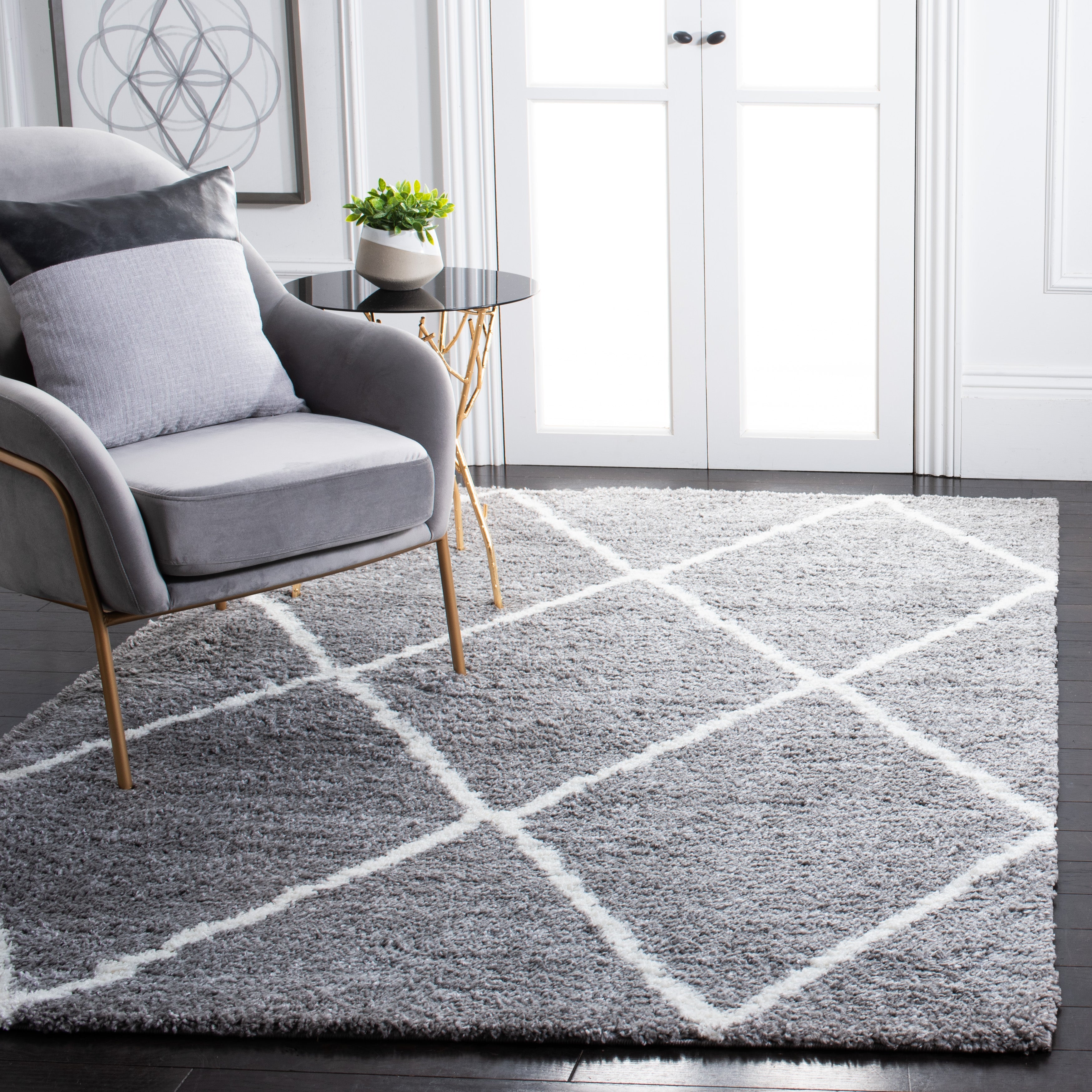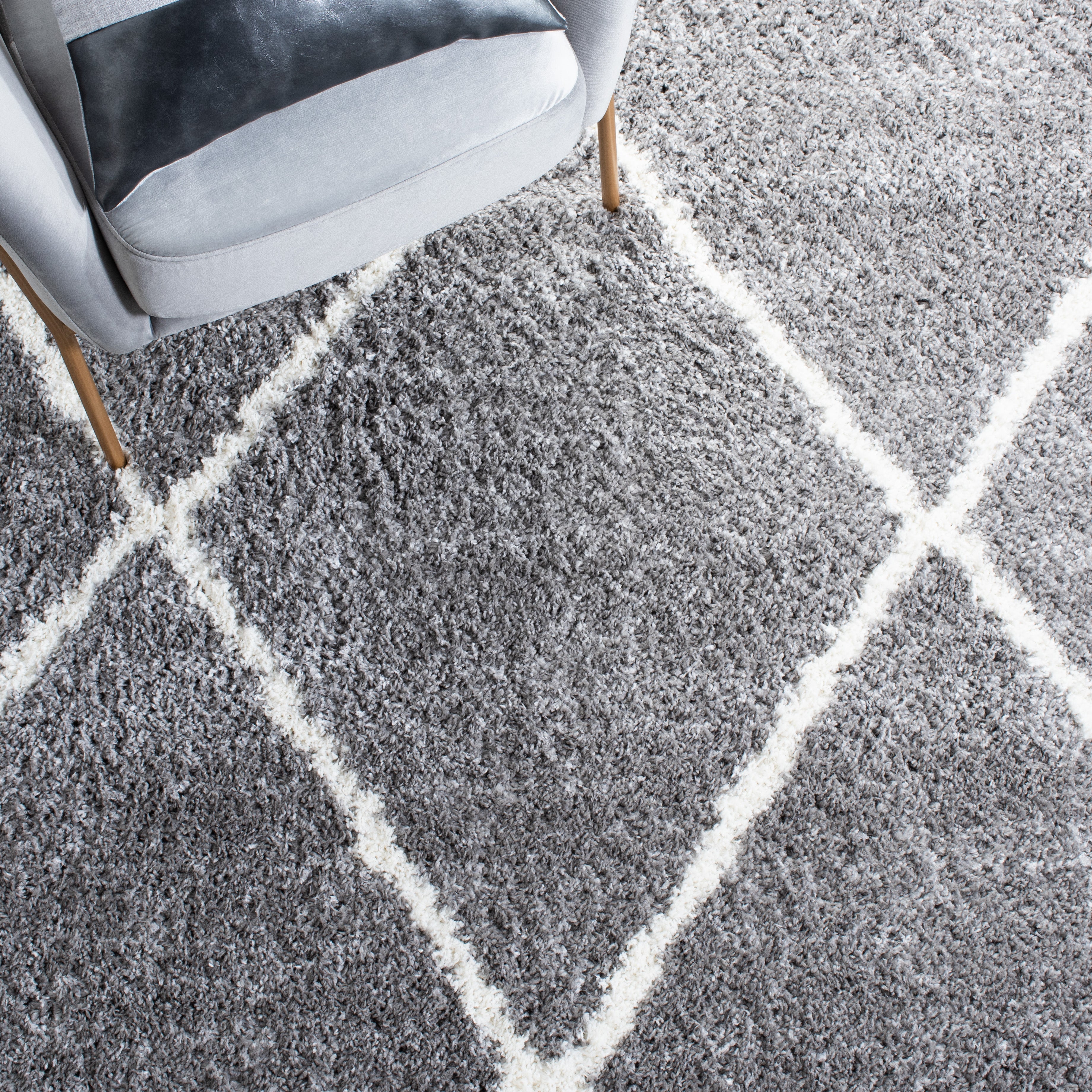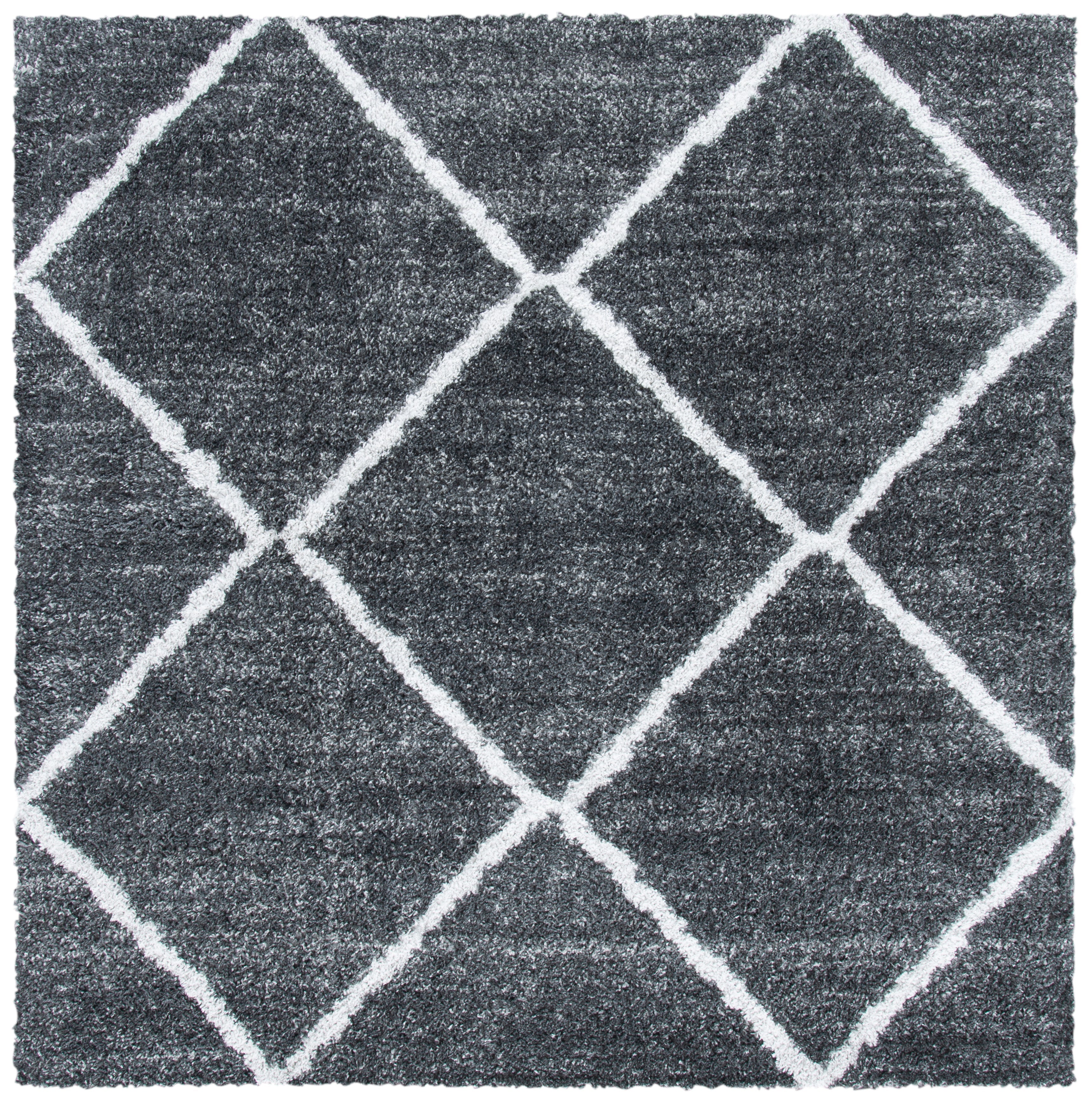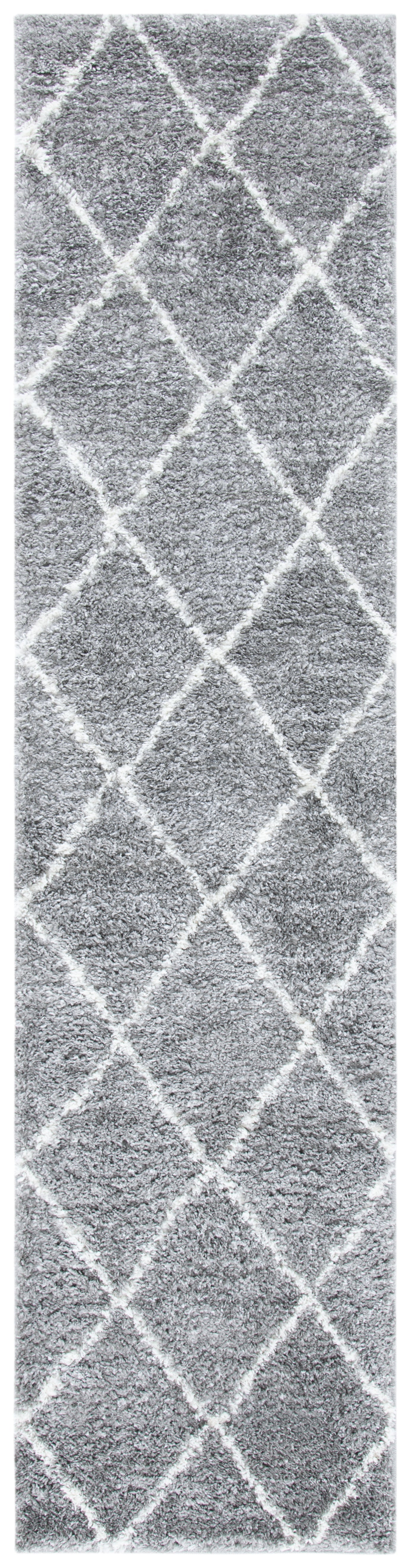 The rug's color palette is a serene harmony of GREY and IVORY, lending itself to a tranquil and sophisticated atmosphere that complements any decor. Its design features a timelessly chic diamond pattern that radiates a sense of calm sophistication in your space while providing a gentle contrast.