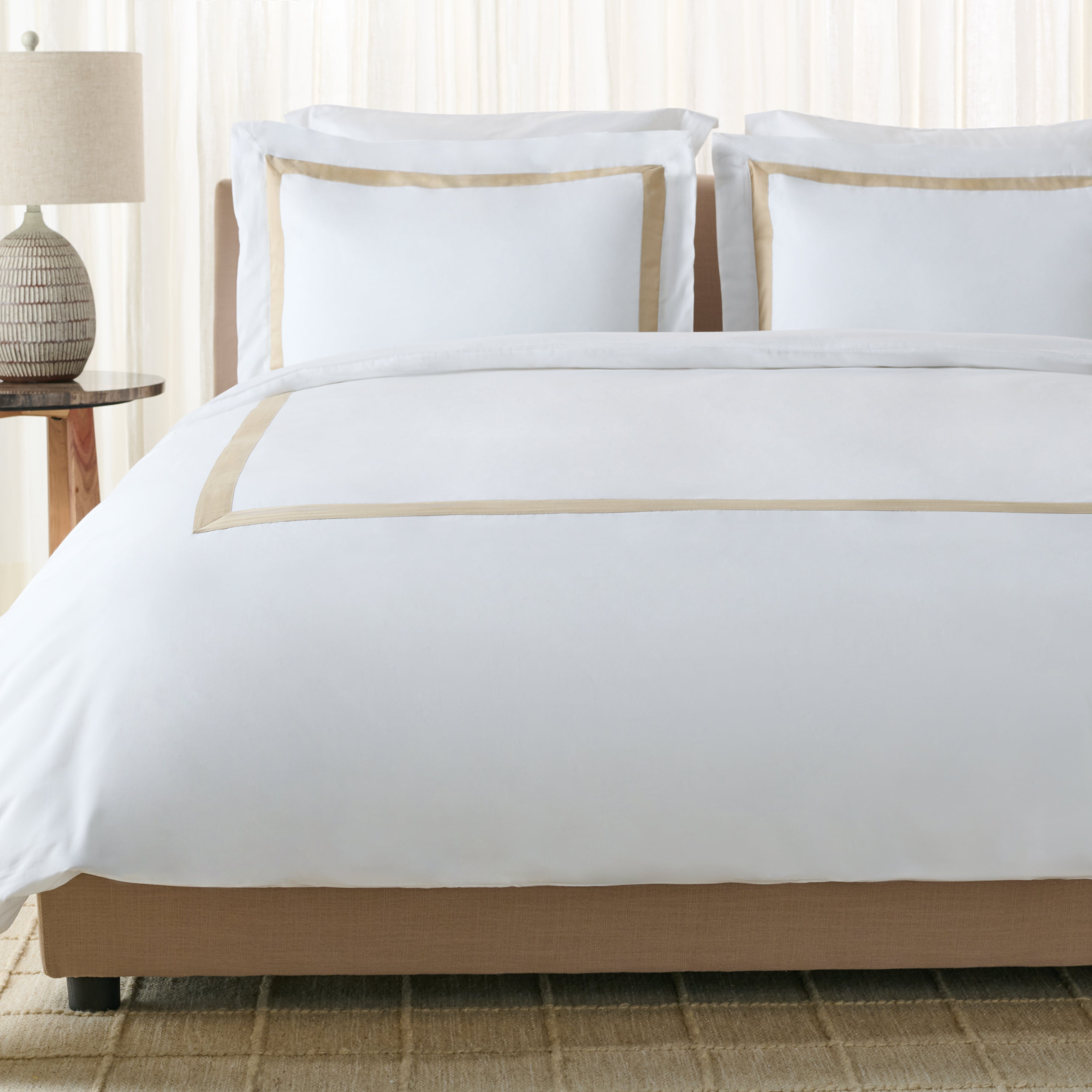 A soft fabric border frames the clean base, creating a warm yet tailored look that adds subtle elegance to any space. This understated contrast brings a refined, contemporary touch while preserving a fresh, minimalist aesthetic.