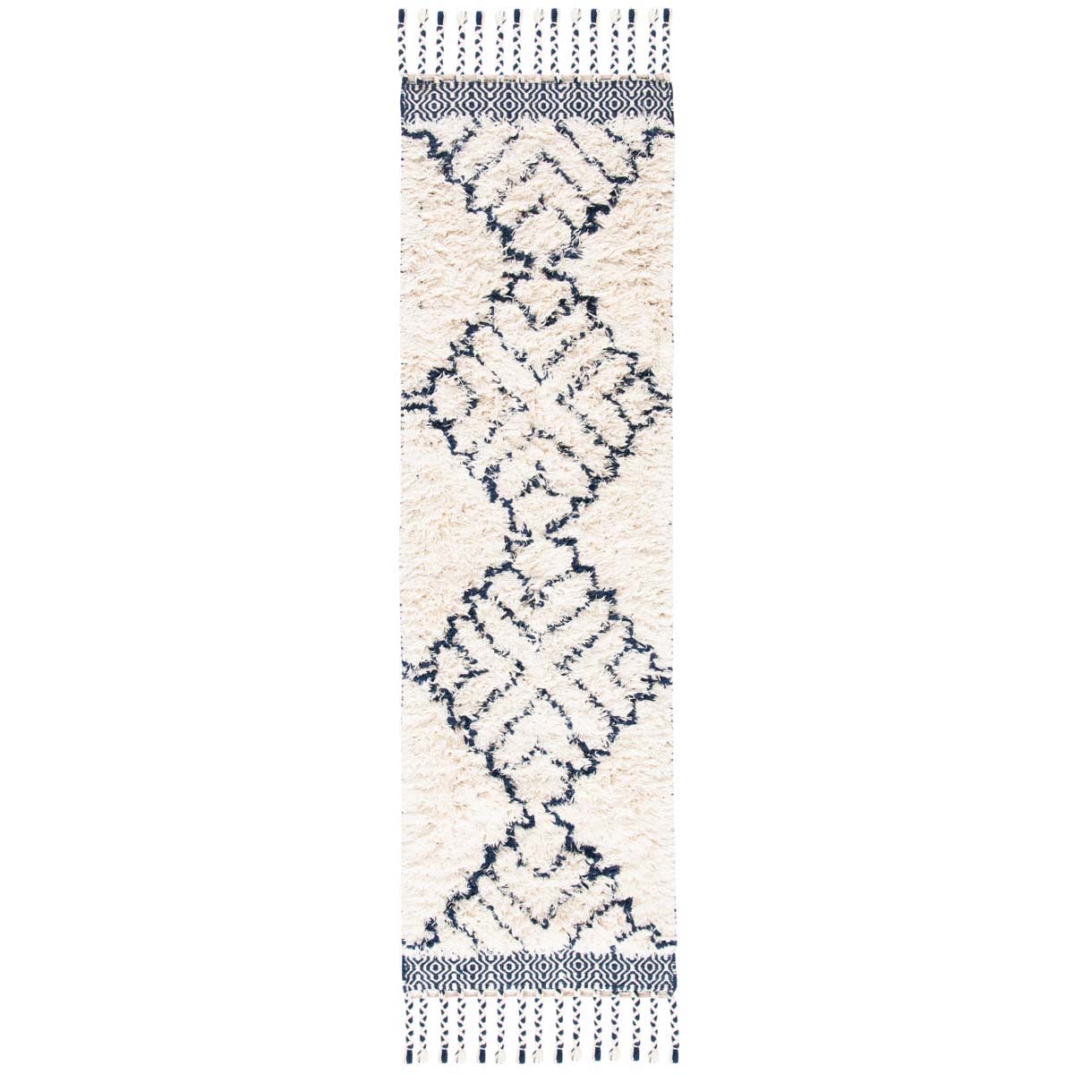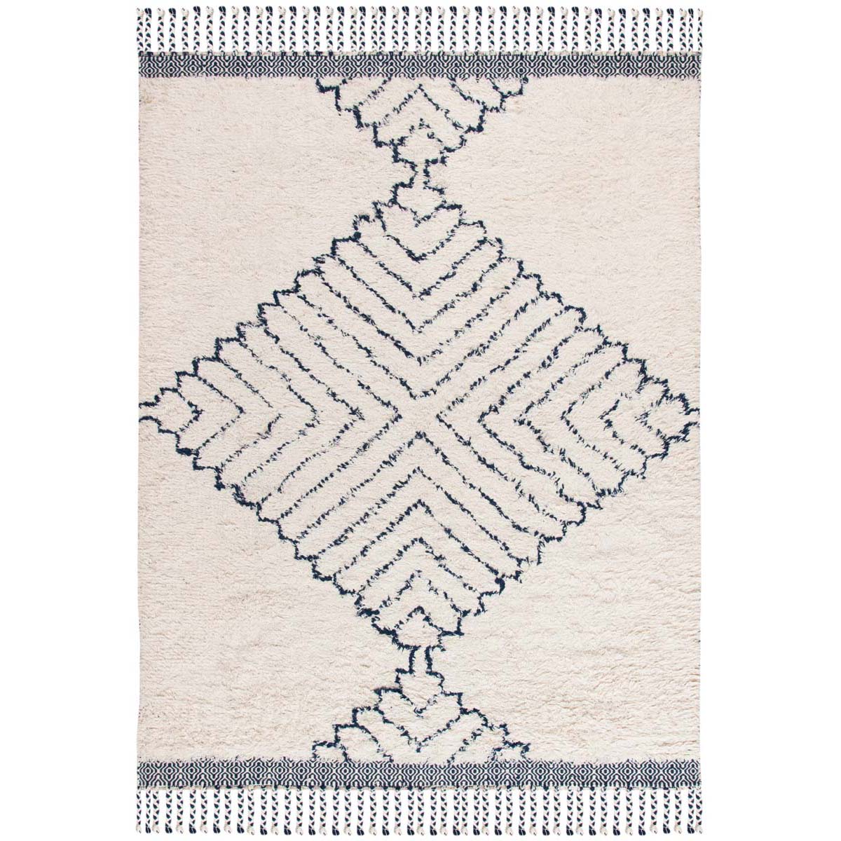 The rug showcases an inviting ivory base, gracefully contrasted with navy accents that bring the intricate Bohemian patterns to life. The detailed imagery weaving through the rug displays a central symmetrical diamond motif, flanked by complementing geometric elements that capture the essence of Bohemian elegance.