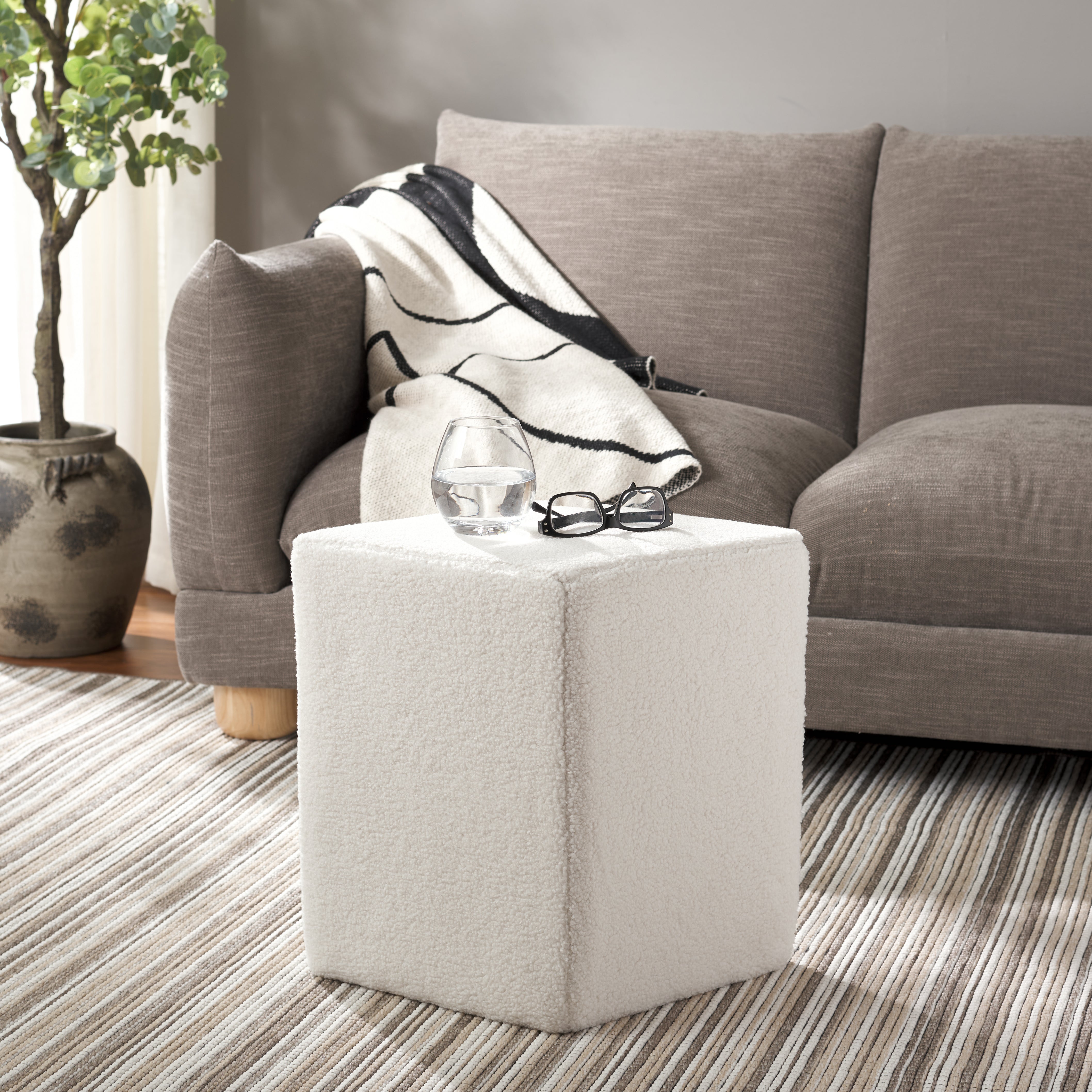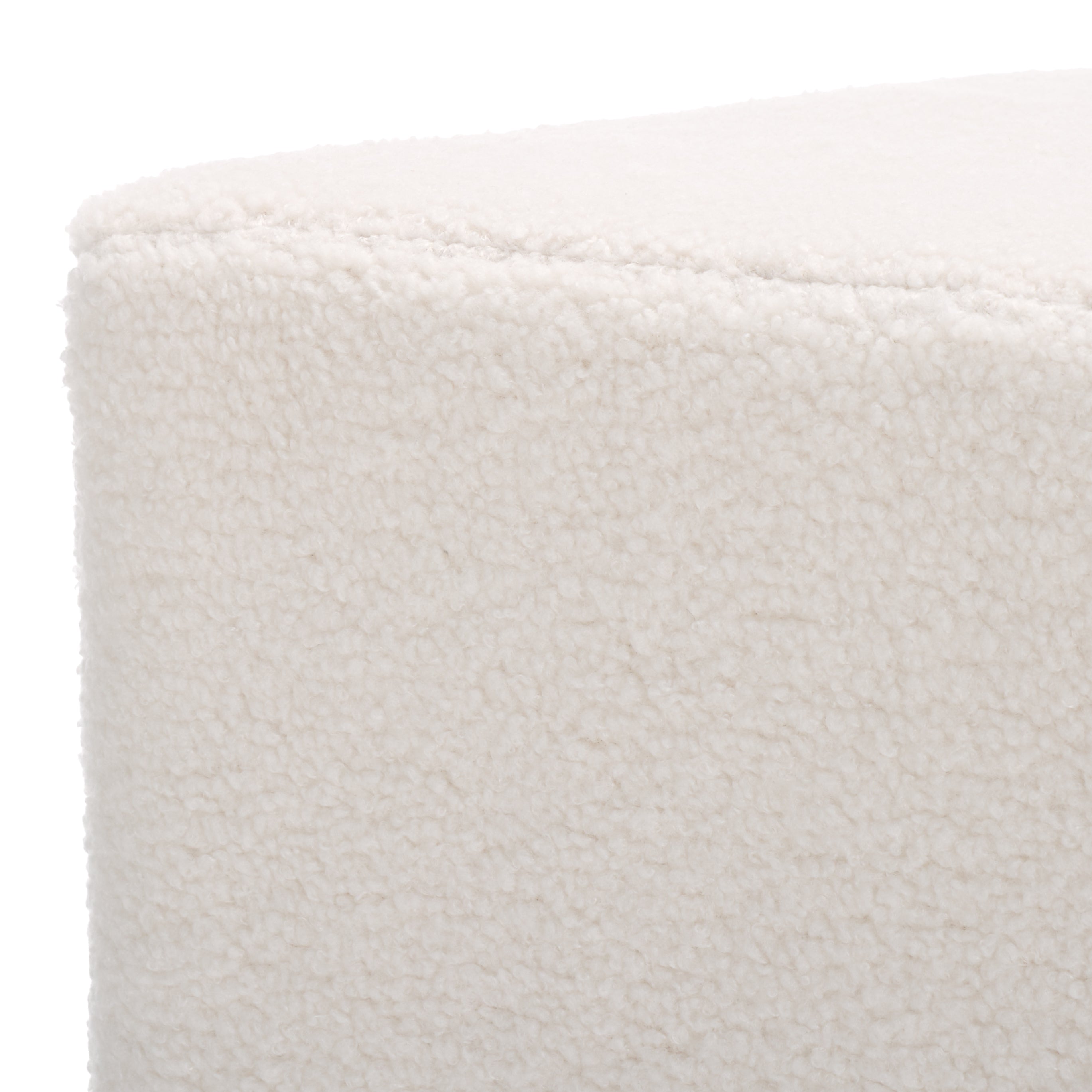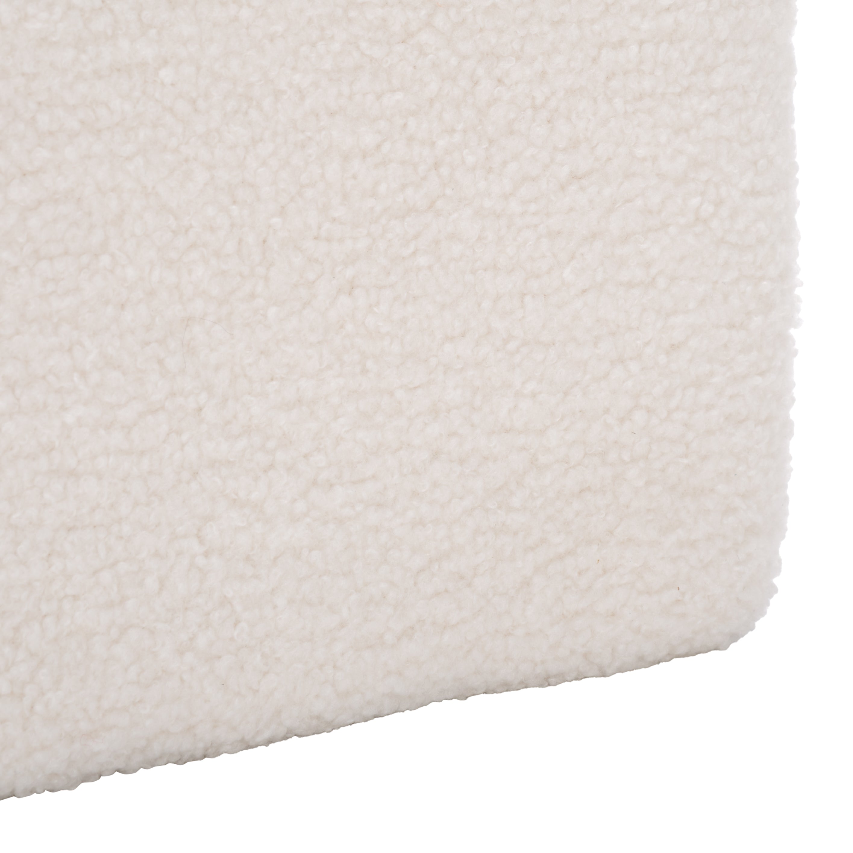 Embrace a chic and cozy accent with our Cierra diamond-shaped ottoman. The angular edges and unique diamond shape add a dose of drama to our fully upholstered ottoman. It is covered in soft-to-touch and richly textured sherpa fabric to amp up the cozy factor of your home. The ottoman adorns a graceful ivory hue to serve as a playful and versatile addition to your living space, bedroom, or nursery. It can be used as a footrest, a handy side table, or an extra seat in any corner of your home.