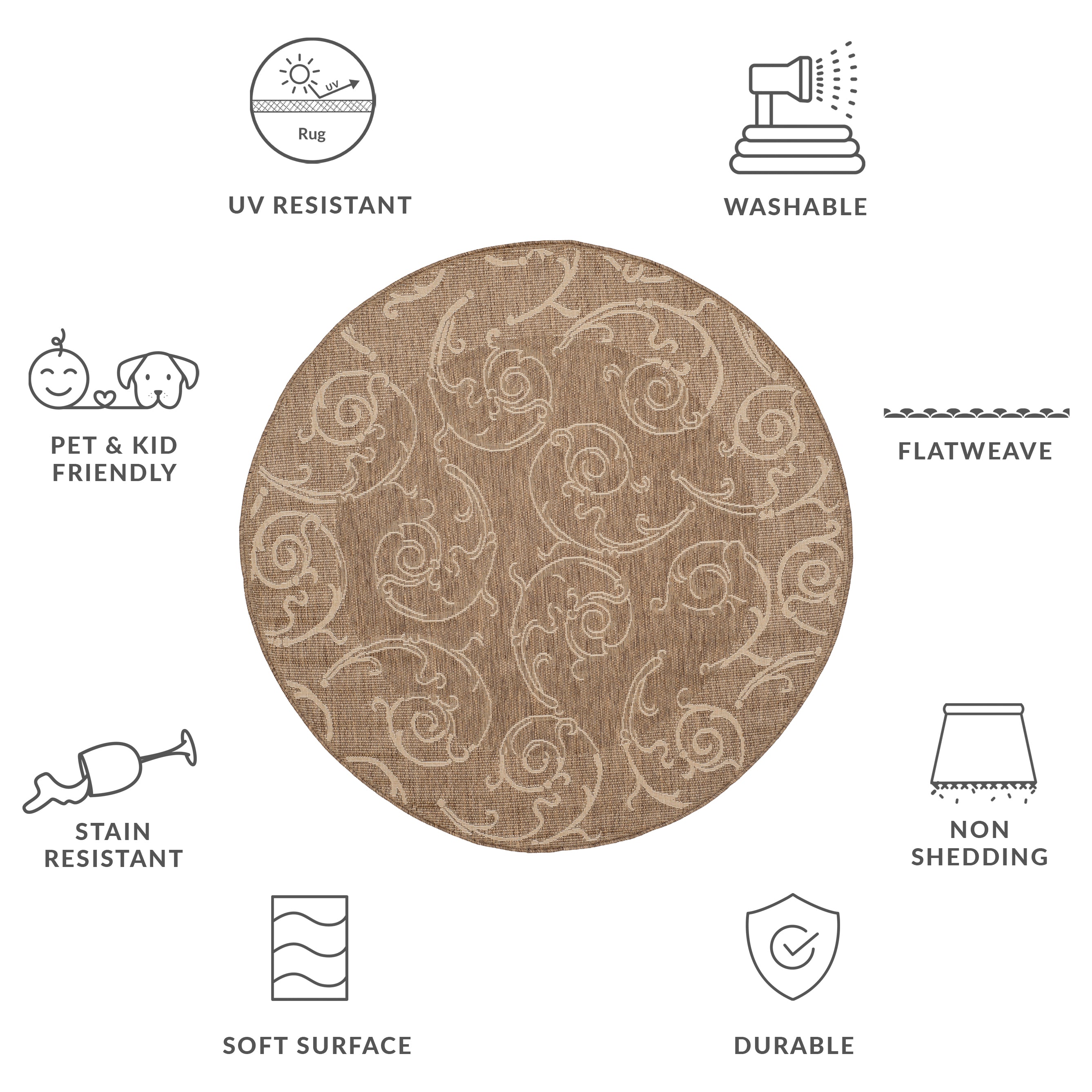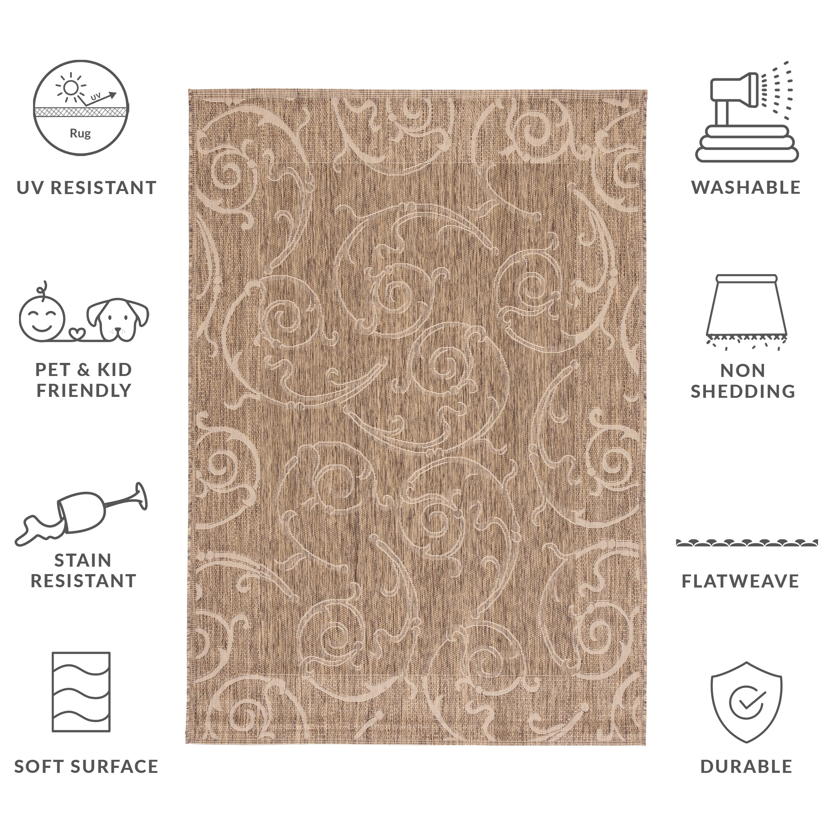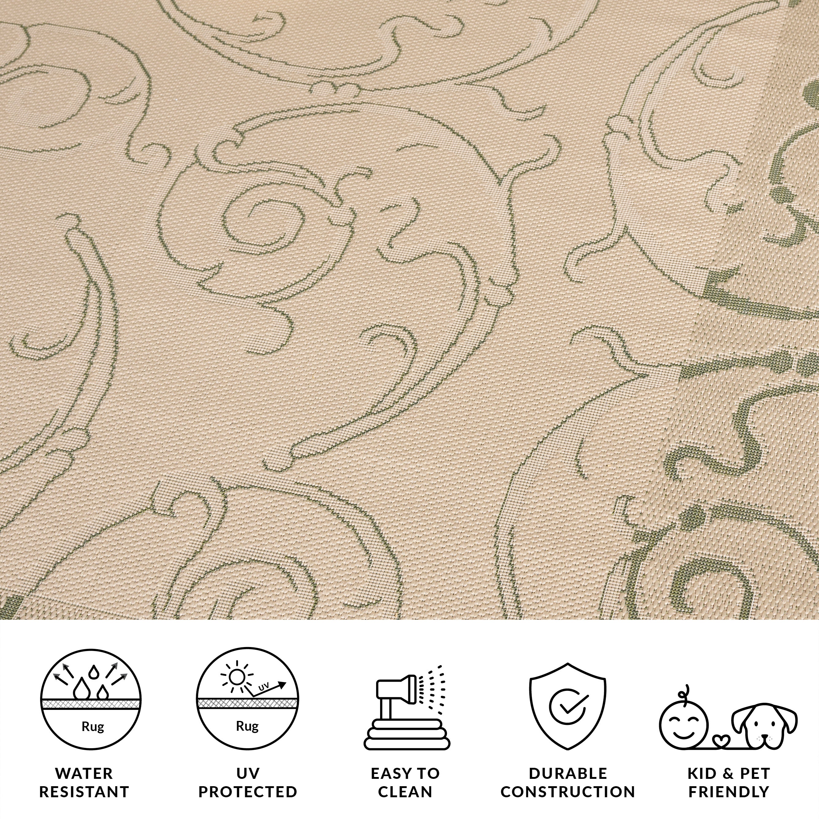 Constructed utilizing advanced Power Loomed technology, this area rug boasts a resilient composition of 88% Polypropylene and 12% Polyester, materials chosen for their long-lasting durability and easy maintenance. The intricate rug pattern displayed in the image showcases timeless swirl motifs that add a touch of sophistication and artistry to the design.