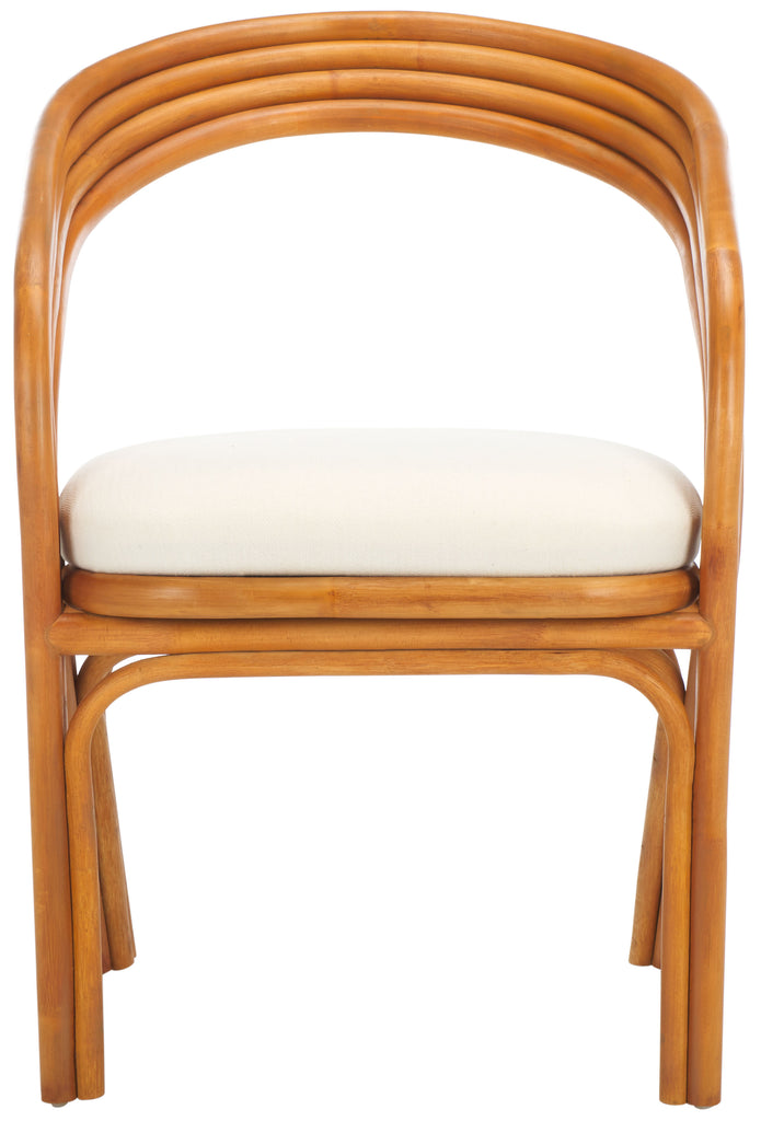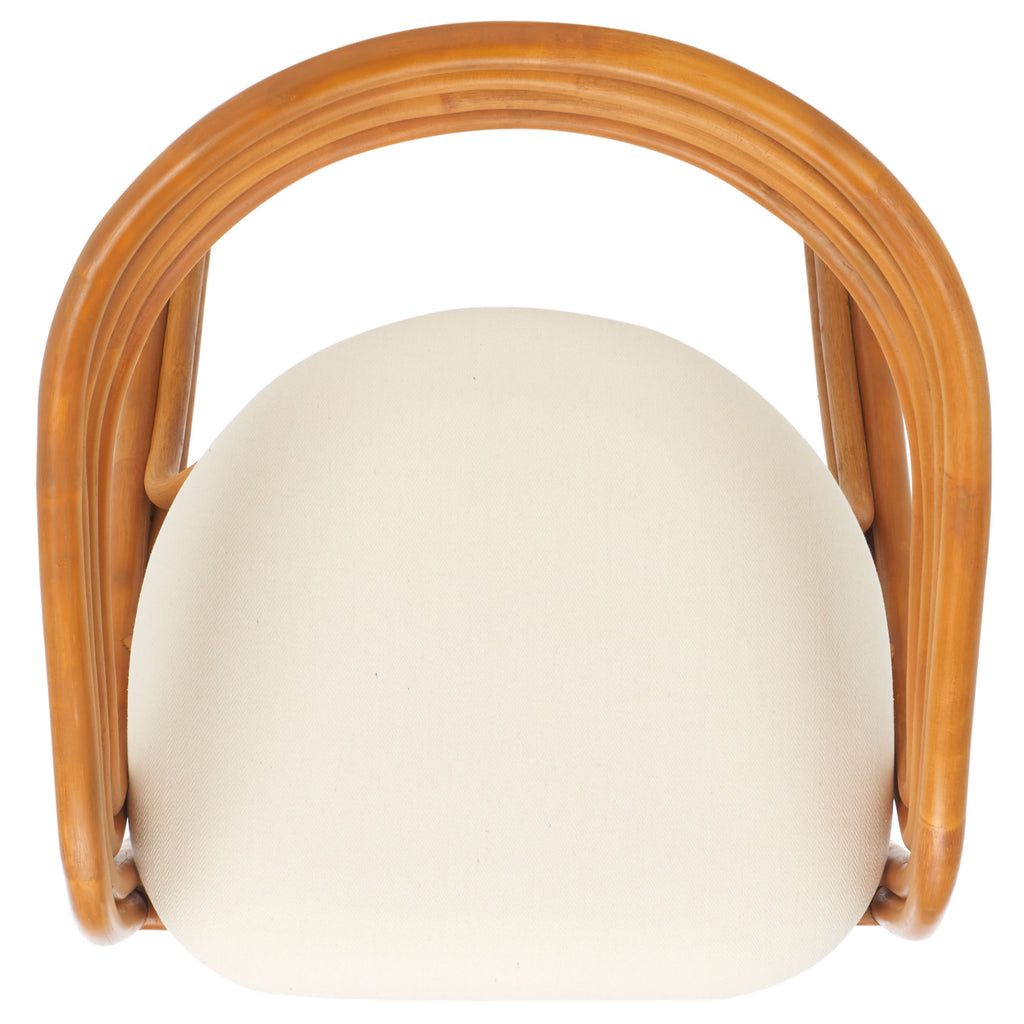 Elevate your dining space with the inviting drama and elegance of our Jennabrook dining chair. Meticulously crafted from rattan, the dining chair strikes a stylishly casual air. A curved back and seamlessly flowing arms and legs lend sculptural poise to the chair. Its minimalistic and streamlined back supports you in just the right places. Our dining chair includes a padded, white linen seat for added comfort. It beautifully showcases the natural warmth of rattan to add a dose of charm and visual interest to your kitchen, dining room, and living space.