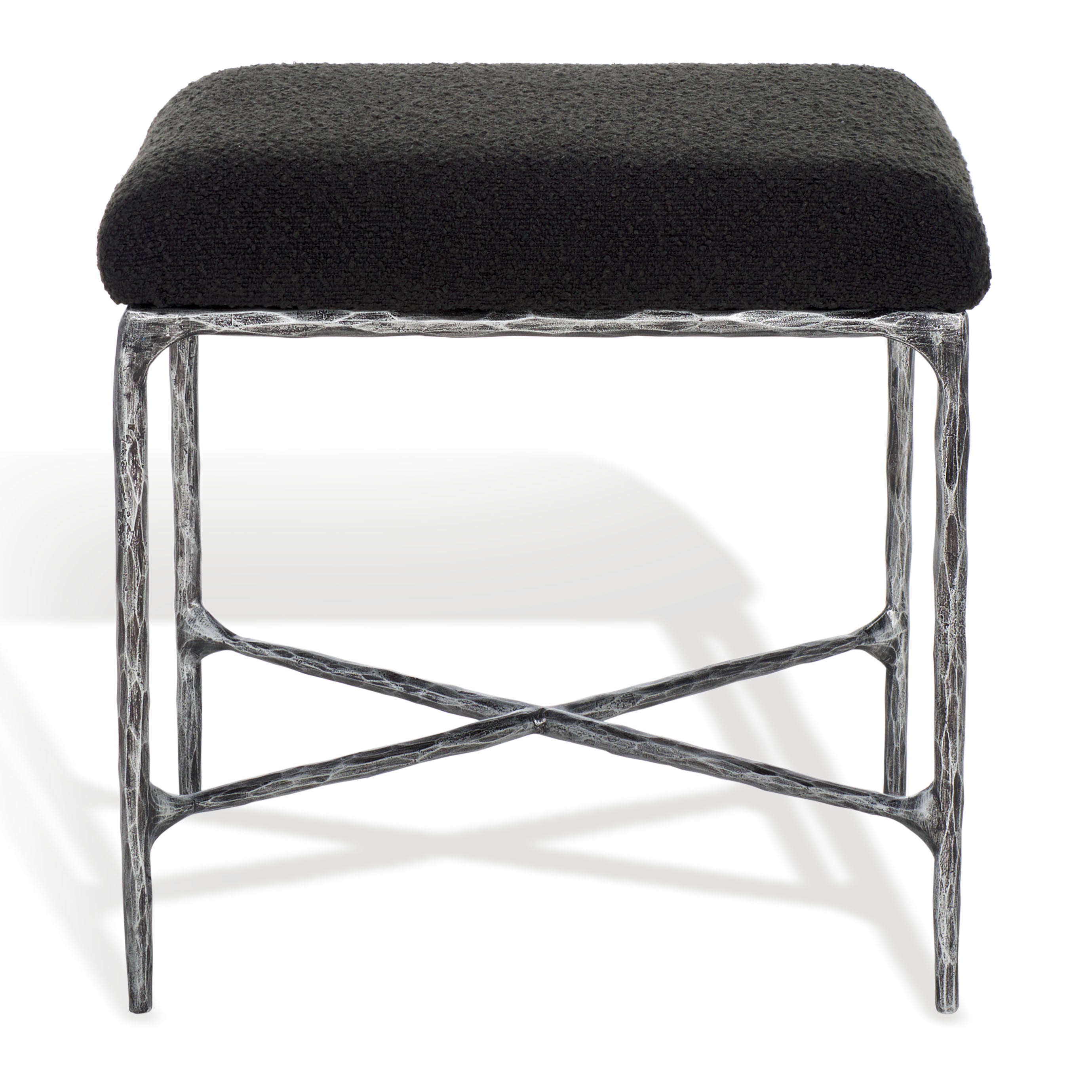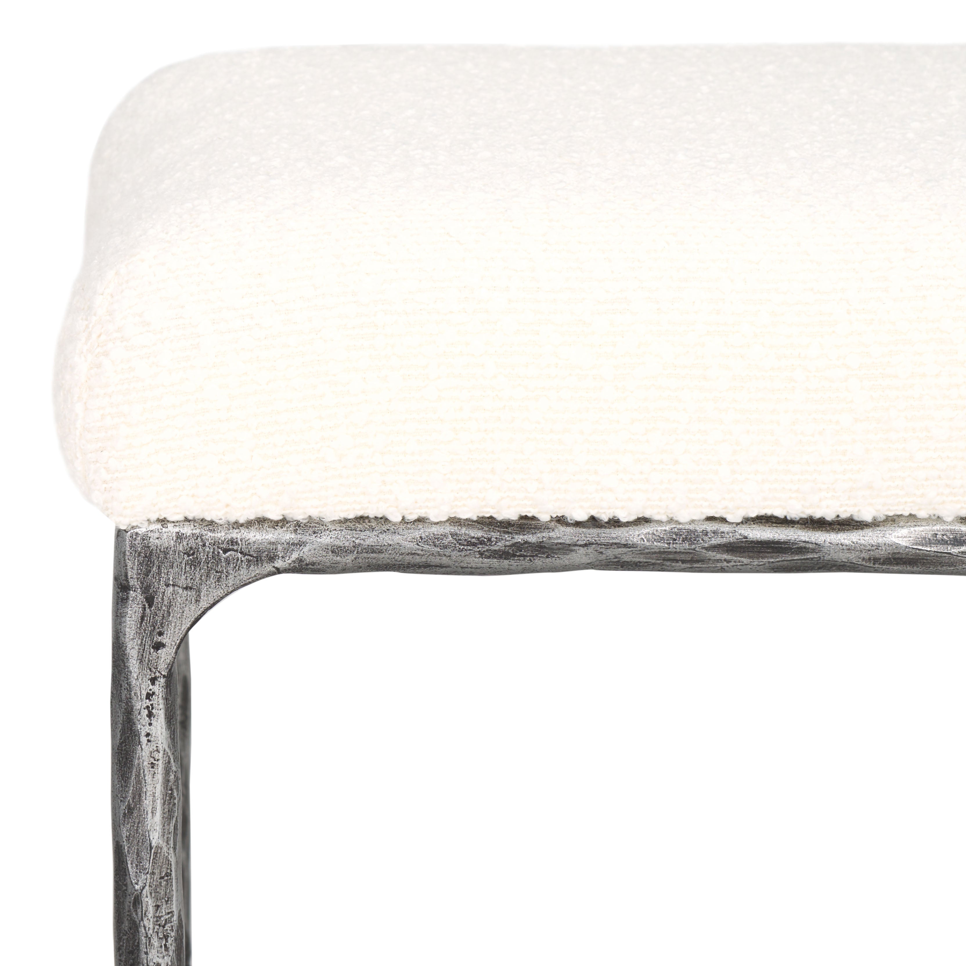 Elevate your space with the sleek style and convenience of our Mandy ottoman. Refined to perfection, our ottoman blends fine materials to serve as a stylish and effortless fit to any room. Its rectangular seat is upholstered in soft boucle for an inviting touch of textures. Featuring slender black metallic legs, our ottoman embraces a minimalist profile to easily blend into any room. It can serve as a comfy footstool, extra seat, or handy surface to hold trays during cocktail hours and family gatherings.