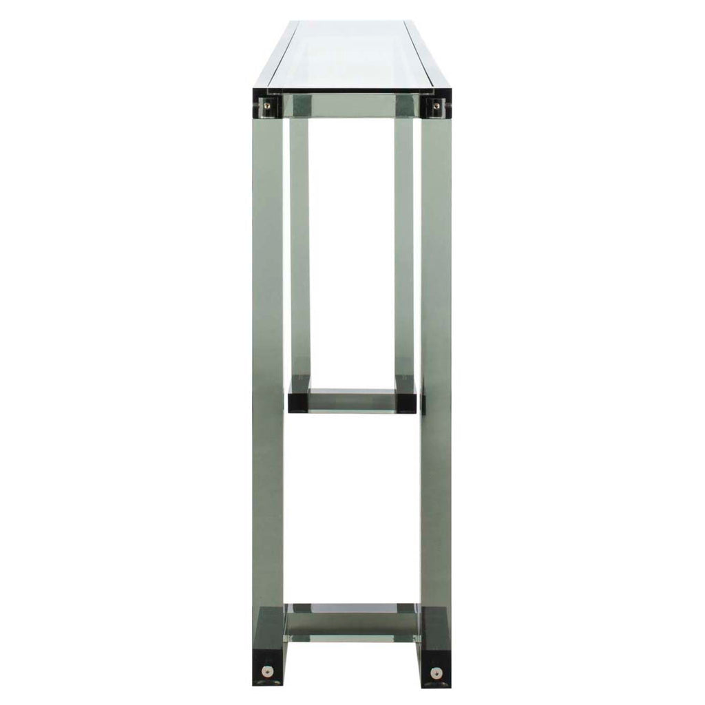 This contemporary acrylic console brings elegance and style to any room. Designed to create a light, sophisticated surface behind a sofa or in any hall, its glass top maintains a clean look while the updated Greek key design on its legs adds classic charm.