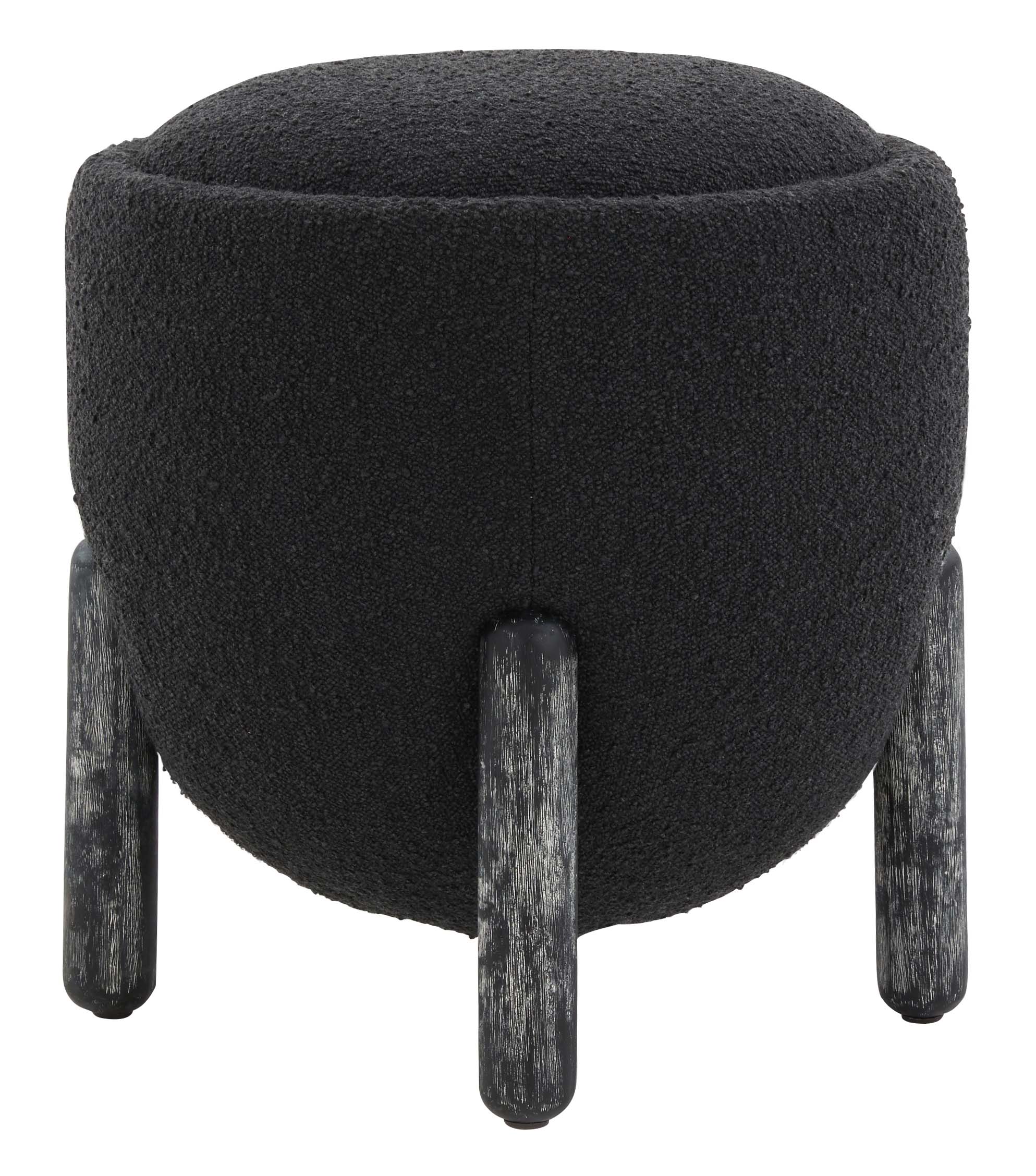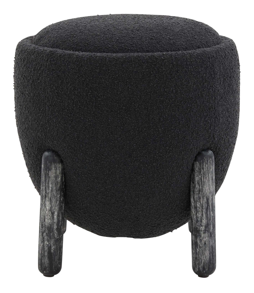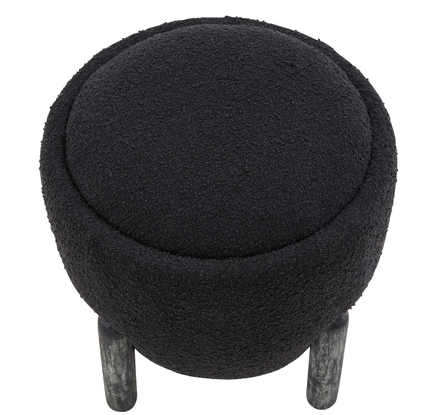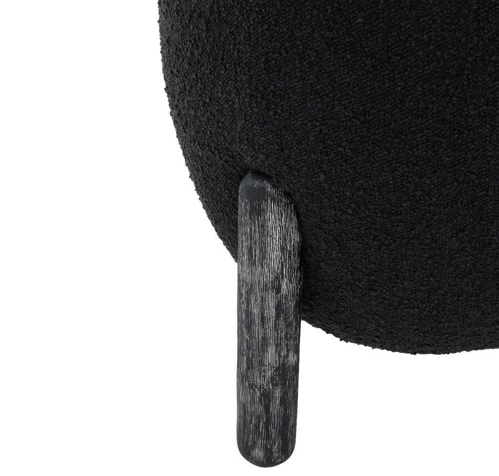 Enrich your home with the warmth, style, and convenience of our Clarabella ottoman. The slim and sleek round seat beautifully curves at the bottom to attain a sculptural silhouette. The seat is hooked between cylindrical legs each curved on the top and bottom to serve as an elegant detail. The black-finished Oak legs perfectly complement the boucle seat adorned in a classy black shade. Sleek and stylish, our ottoman brings ultimate convenience by serving as a footrest, or as an extra space to serve and seat guests.