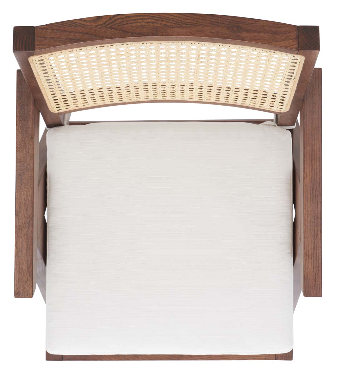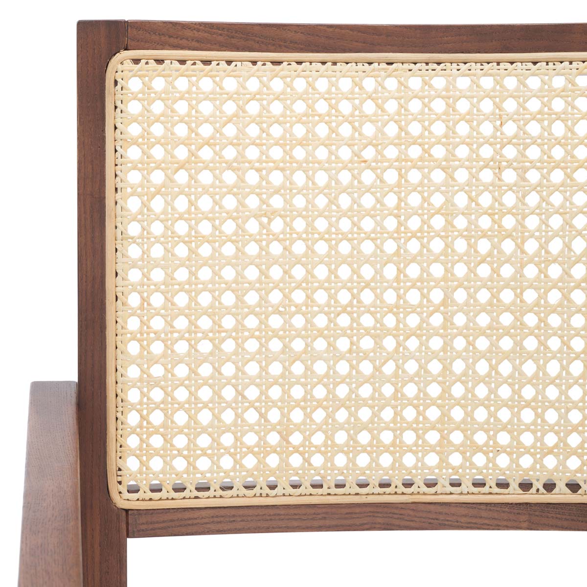 Create a cozy and inviting spot to relax with our Colette armchair. Our sleek and clean-lined armchair receives a relaxed upgrade with rattan mesh upon the back. Expertly crafted with solid ash wood, the armchair is elevated with a walnut finish. It features a generously padded white boxy cushion to deliver supreme comfort. Featuring sleek arms, our light and airy armchair is the perfect spot to relax and unwind.