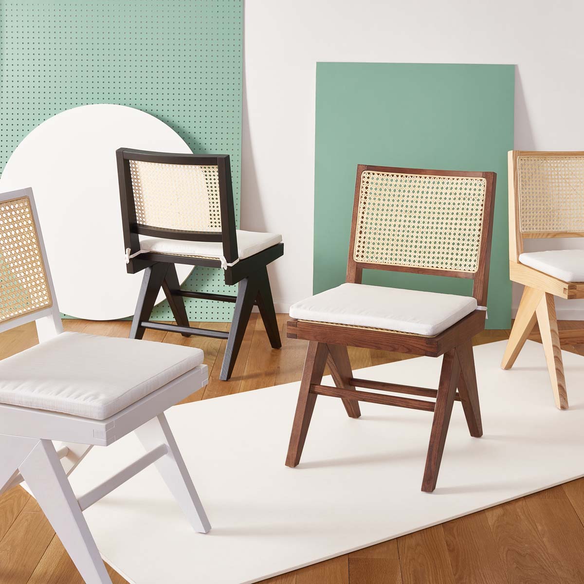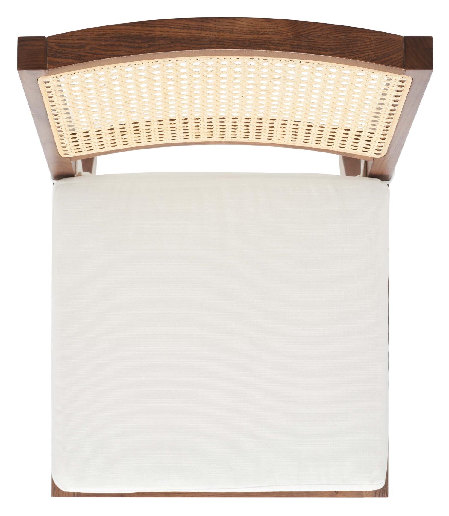 Give a refreshing and breezy update to your dining area with our Colette dining chair. Our sleek and clean-lined chair receives a relaxed upgrade with rattan mesh upon the back. Expertly crafted with solid ash wood, the chair is elevated with a modern walnut finish. It features a generously padded white boxy cushion to deliver supreme comfort. Light, airy, and refined, the dining chair serves as a welcoming addition to both your casual and formal dining area.