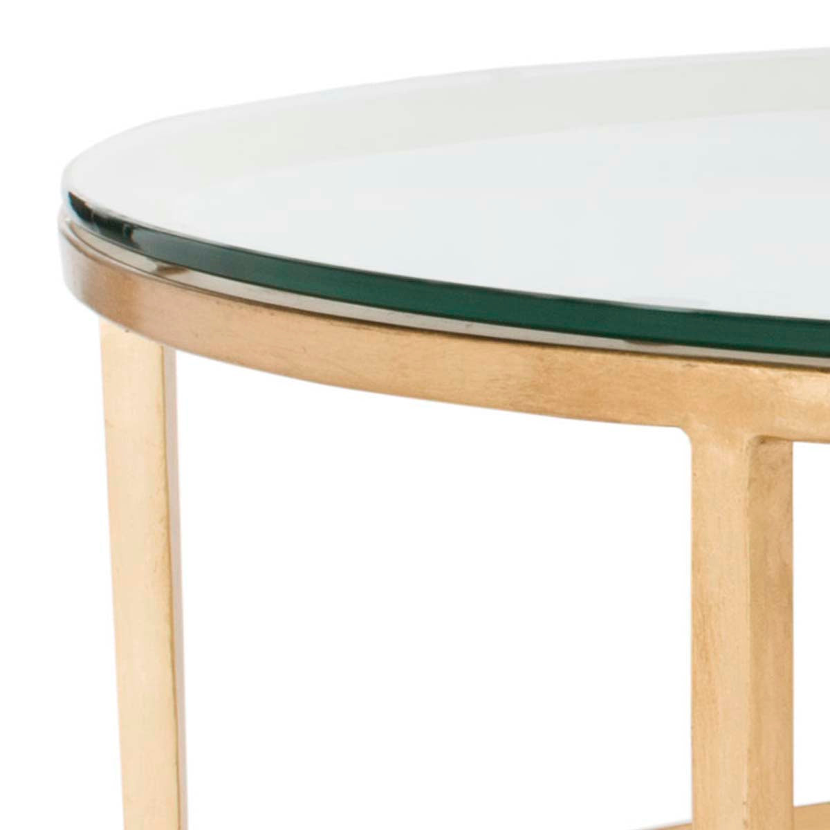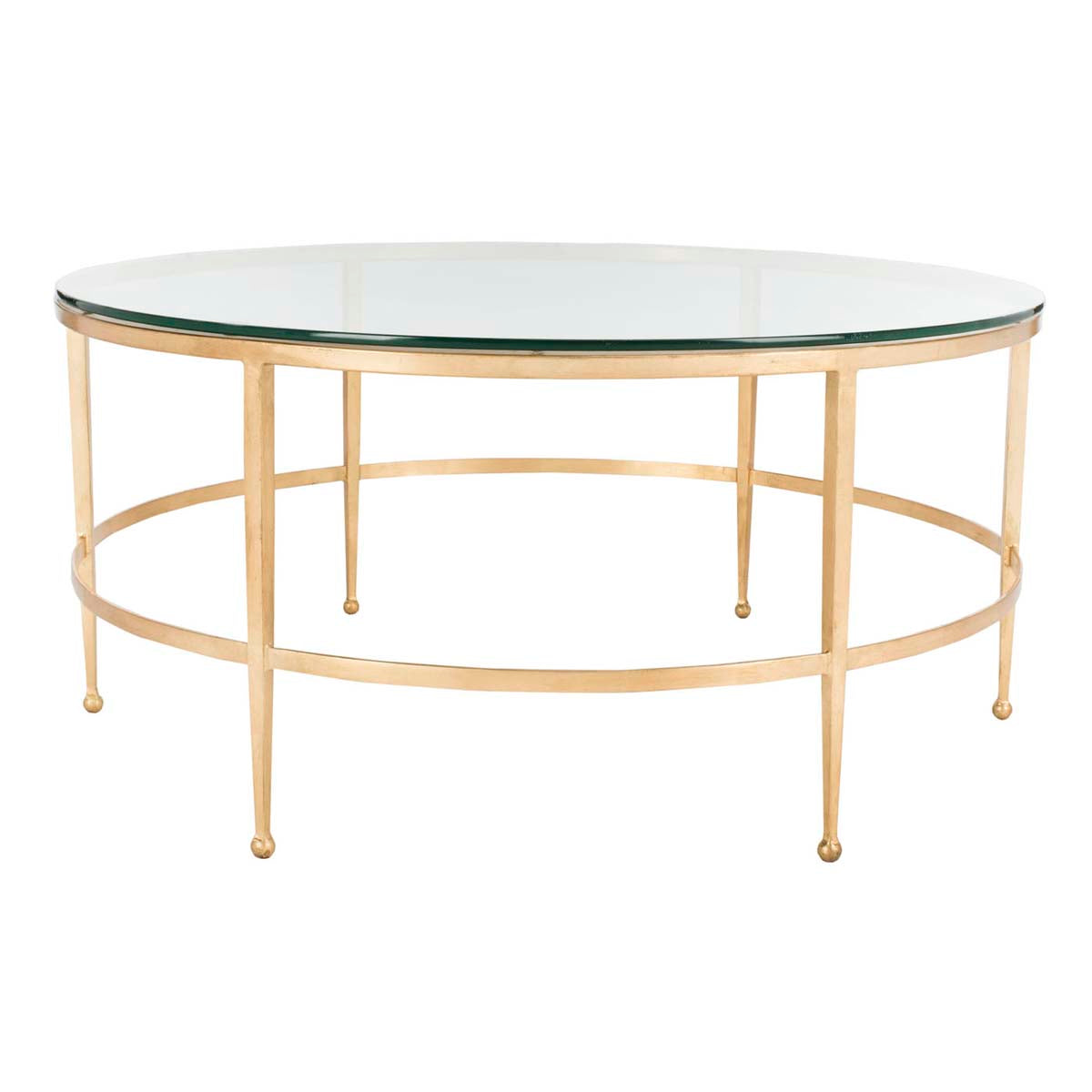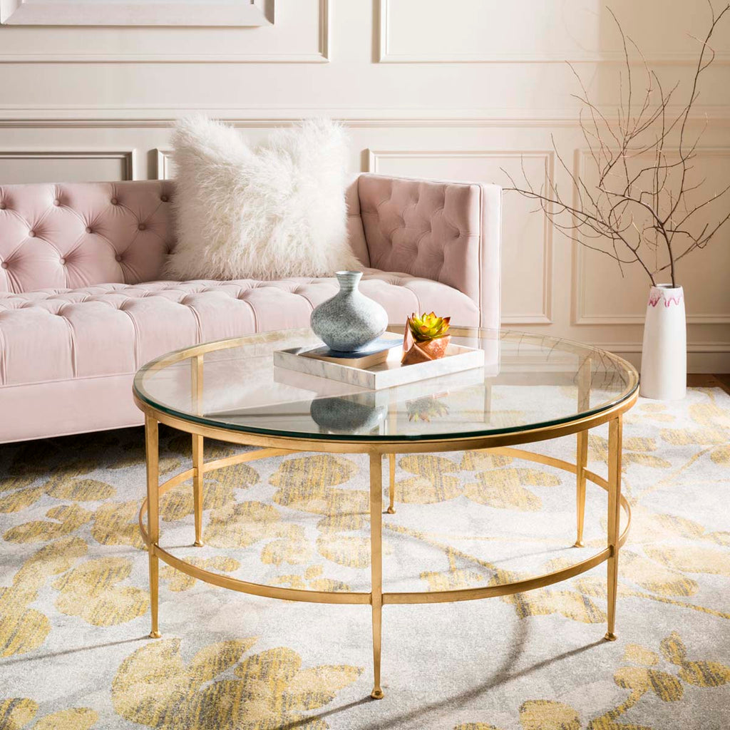 Divinely sophisticated in its understated elegance, this Edmund Cocktail Table is the perfect piece to balance any living room. The antique gold gilt finish on Edmund's open circular frame adds a glimmering touch to surrounding decor, and a clear glass top enhances its airy appeal.