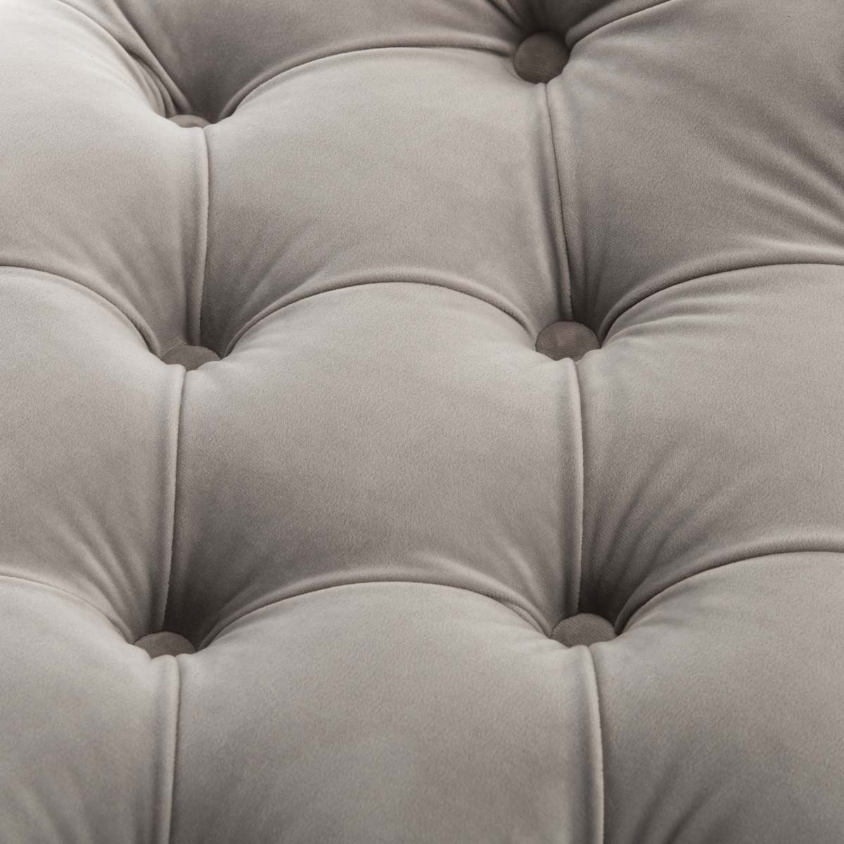 Dramatic and decadent, few can resist the charm of this contemporary tufted velvet acrylic bench. Ideal for the modern living room, its fine craftsmanship highlights the sinuous curves of its sumptuous pale taupe upholstery and deluxe radiant gold finish.
