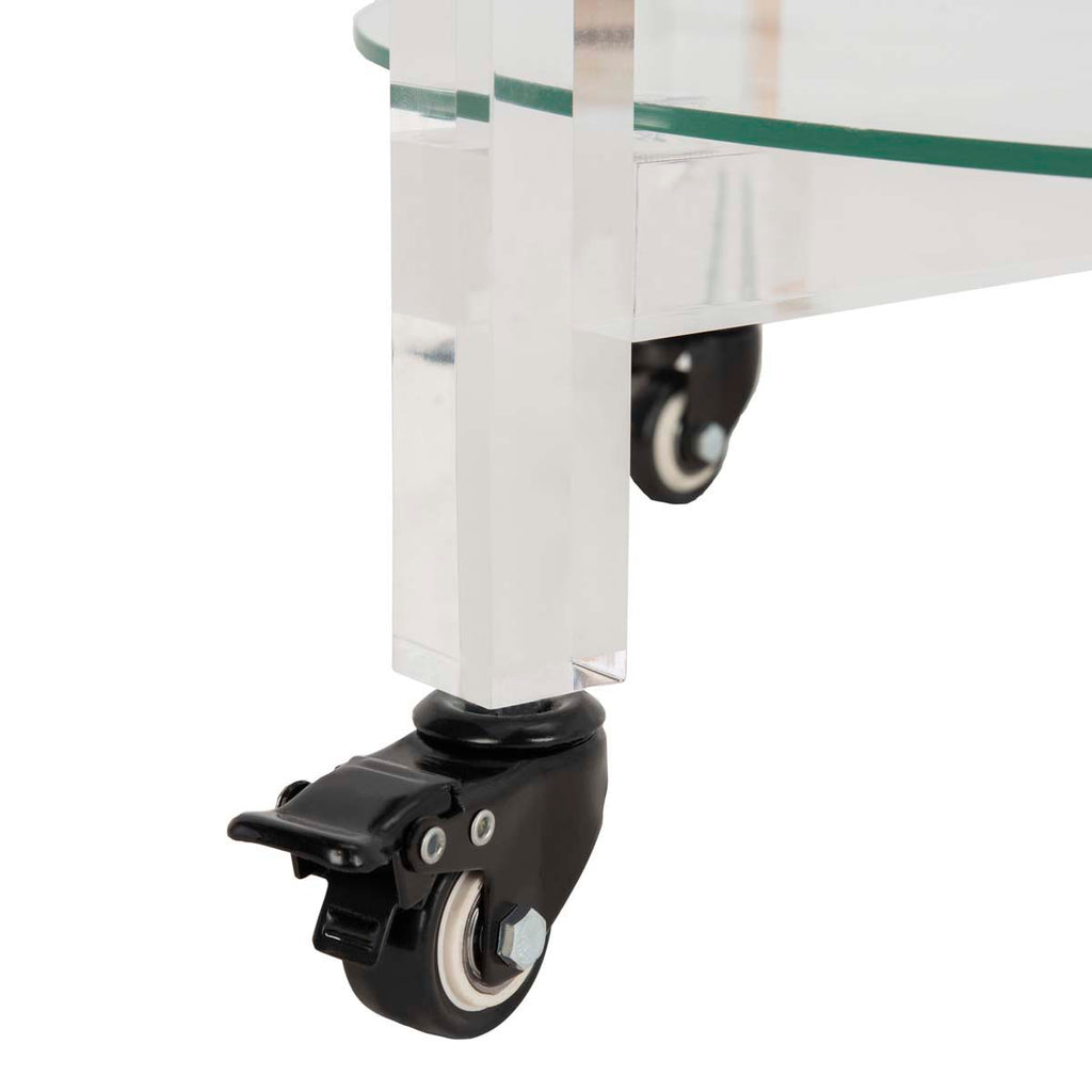 Designed for the gracious host, this Jules Bar Cart blends into any décor. Jules two clear glass tiers and acrylic frame are ideal for displaying glassware, canapes, or favorite ingredients for a classic martini. Shaken, not stirred.