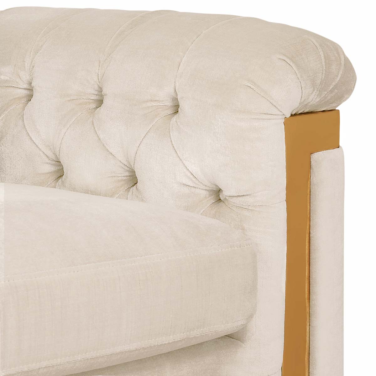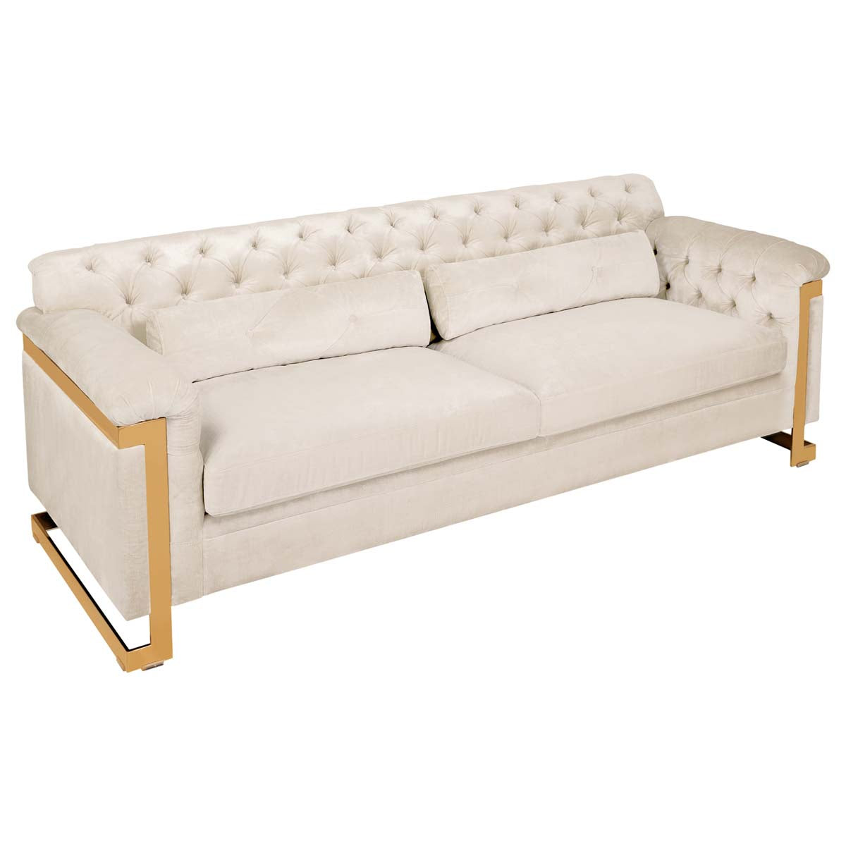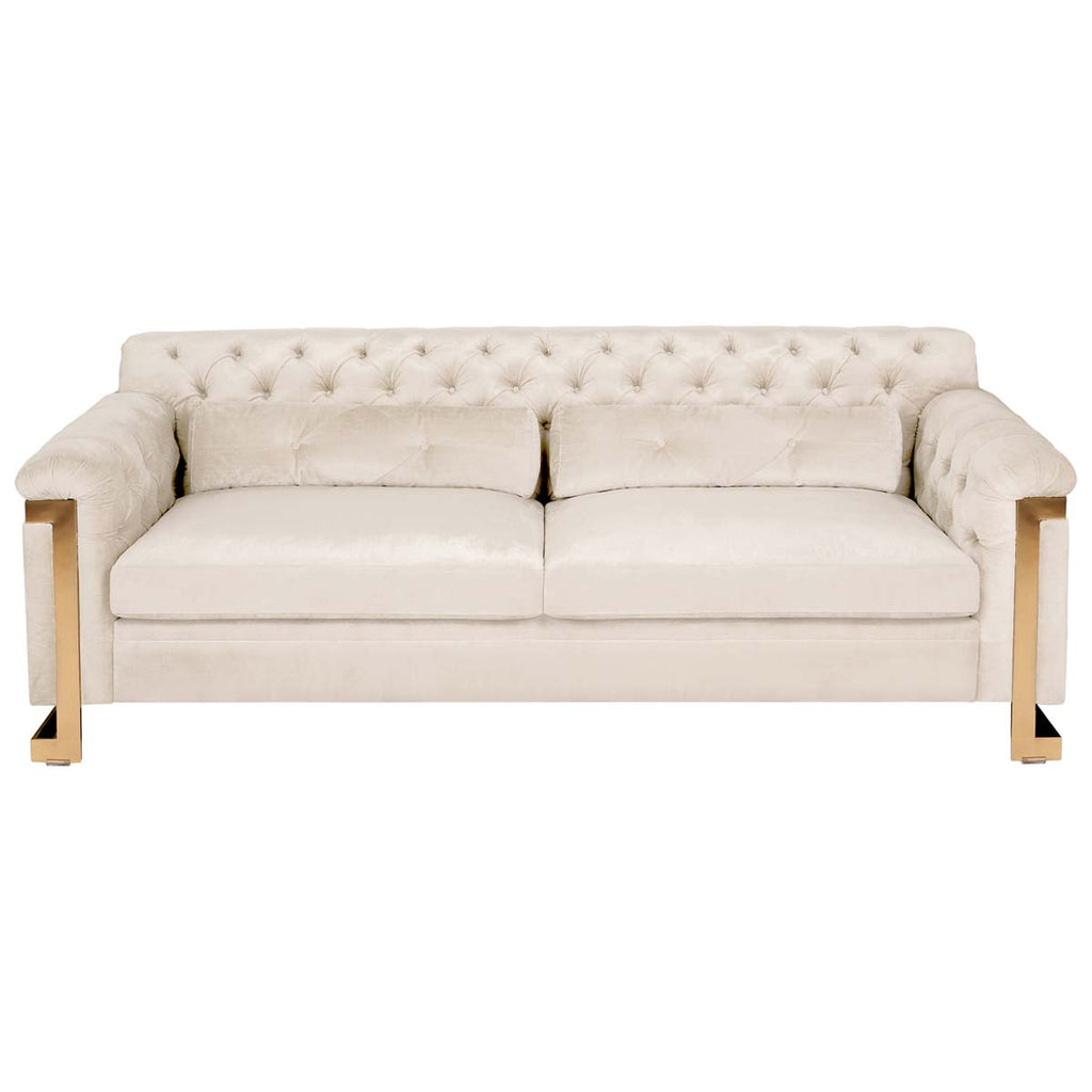 The Lethbridge sofa pairs the charm of the Chesterfield style with the clean lines of Bauhaus design. Masterfully upholstered with lush white velvet, plush cushions and bolsters, this button quilted sofa stands on gold finished stainless steel legs.