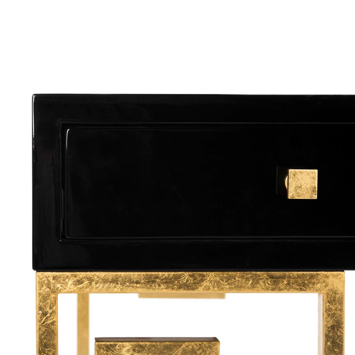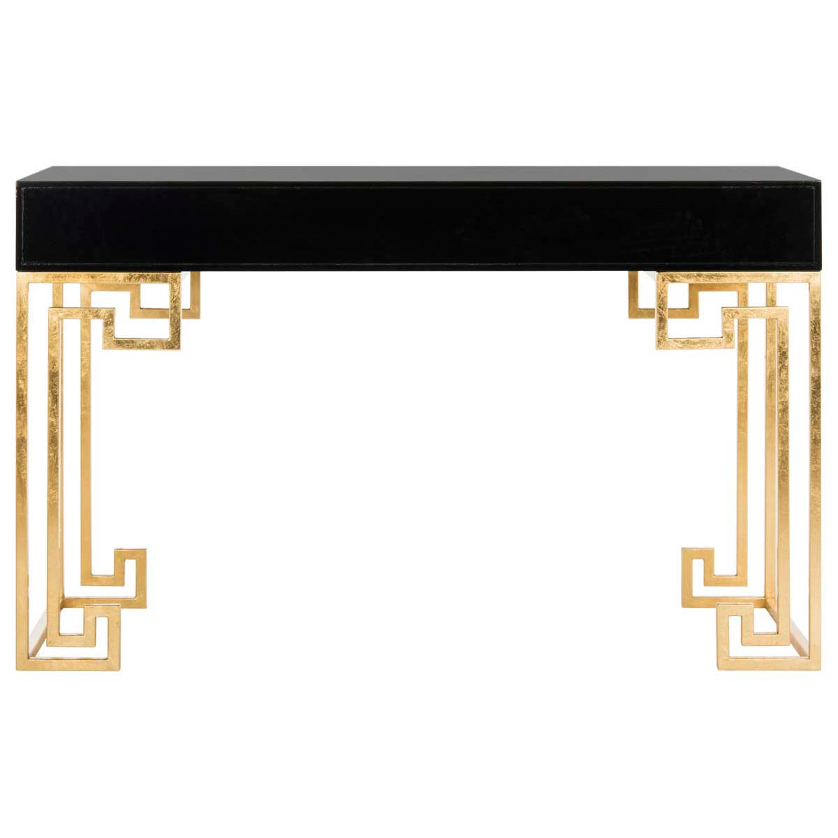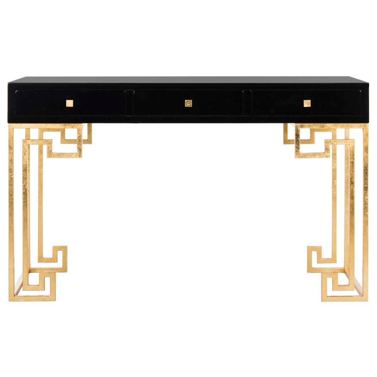 Inspired by the desk of Paris' top designer, the Valeria Lacquer Writing Desk is a modern heirloom. Its black lacquer surface and gold leaf details blend into any modern office, living room or bedroom. Three drawers ensure accessories remain discreet.