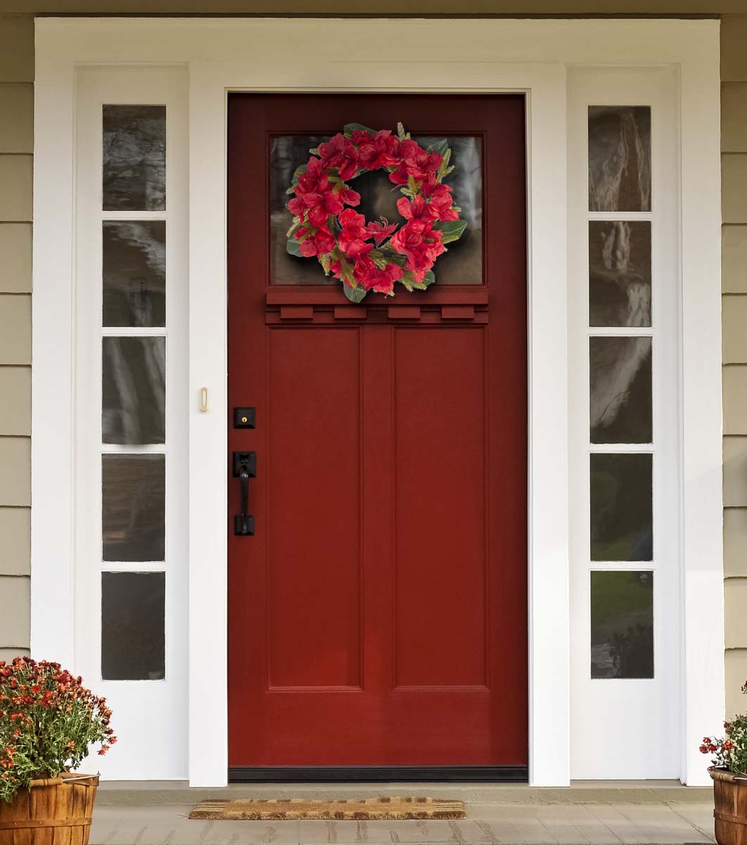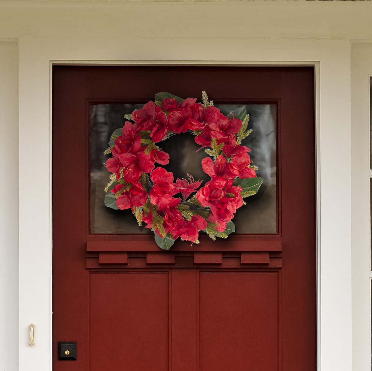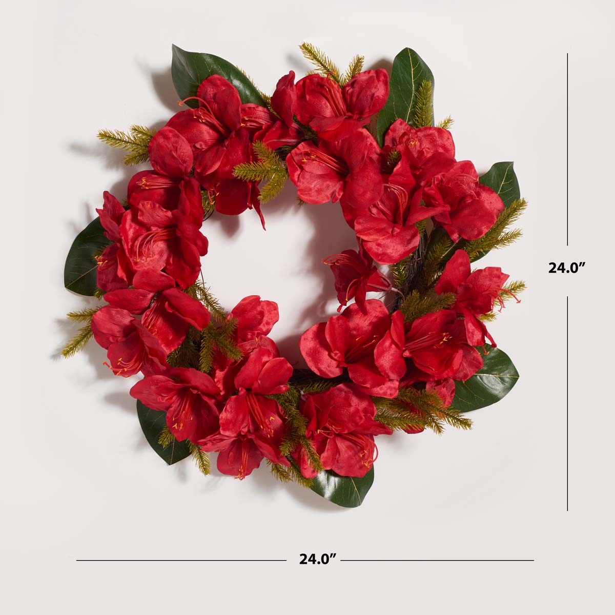 Add a lively splash of color to your festive decor with our faux amaryllis and a magnolia leaf wreath. Our holiday wreath stands out with the rich red crimson color of faux amaryllis blooms. It is complemented with deep-green magnolia leaves to bring striking organic beauty to your home. Each texture and detail is realistically rendered to keep the amaryllis flowers blooming through the winter season and beyond. It serves as an effortless and vibrant centerpiece for your doors, mantelpiece, and dining table.