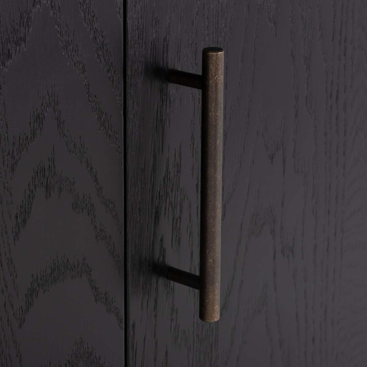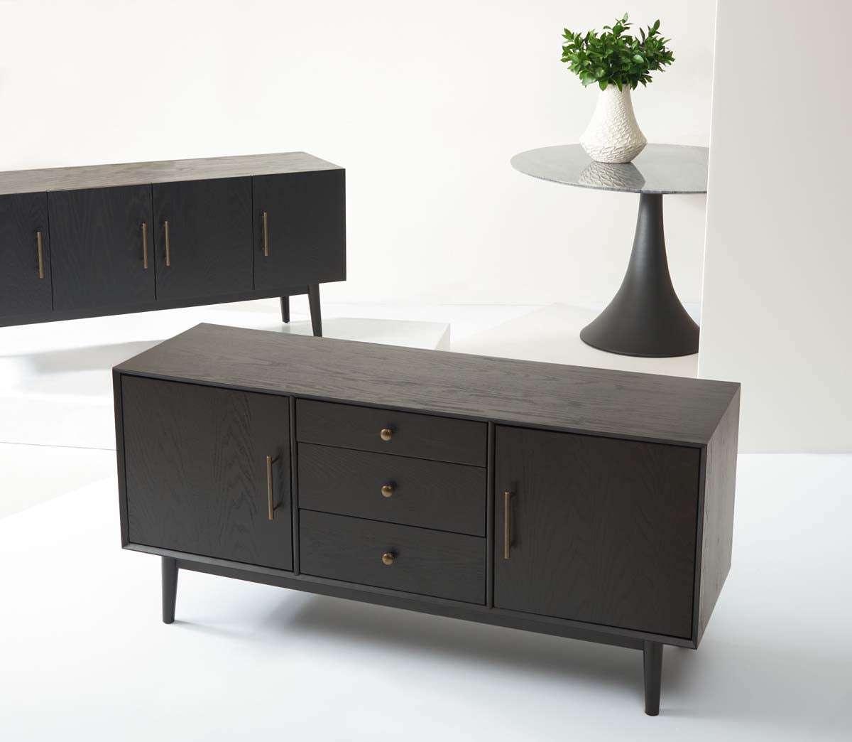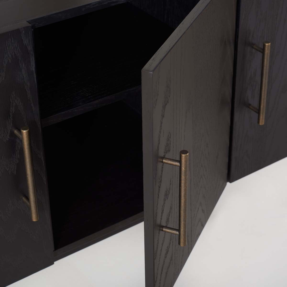 Retro is all the rage, and nothing exemplifies this more than the Doderick Media Stand. At once Mid-Century and modern, Doderick's flowing wood grain is highlighted by a rich oak veneer and sleek black finish, while classic splayed legs complete the look. Four doors provide ample storage in any entertainment space.