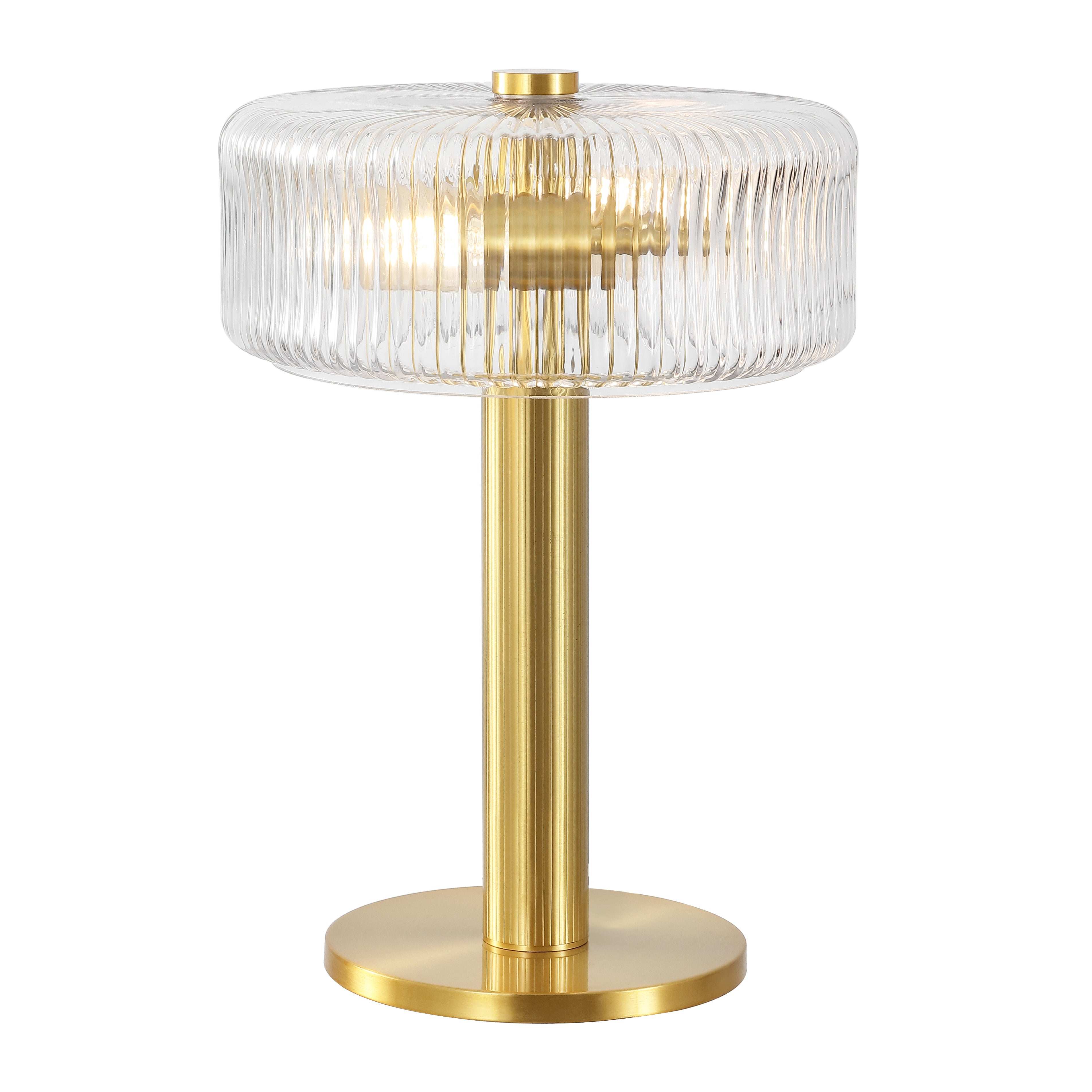 Illuminate your space with the DUA 17 inch clear brass table lamp, a perfect blend of elegance and modern design. This lamp features a striking combination of sleek metal and a graceful glass shade, creating a statement piece that complements any decor. The clear and brass tones add a touch of sophistication, making it a versatile addition to your bedroom, study, or living area.