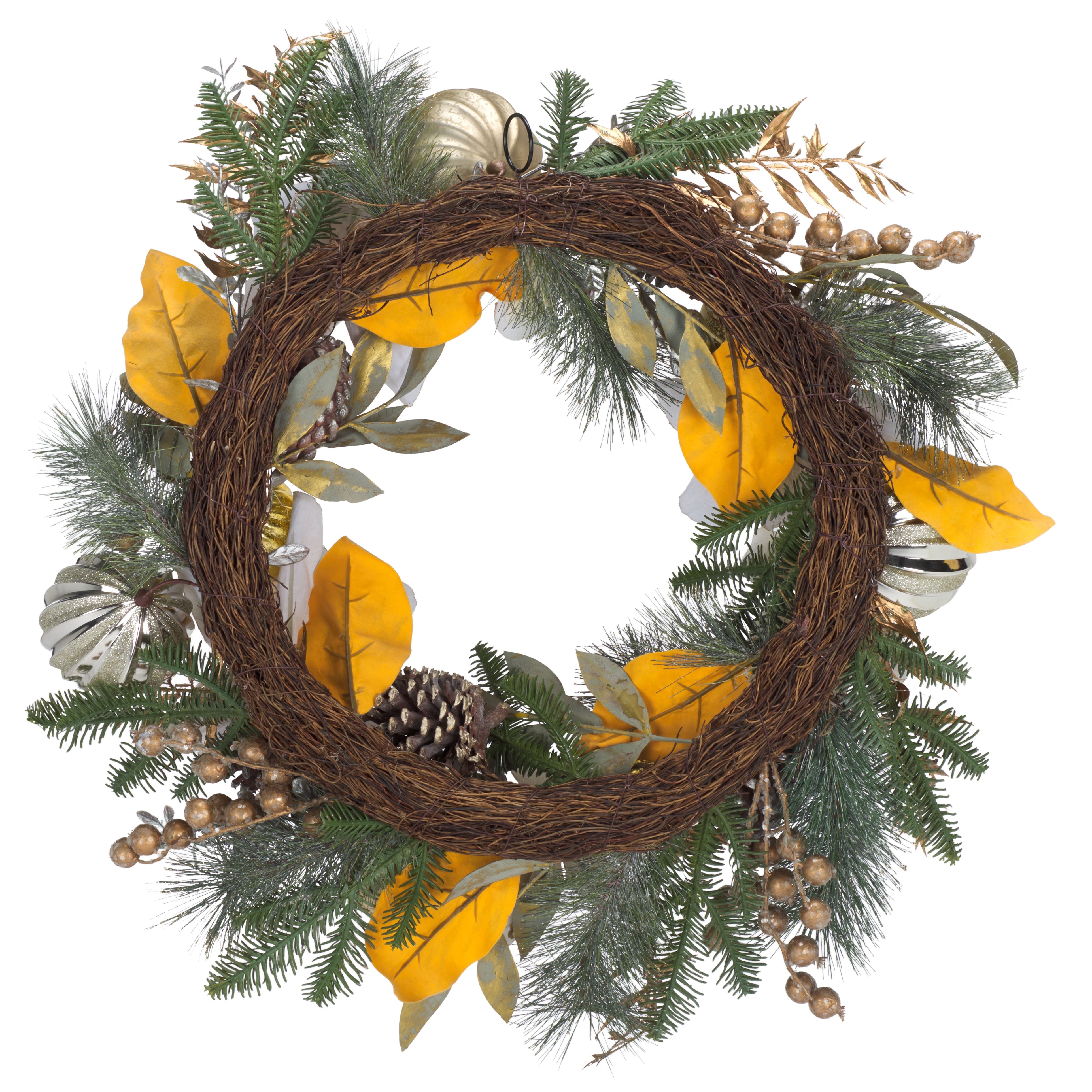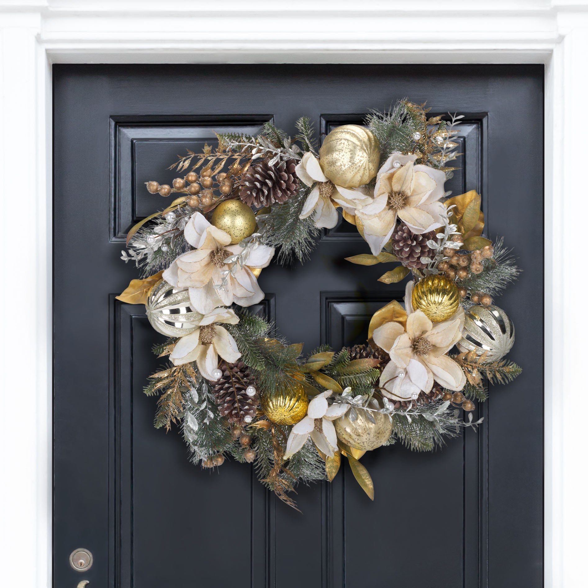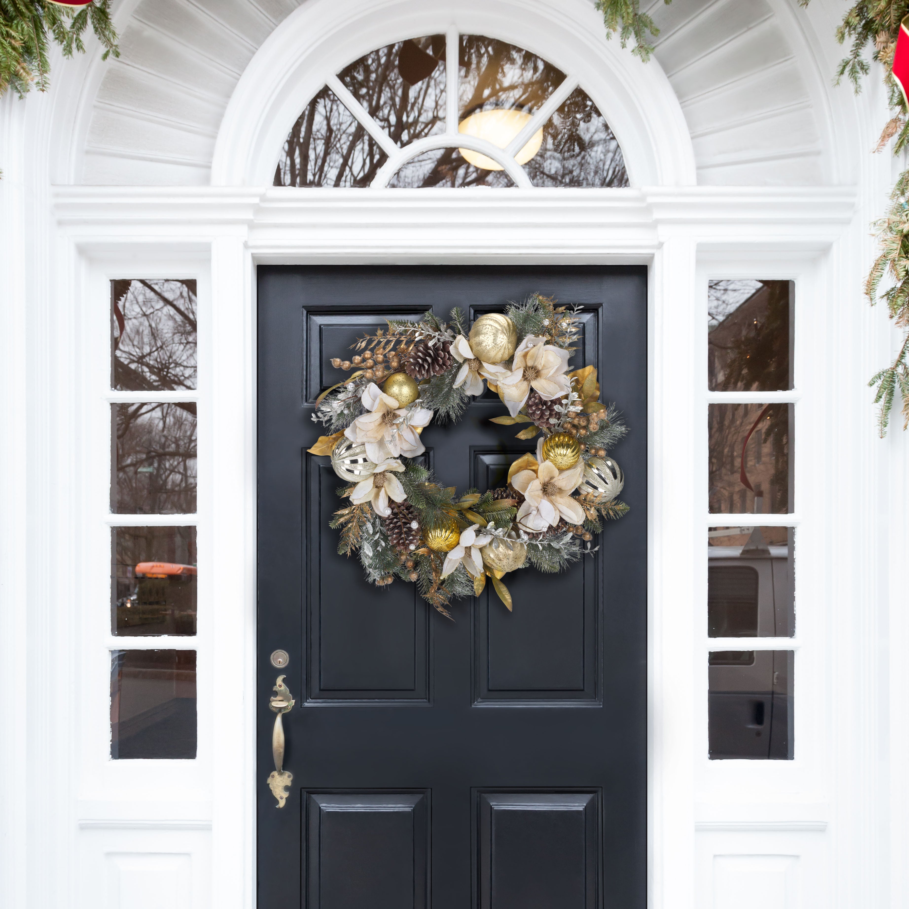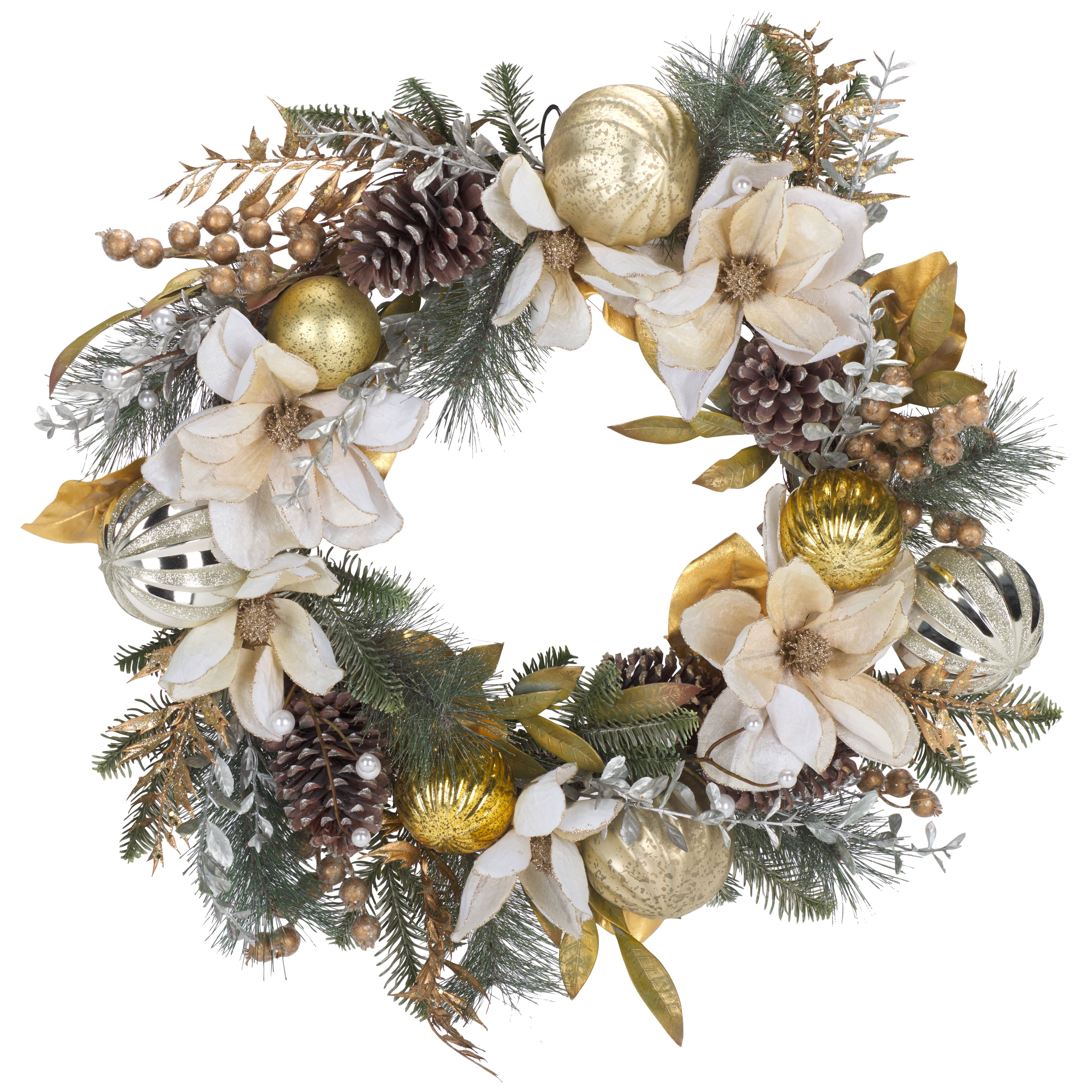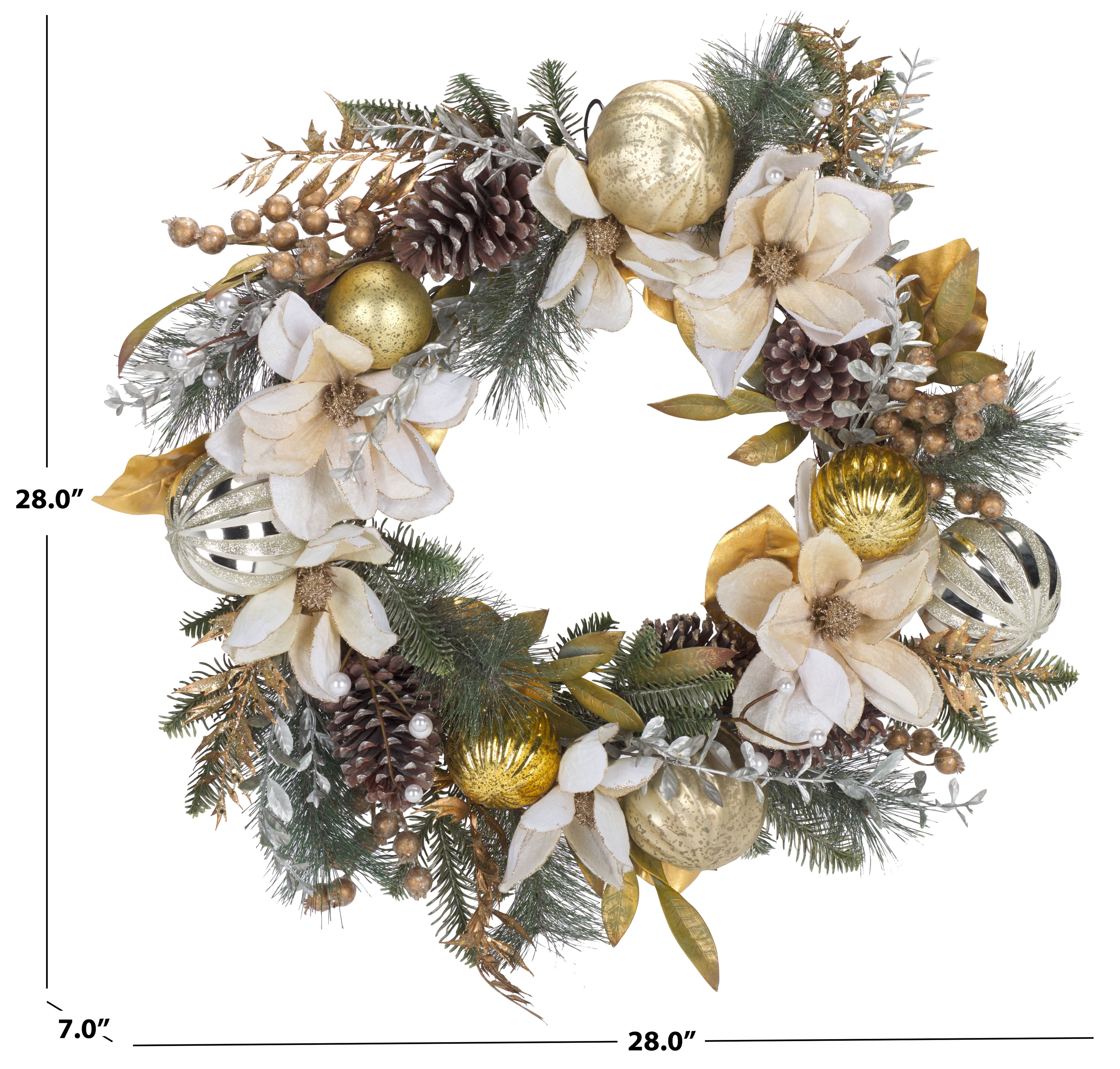 Elevate your holiday decor with this Faux 28-inch green and gold needle pine wreath. Graceful white poinsettias and shimmering gold accents create a festive charm that suits any setting. With a composition of 25 percent artificial greenery, 35 percent satin, 30 percent plastic, 5 percent iron, and 5 percent natural pinecone, this wreath combines diverse textures for a dynamic and elegant look. The interplay of green and gold brings warmth and sophistication, while the subtle inclusion of natural pinecones adds an authentic touch. Perfect for adorning doors, walls, or mantels, this wreath embodies holiday spirit with a stylish flair. Let this exquisite piece be a centerpiece of your seasonal celebration, adding a beautiful blend of tones and textures to your home. Transform your space into a festive haven with ease.