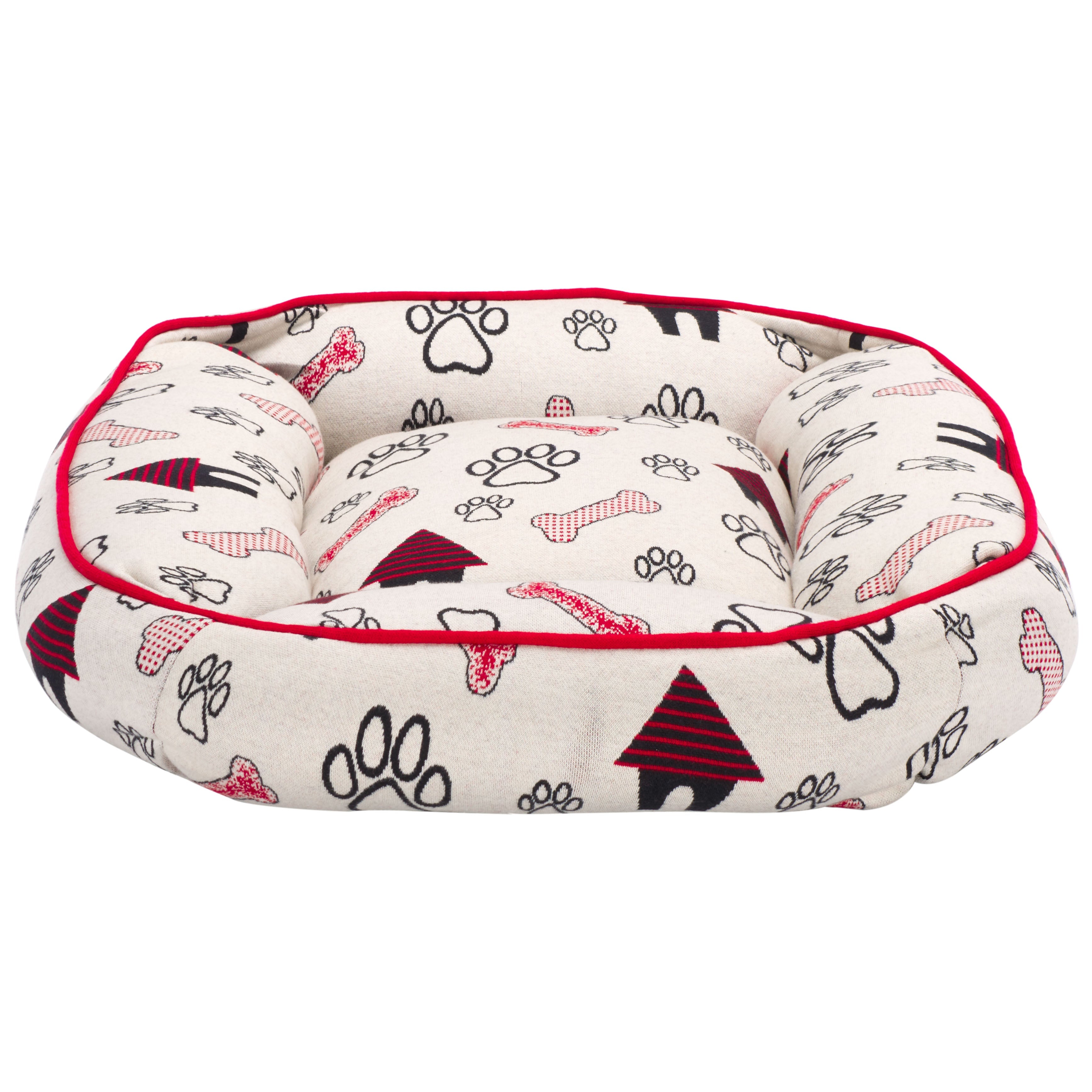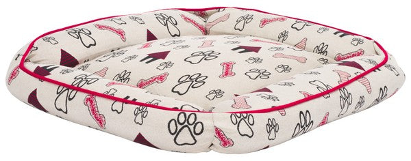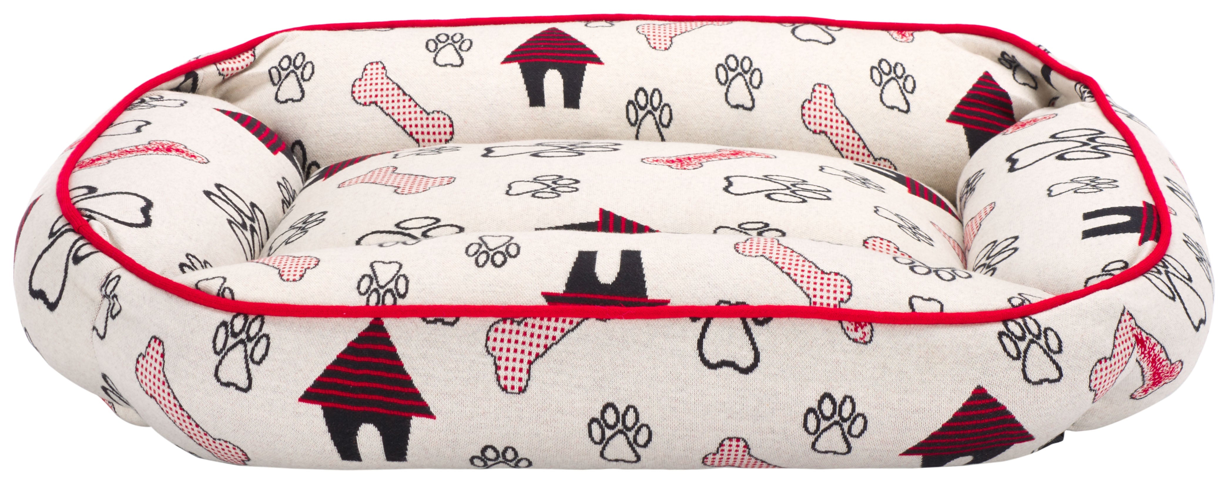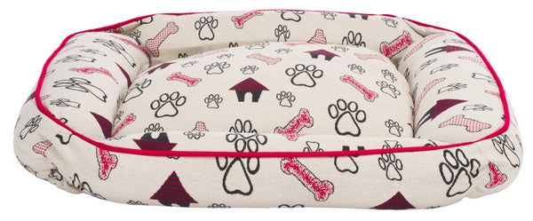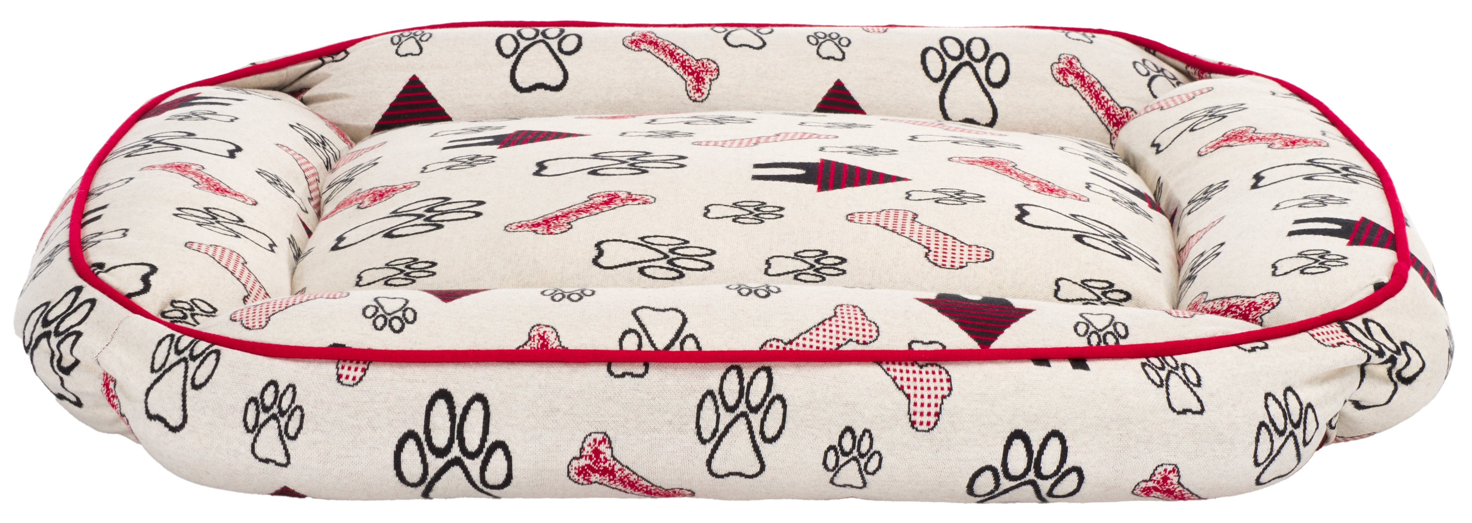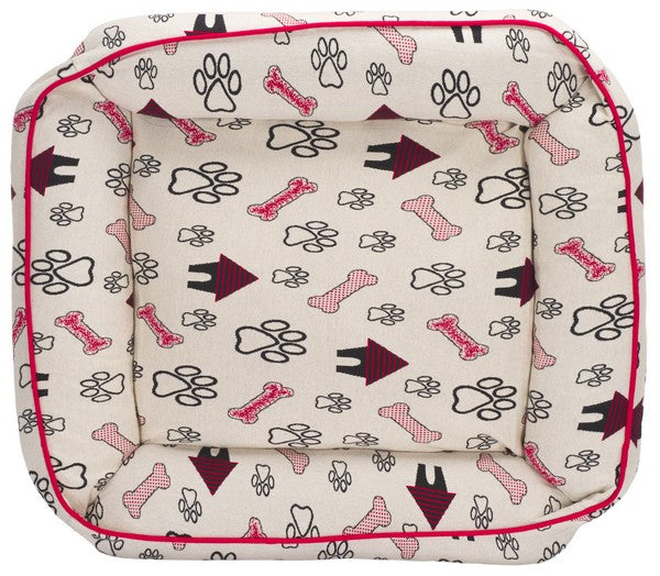 Introducing the Genji Dog Bed, a cozy haven for your beloved pet. It suits small to medium-sized dogs perfectly. This rectangular bed features an elegant cover crafted from cotton in a striking red and ivory color palette, ensuring durability and breathability. The Genji Dog Bed comes with a plush polyester filling that provides ample cushioning, making it the ultimate comforting retreat for your dog. Made in India, it showcases a unique pattern that draws inspiration from traditional rug designs, including playful paw prints and bones, infusing a sense of fun into your pet's relaxation zone. Fully washable and easy to maintain, this Dog Bed merges functionality with style. Soft to the touch and created for restful slumber, the Genji Dog Bed ensures that your furry friend enjoys unbeatable comfort day after day.