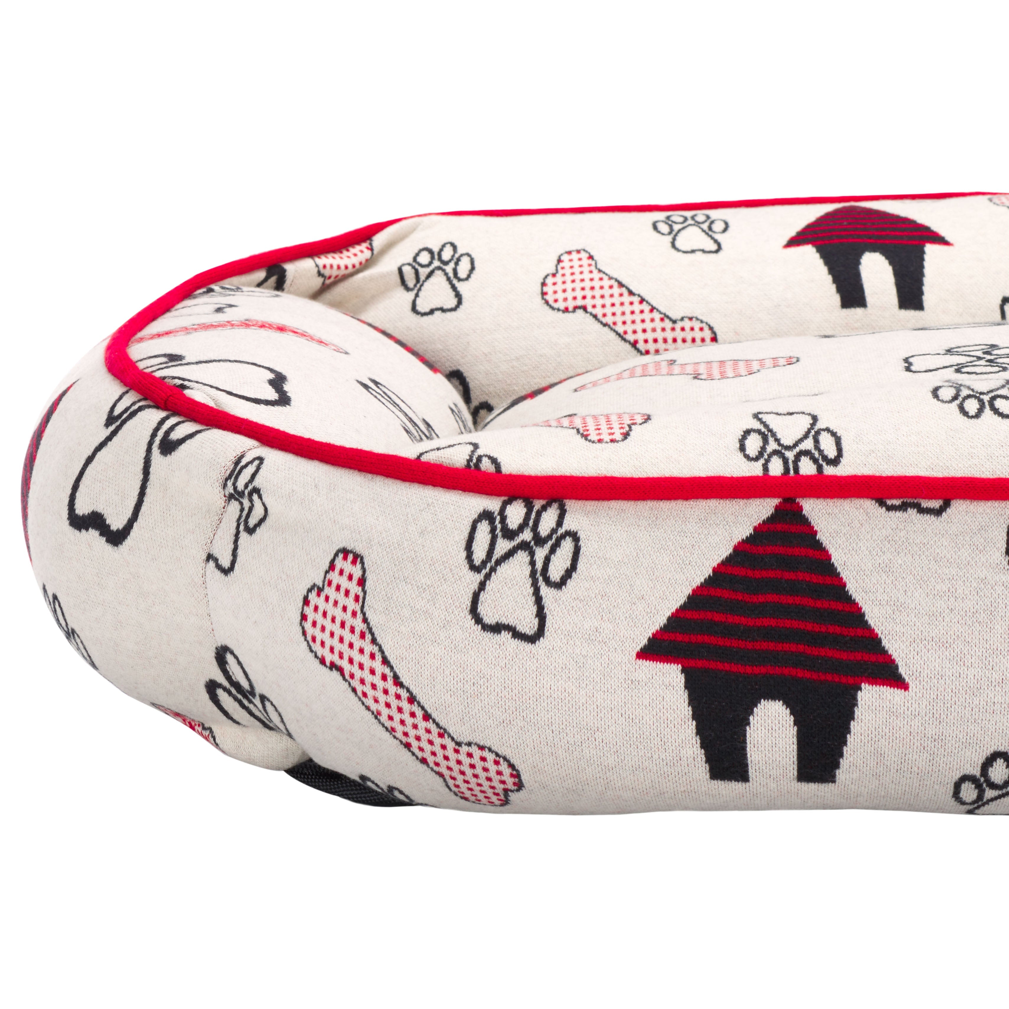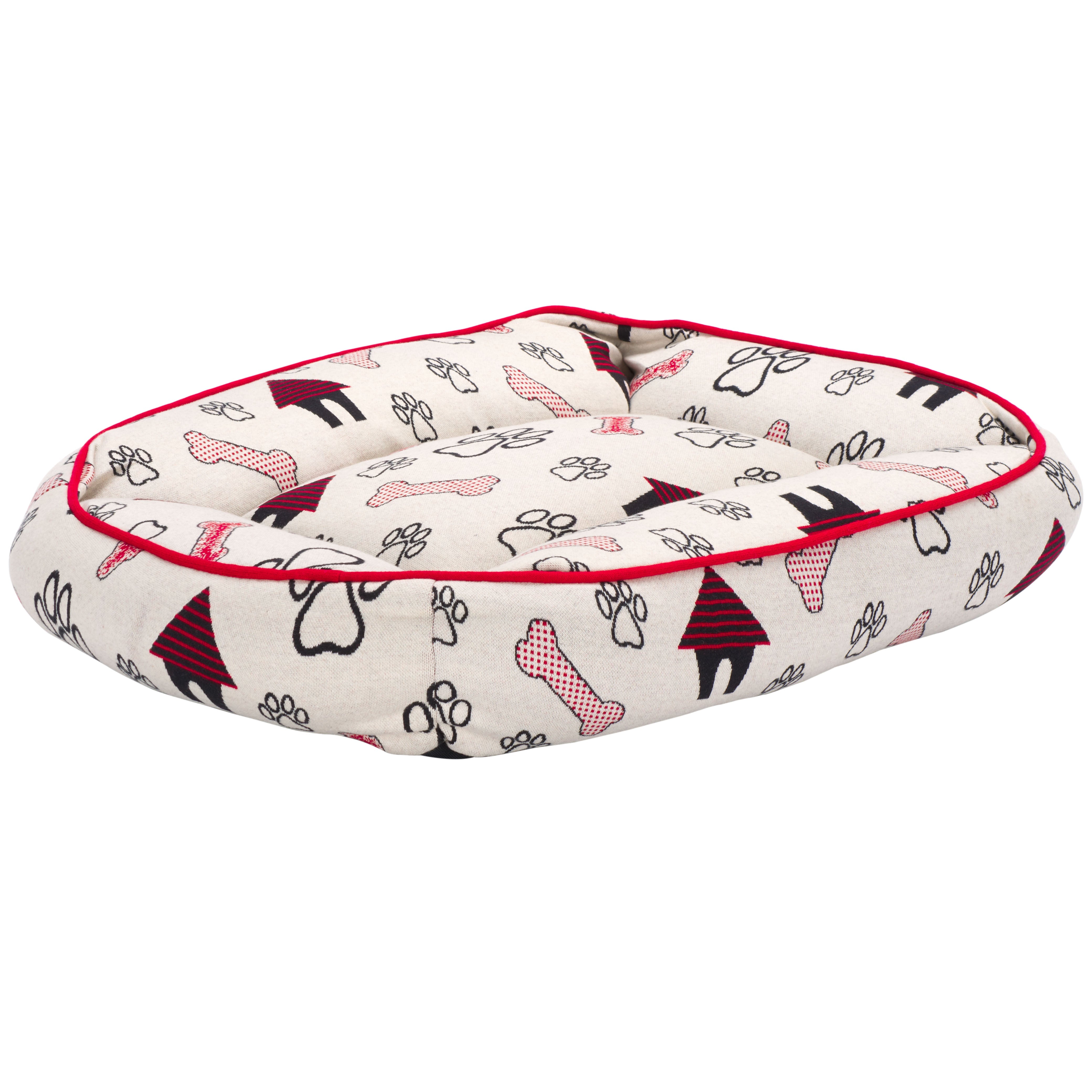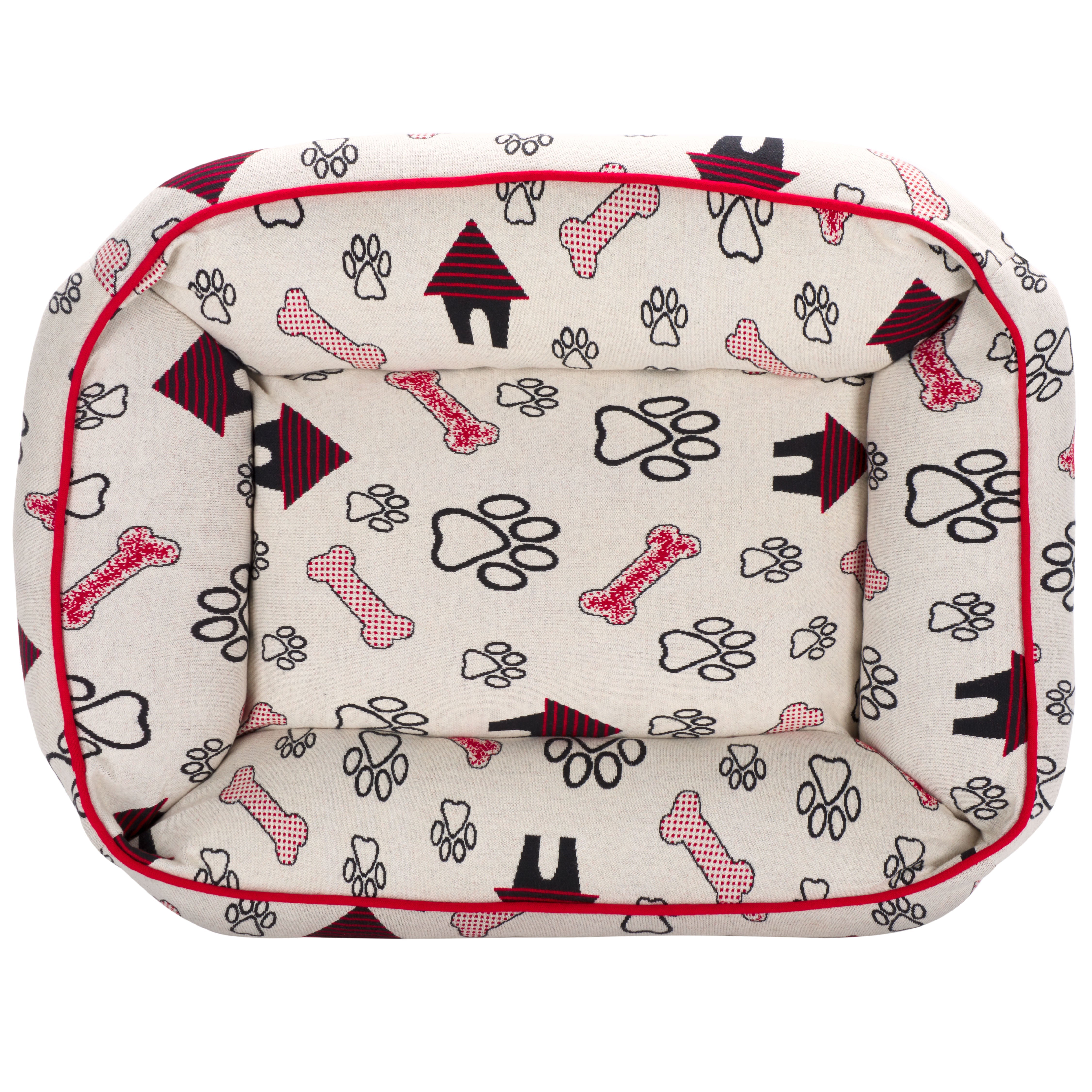 Introducing the Genji Dog Bed, a cozy haven for your beloved pet. It suits small to medium-sized dogs perfectly. This rectangular bed features an elegant cover crafted from cotton in a striking red and ivory color palette, ensuring durability and breathability. The Genji Dog Bed comes with a plush polyester filling that provides ample cushioning, making it the ultimate comforting retreat for your dog. Made in India, it showcases a unique pattern that draws inspiration from traditional rug designs, including playful paw prints and bones, infusing a sense of fun into your pet's relaxation zone. Fully washable and easy to maintain, this Dog Bed merges functionality with style. Soft to the touch and created for restful slumber, the Genji Dog Bed ensures that your furry friend enjoys unbeatable comfort day after day.