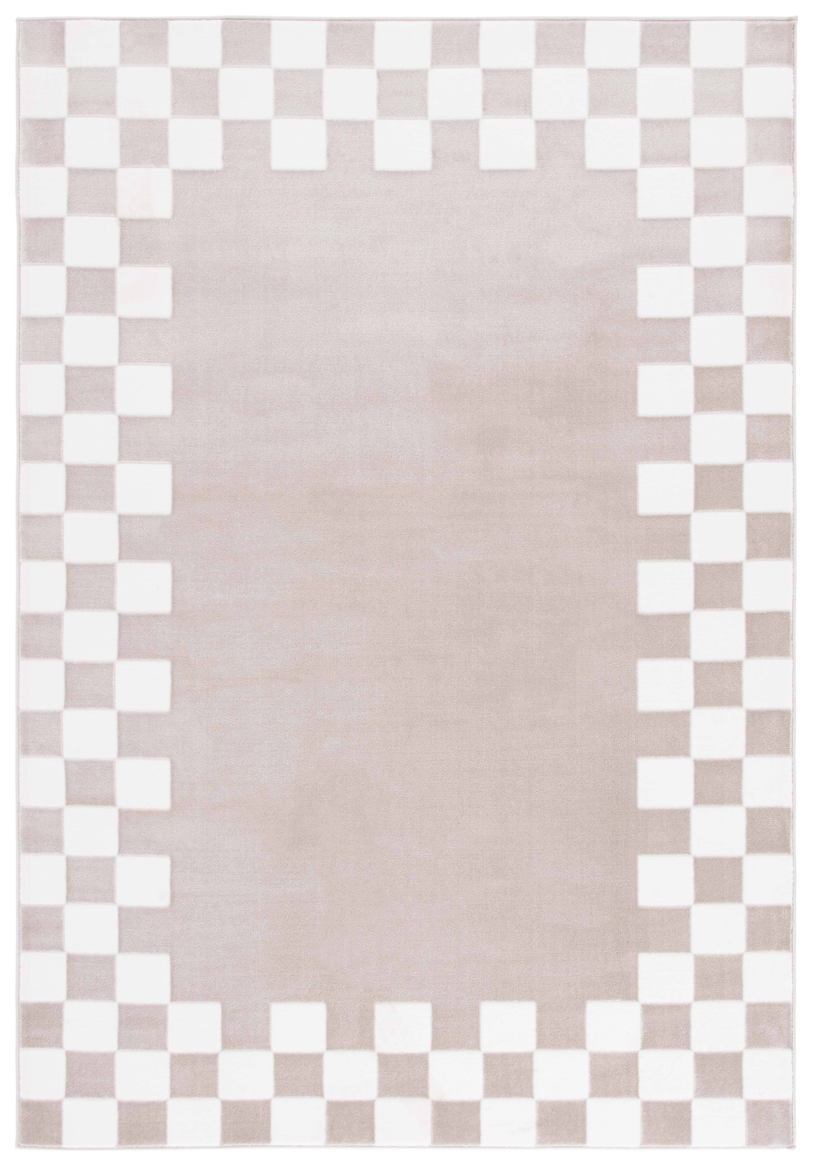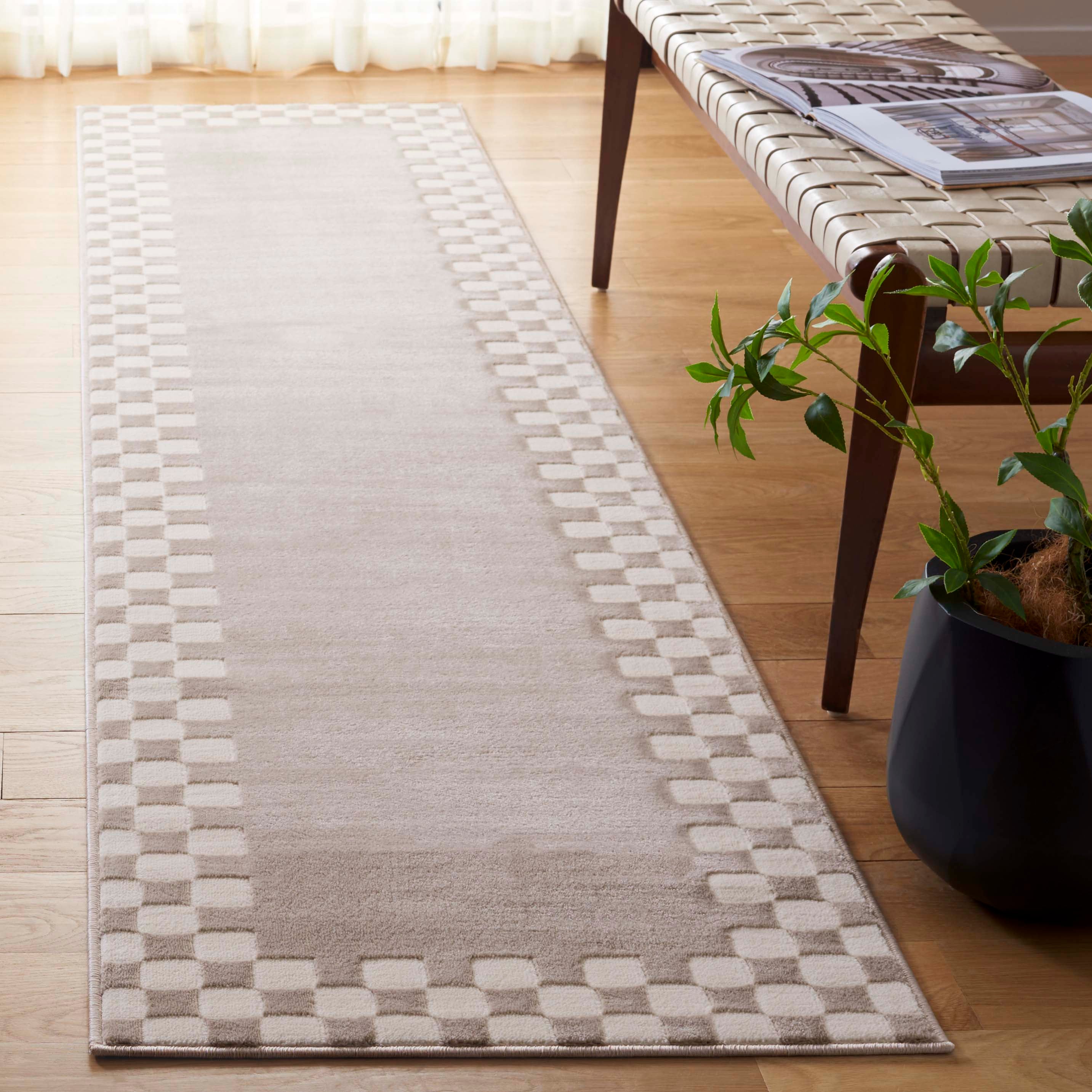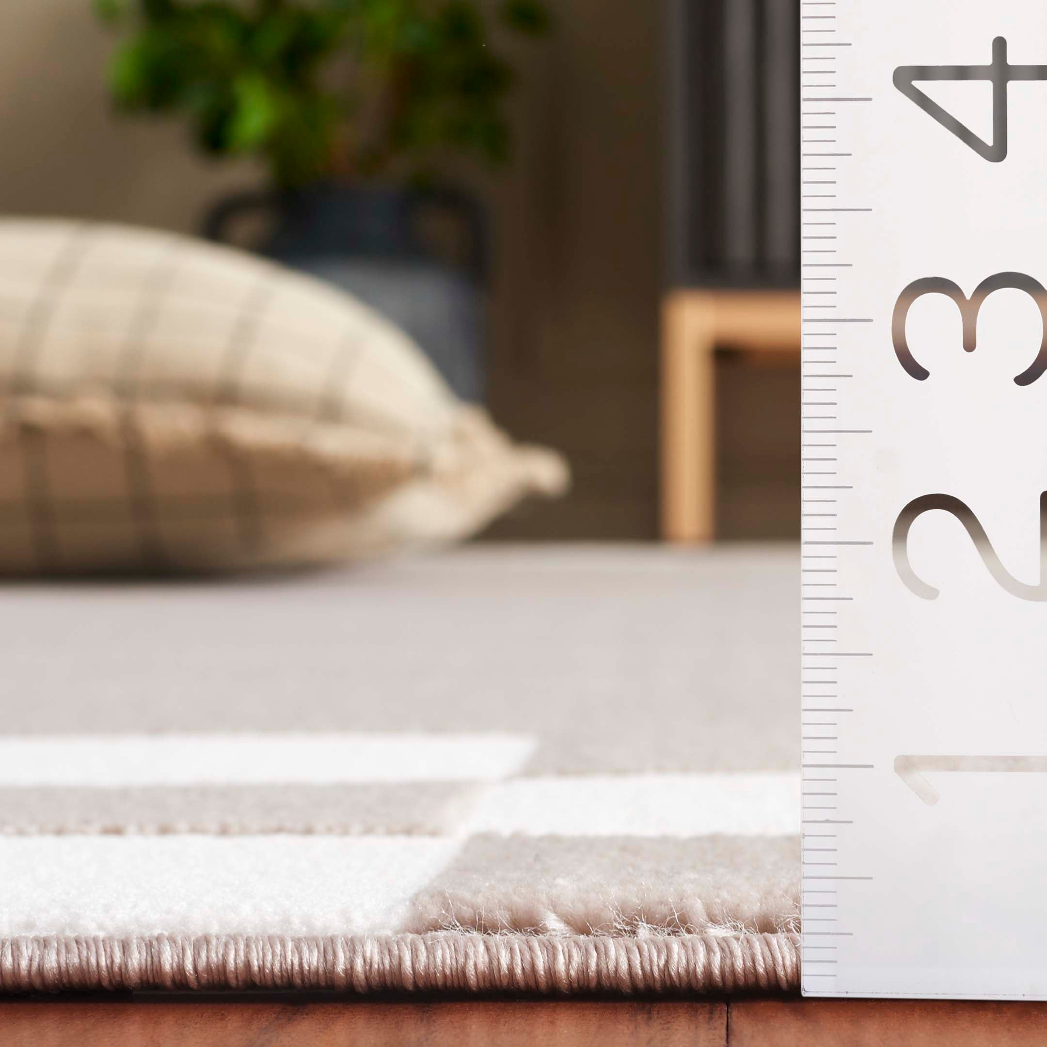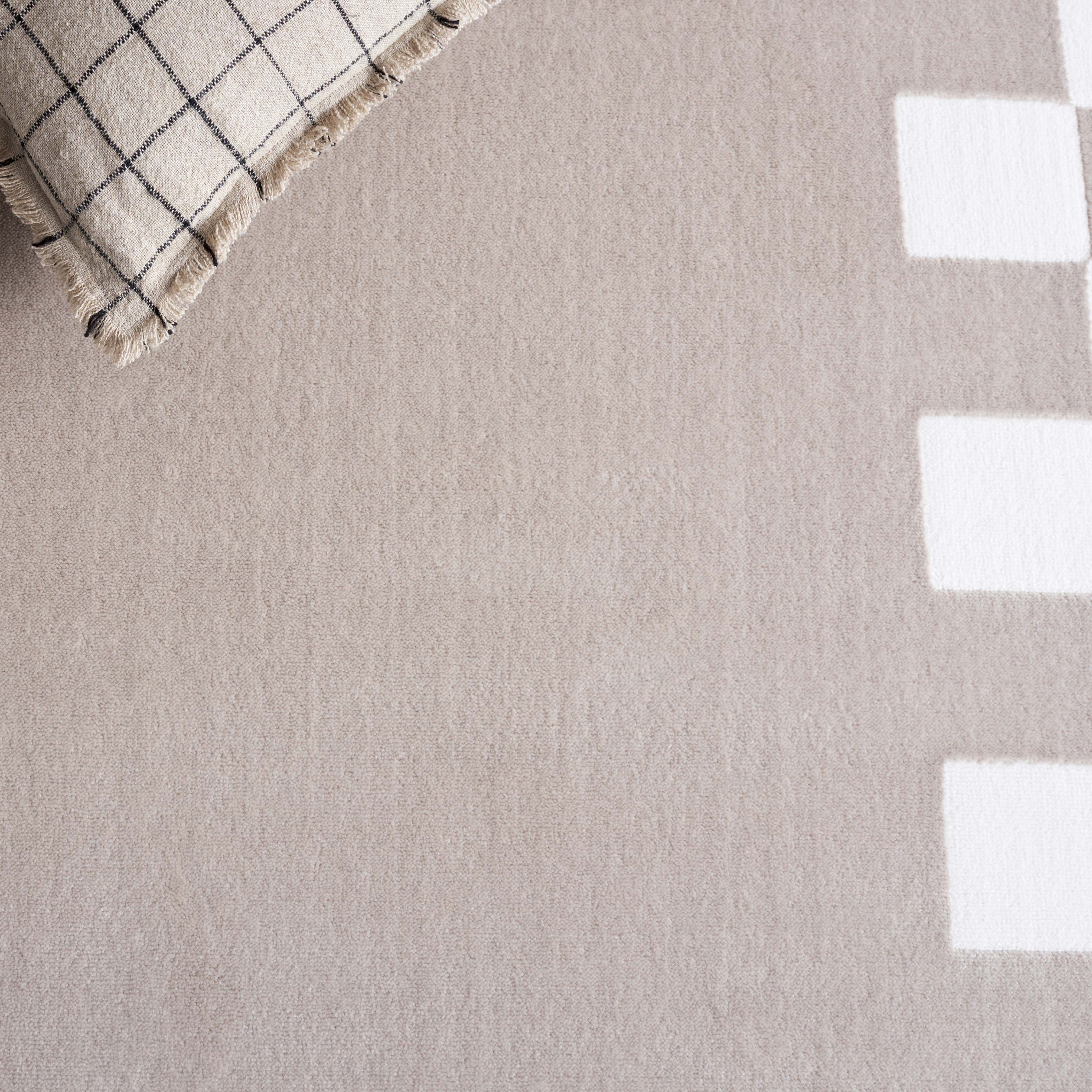 The rug's design features a minimalist modern style, utilizing a grid-like pattern along the borders that evokes a sense of structure and balance, without overpowering the space. The neutral beige serves as the primary backdrop, complemented by alternating ivory squares that give the illusion of a three-dimensional effect and adds a touch of visual interest to the piece.