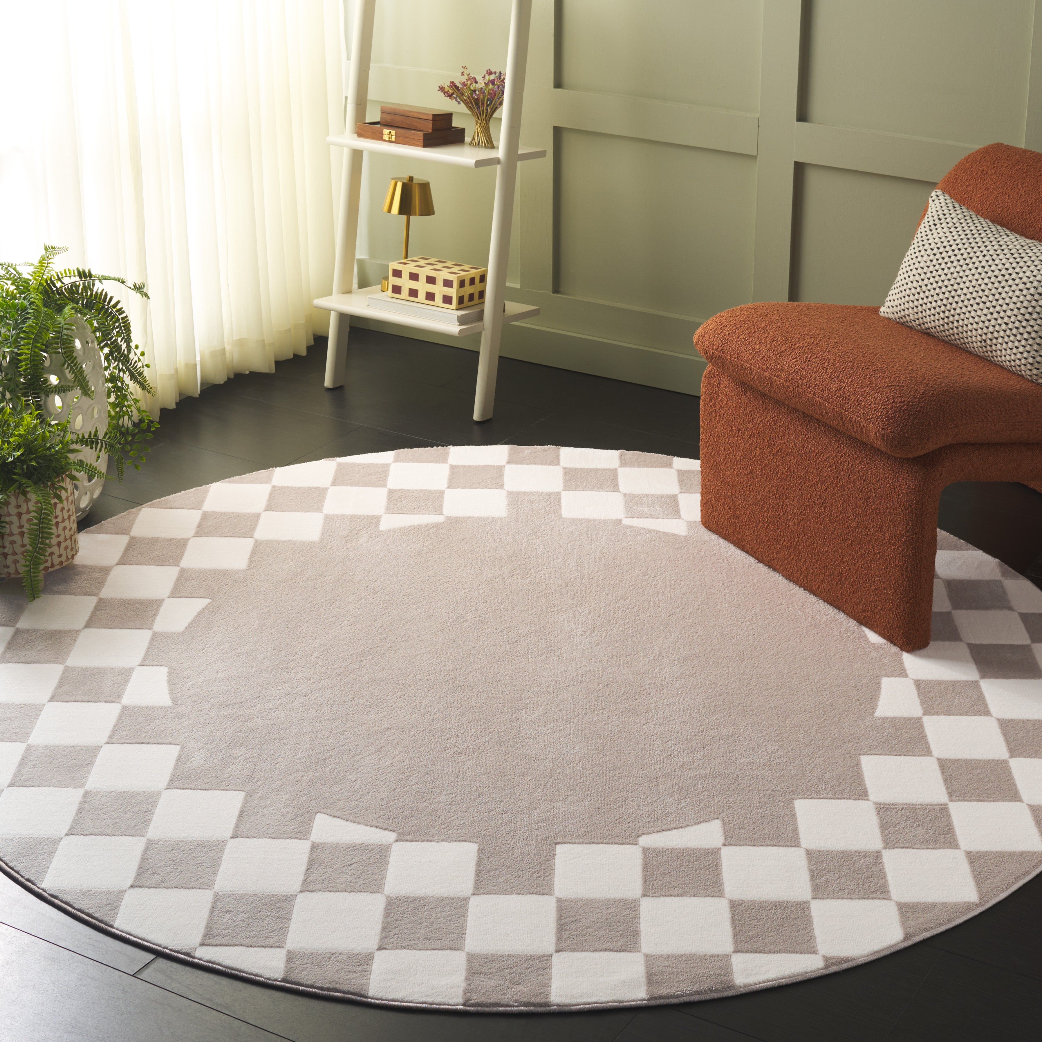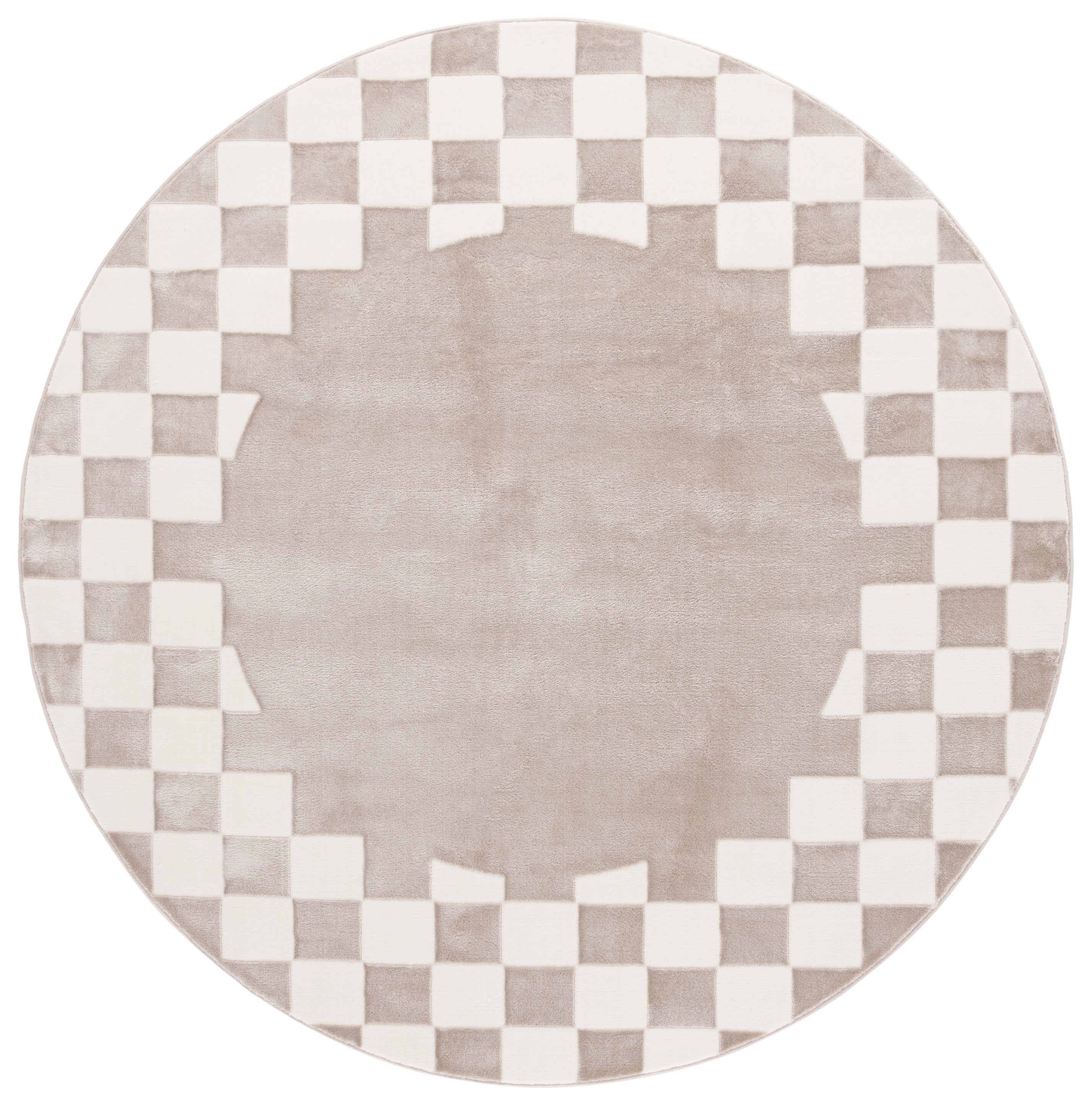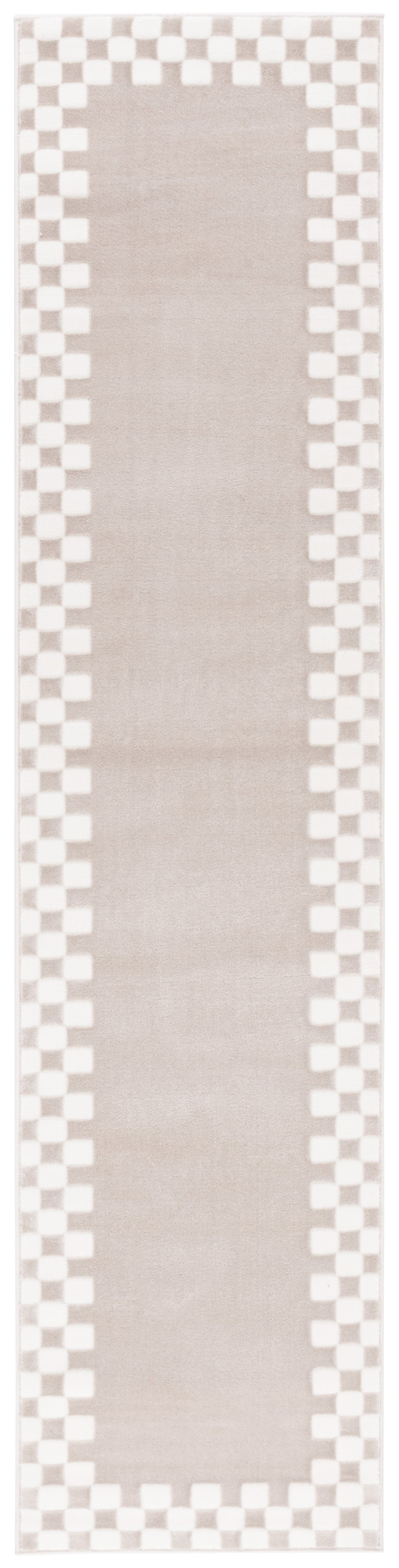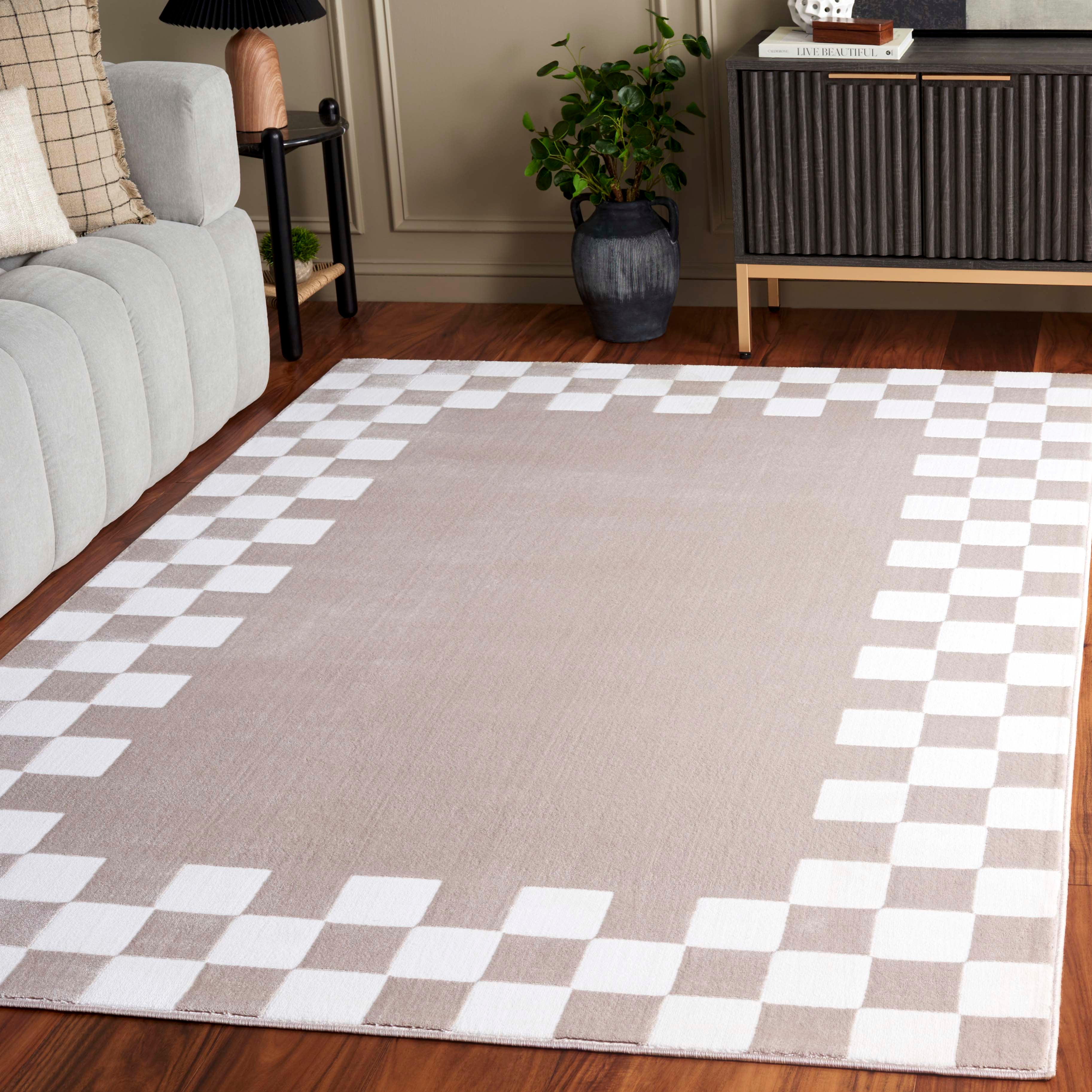 The rug's design features a minimalist modern style, utilizing a grid-like pattern along the borders that evokes a sense of structure and balance, without overpowering the space. The neutral beige serves as the primary backdrop, complemented by alternating ivory squares that give the illusion of a three-dimensional effect and adds a touch of visual interest to the piece.