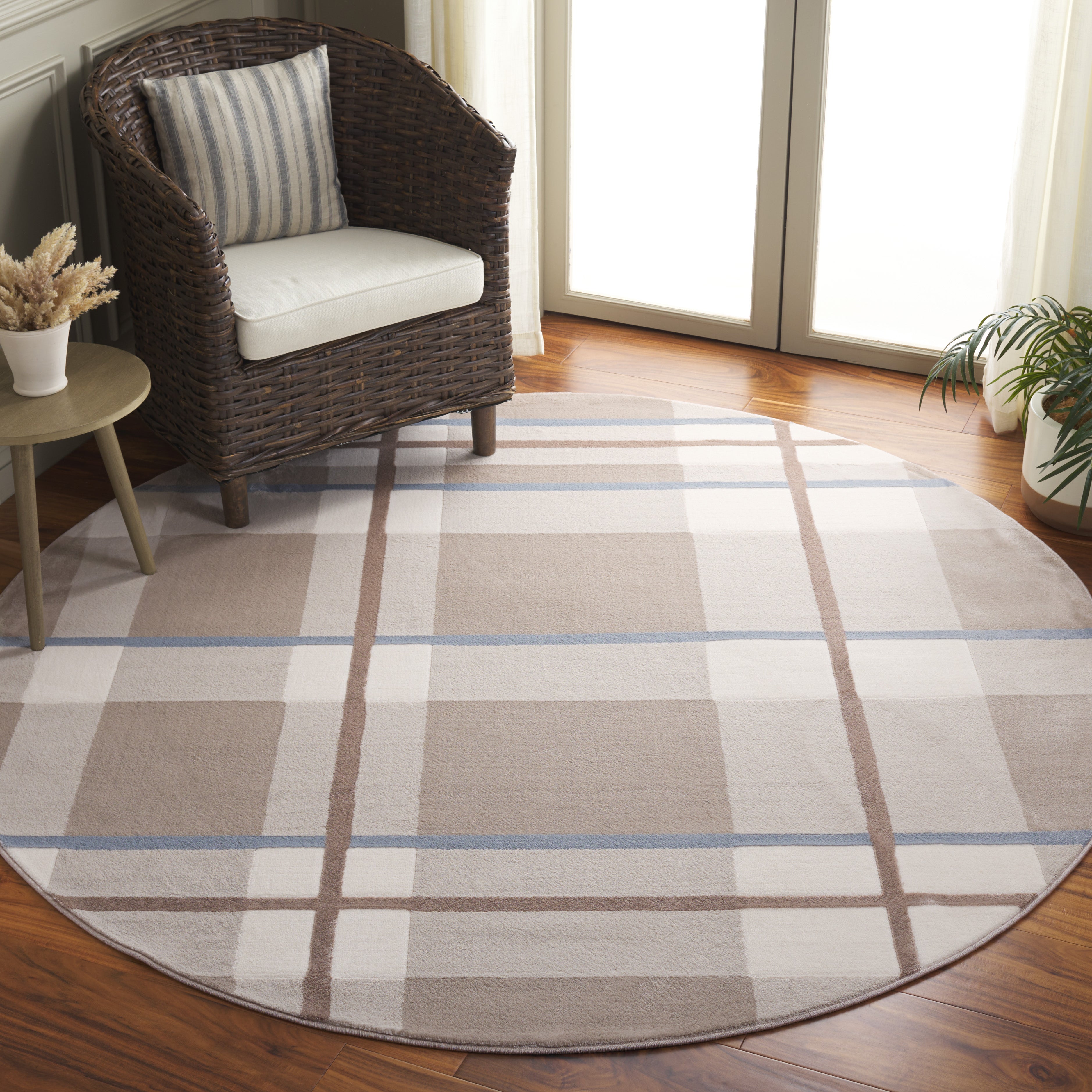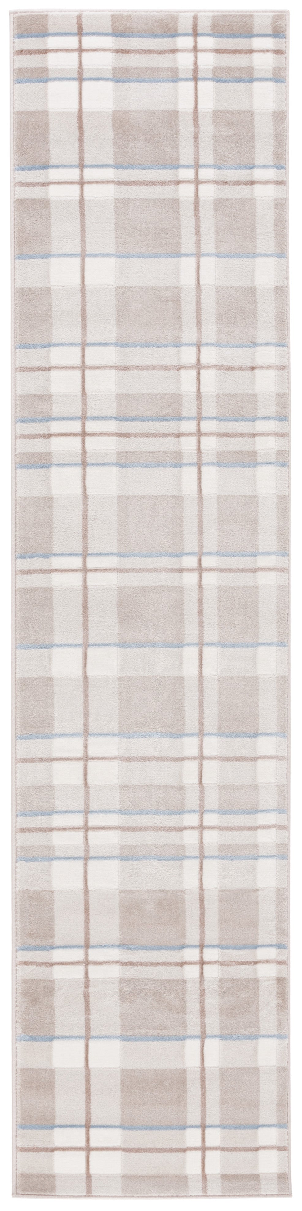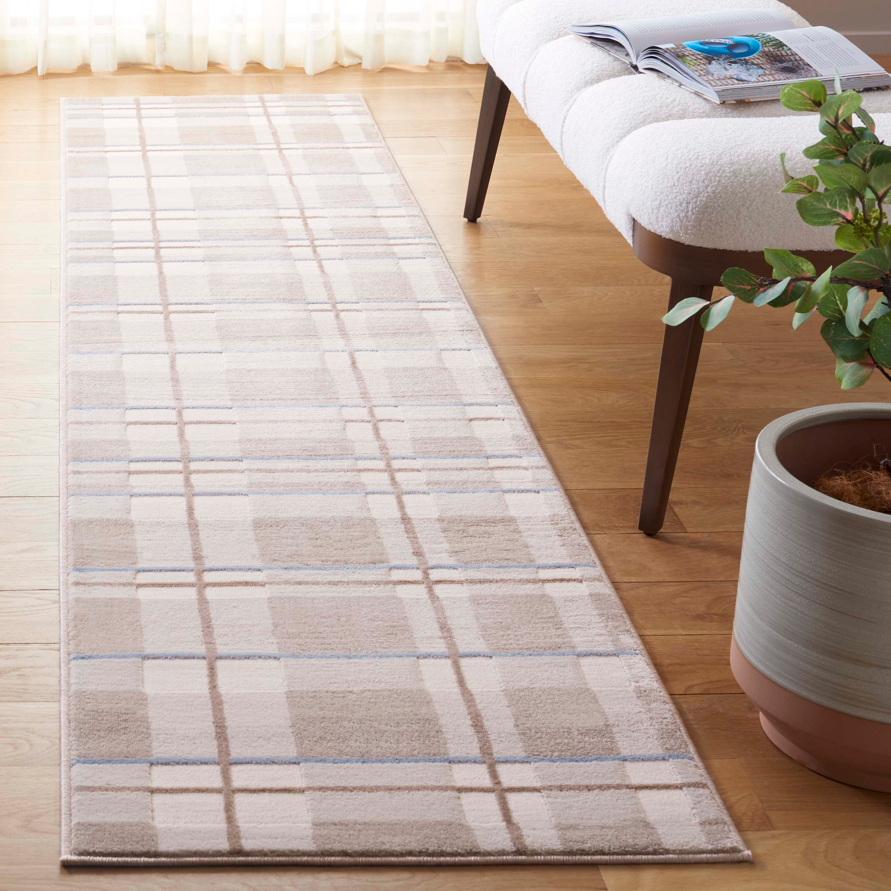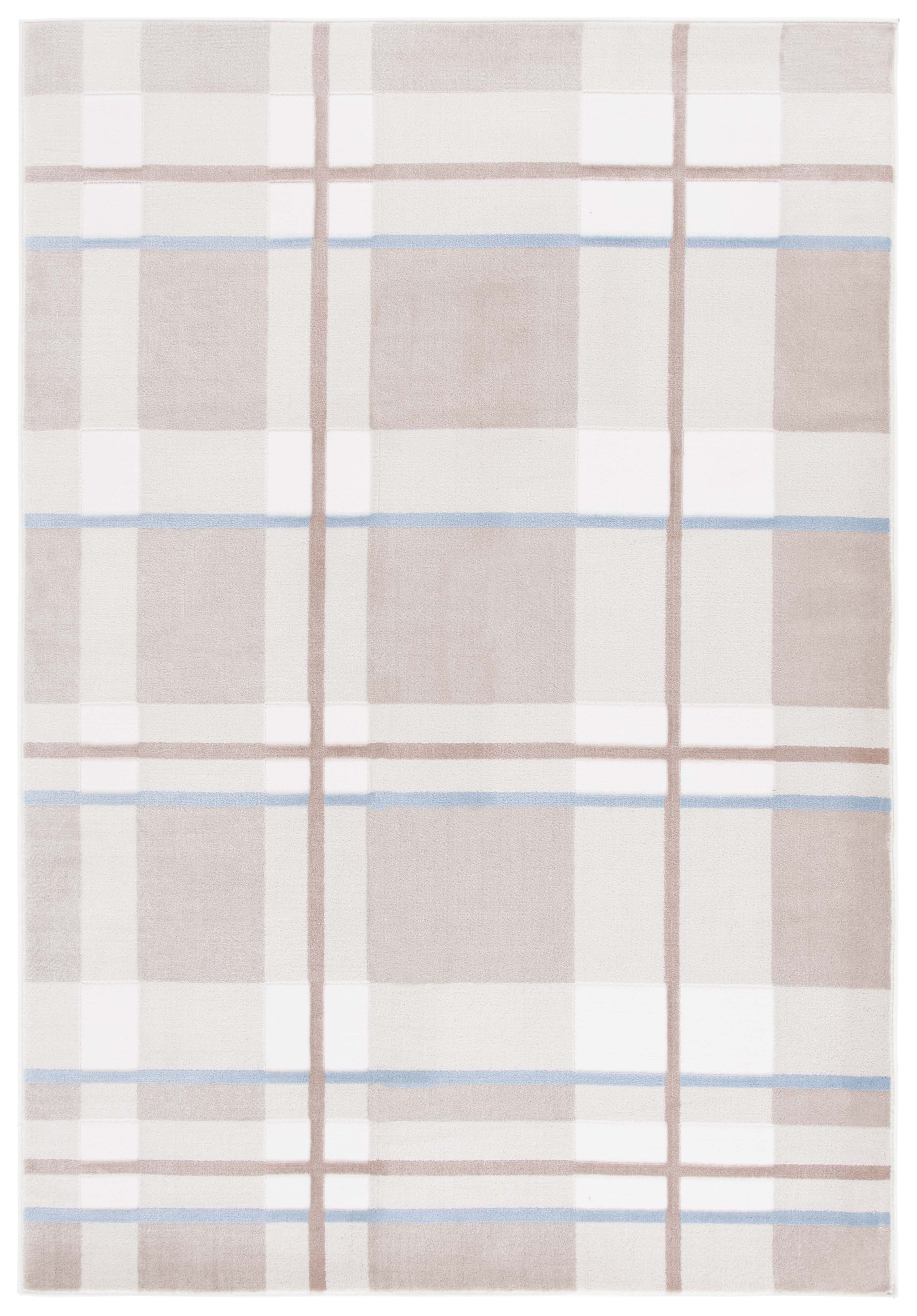 The contemporary design features a harmonious blend of beige and light blue hues, creating a serene and inviting atmosphere in any room. Its pattern showcases a modern grid with clean lines that intersect to form a checkerboard-like pattern, giving the rug a minimalist yet visually striking appeal.