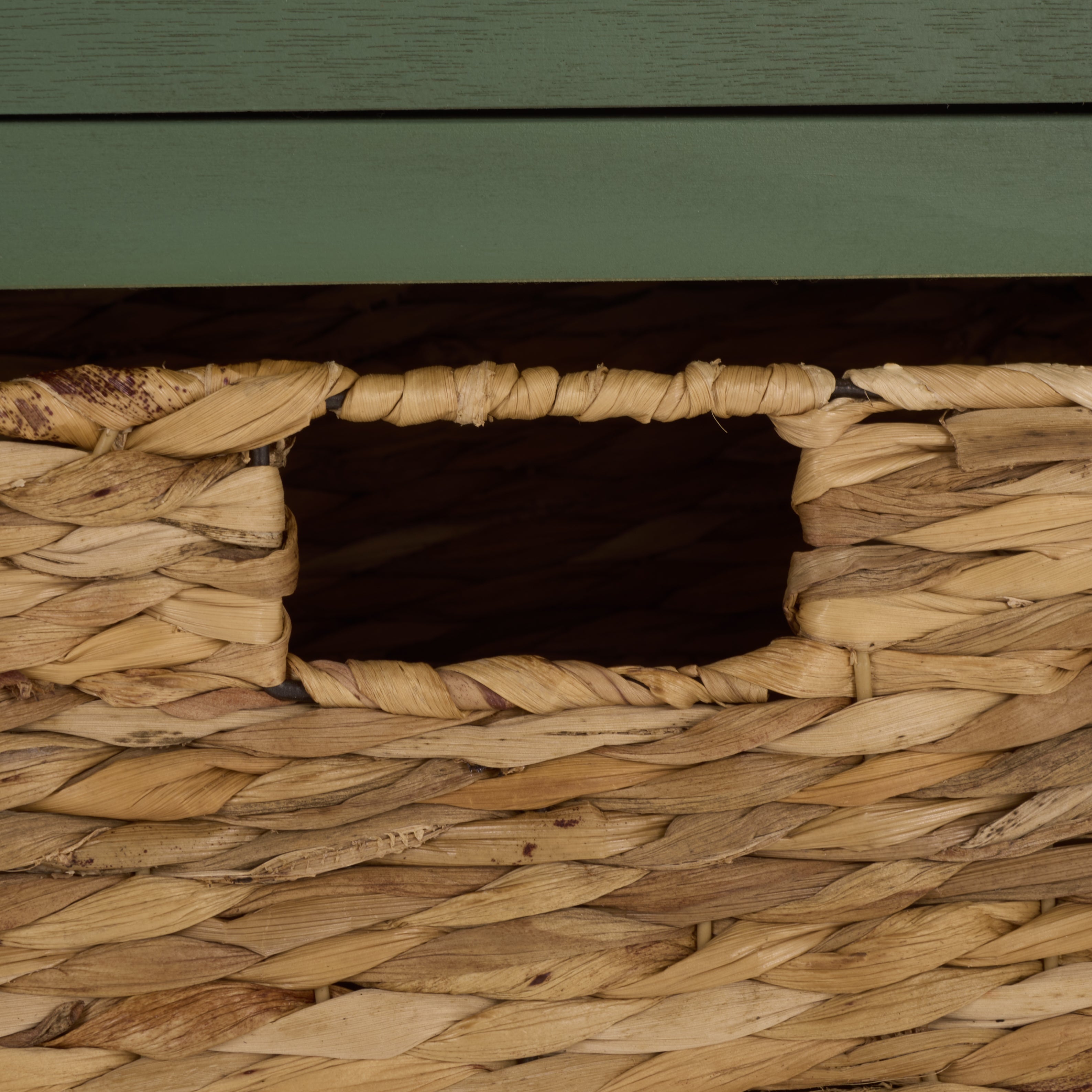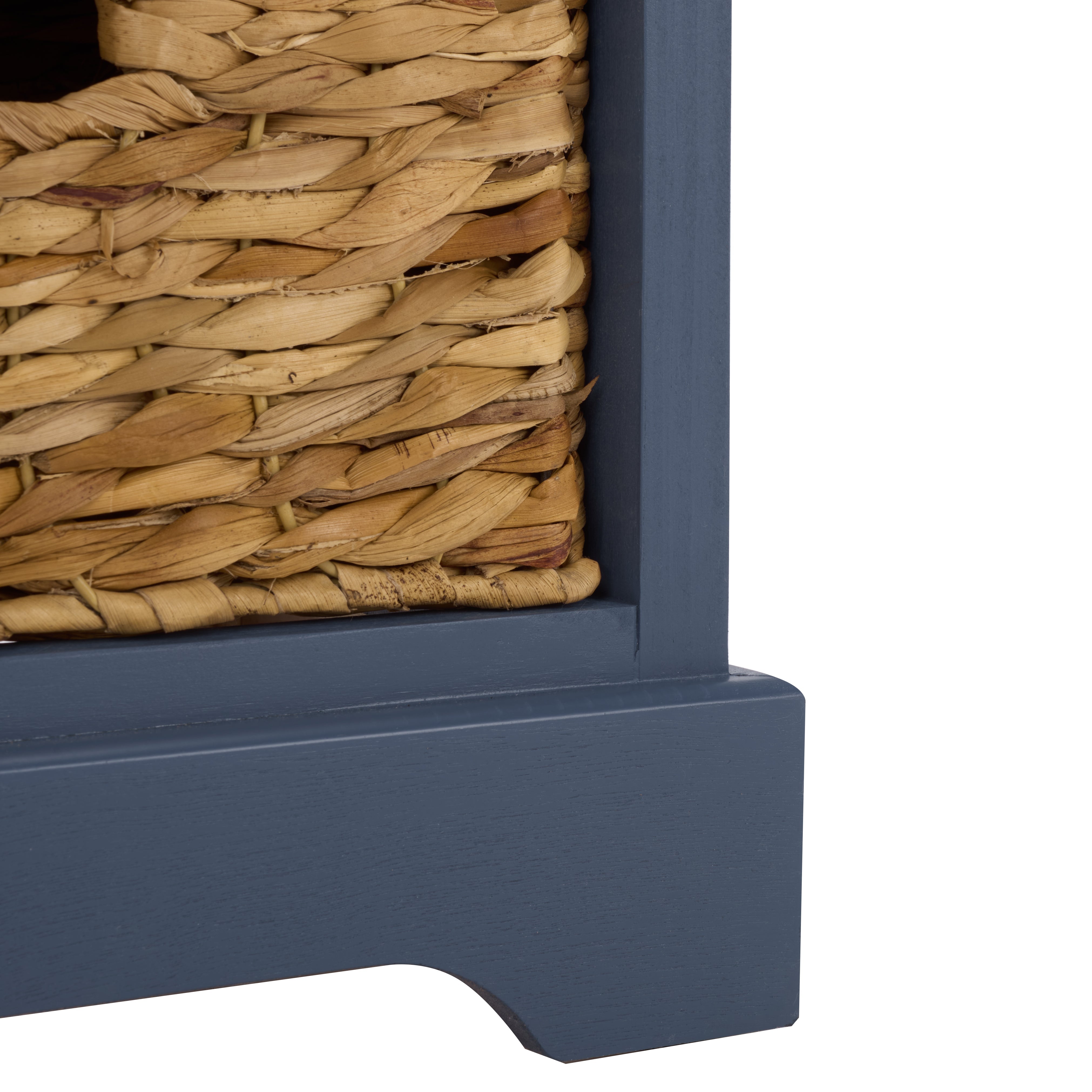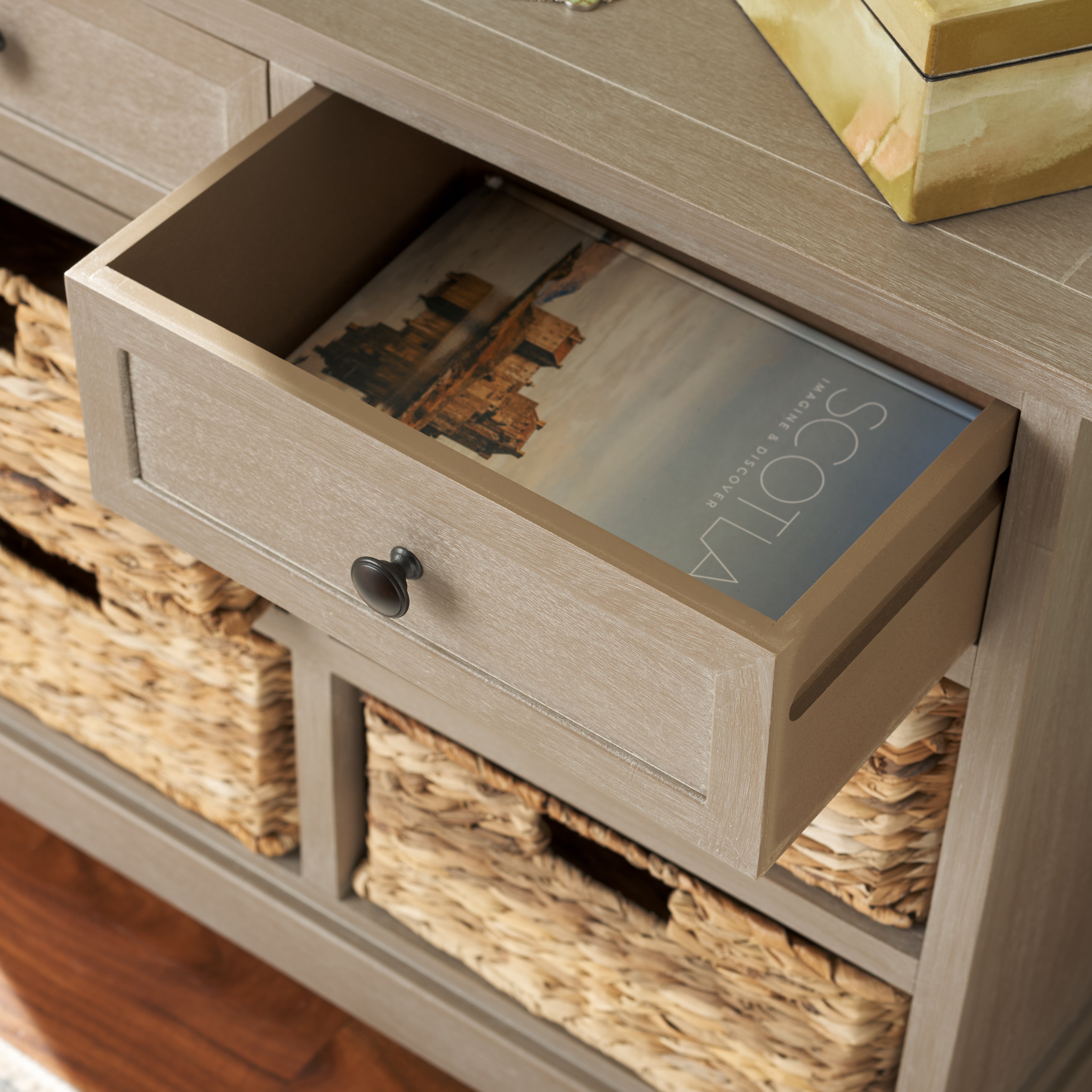 Country charm with an easygoing twist characterizes the Herman Storage Unit. With its four removable woven baskets and pine, storing or finding what you need has never been easier.