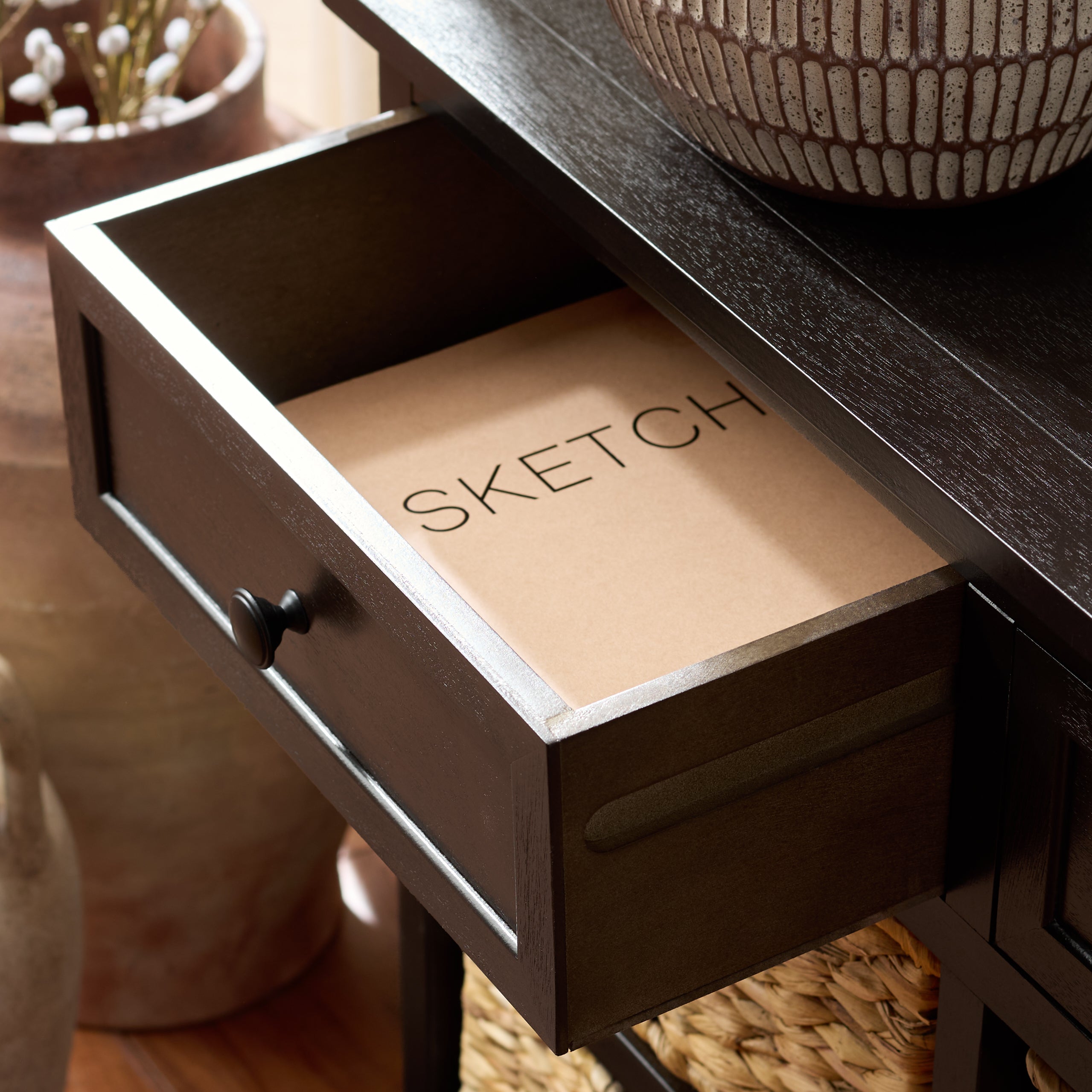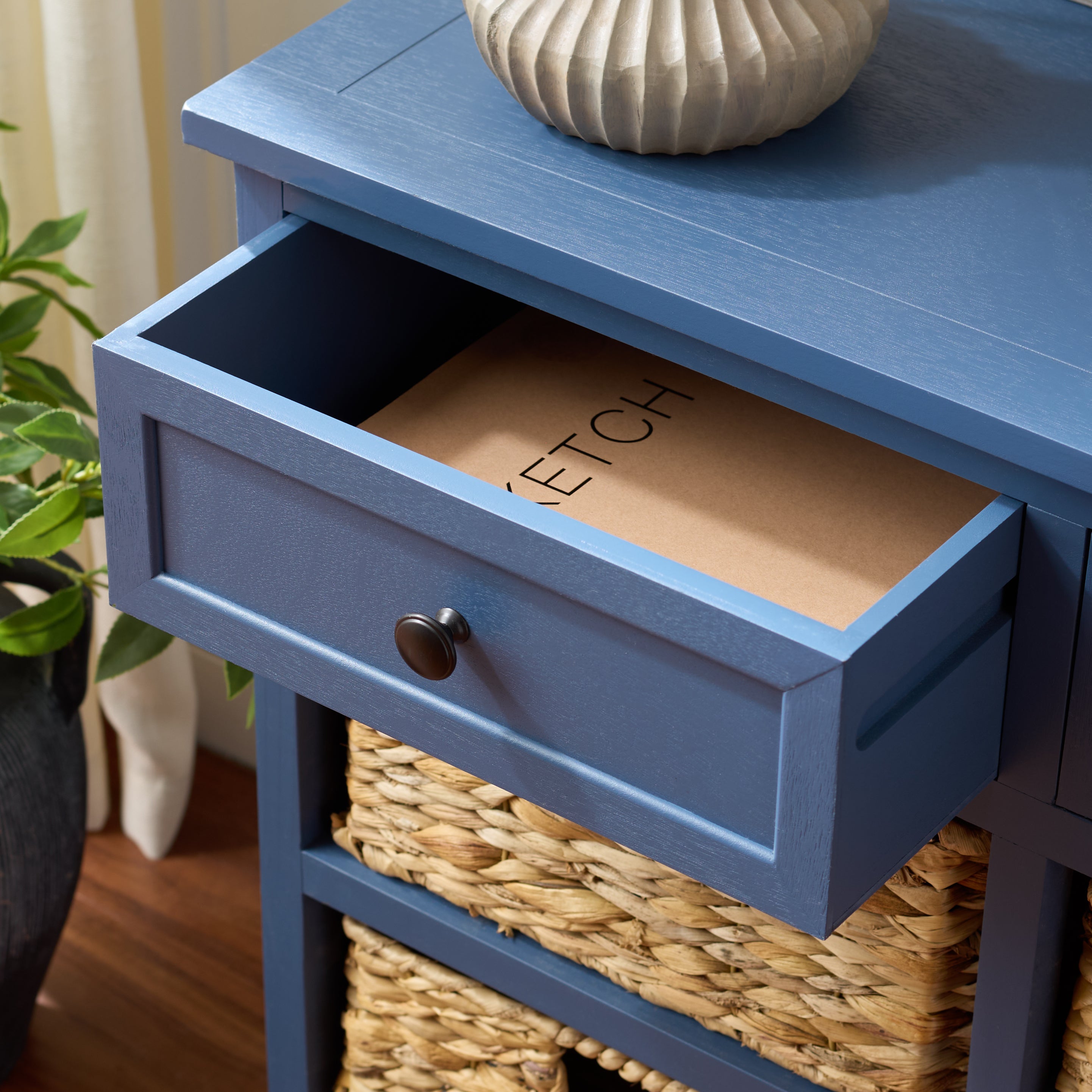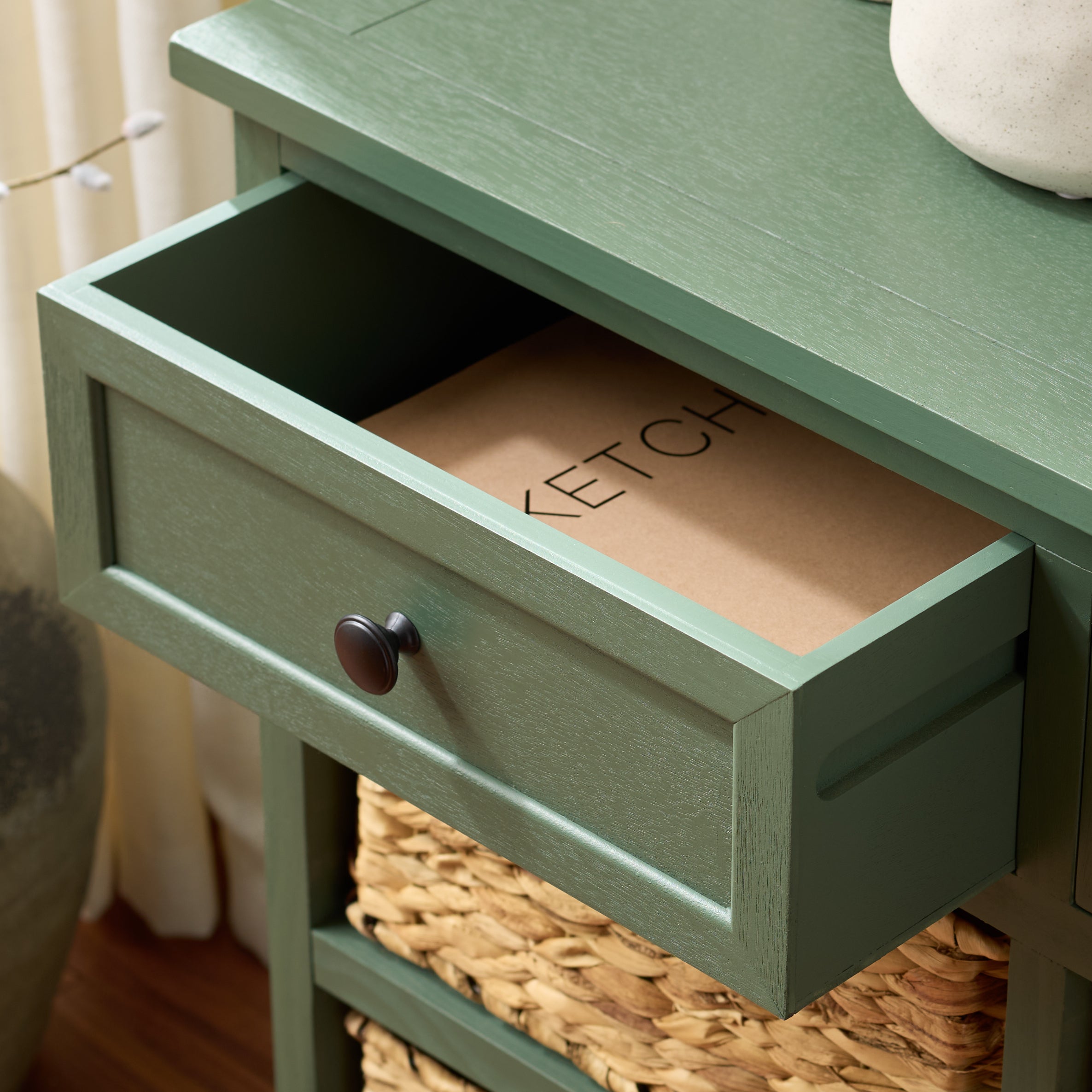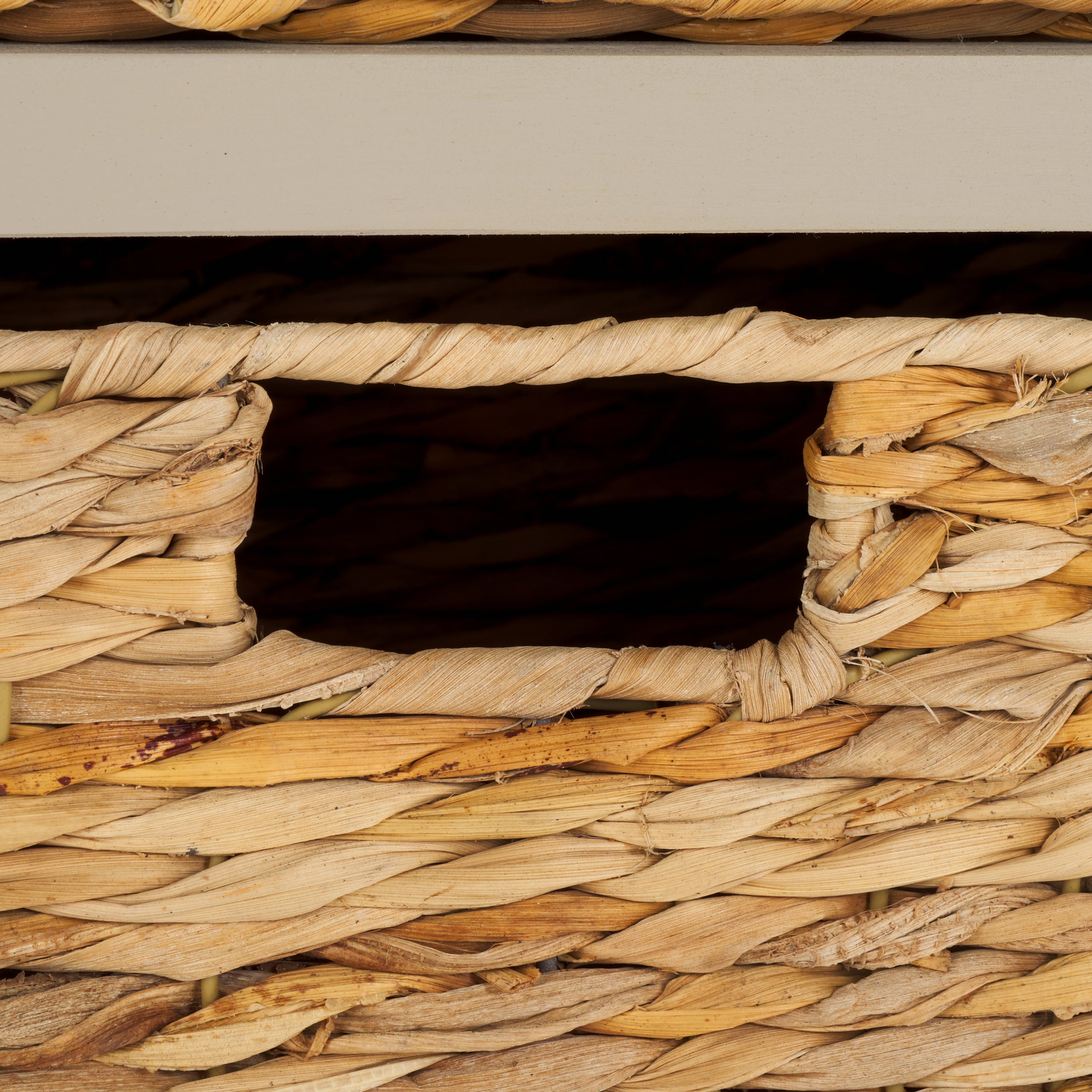 Country charm with an easygoing twist characterizes the Herman Storage Unit. With its four removable woven baskets and pine, storing or finding what you need has never been easier.