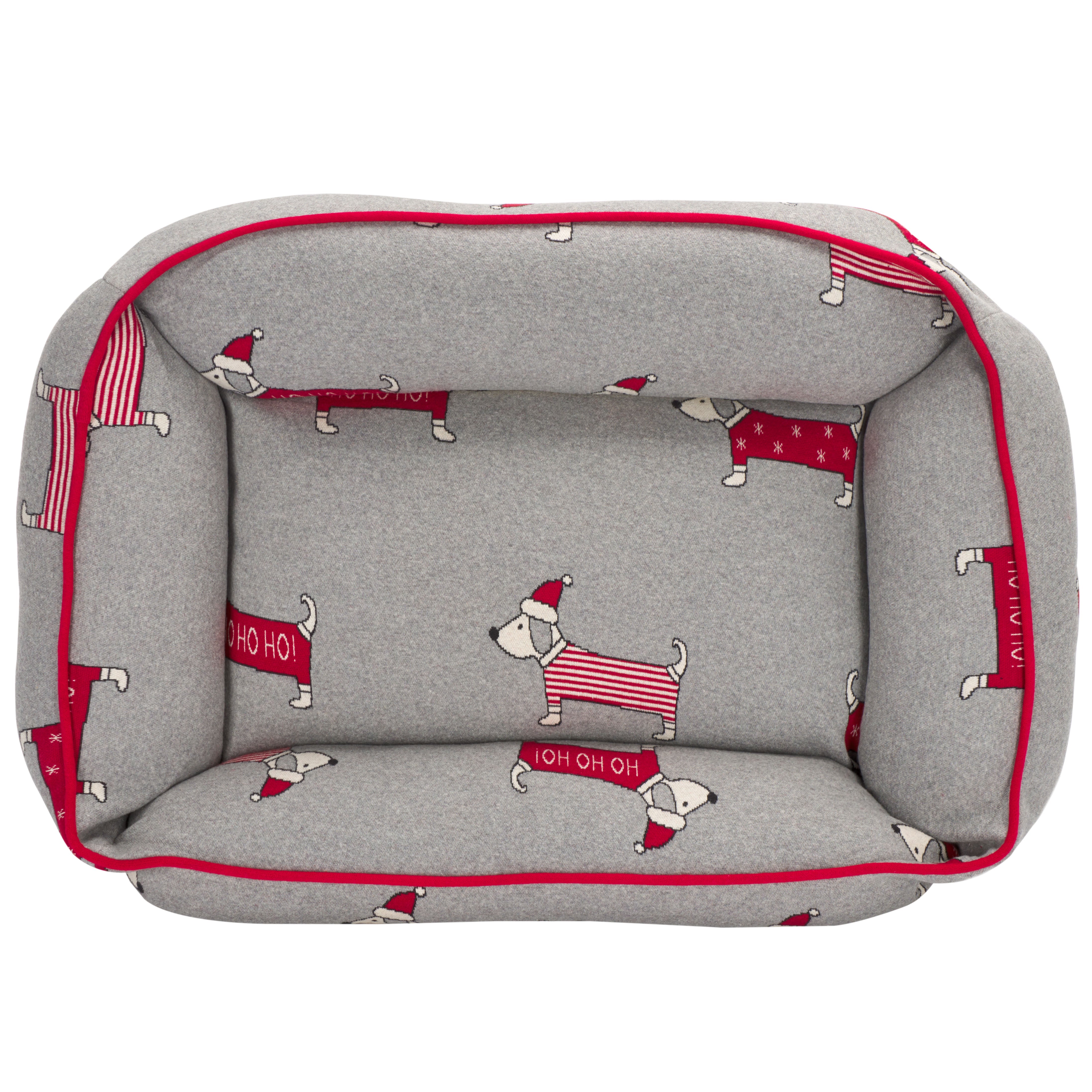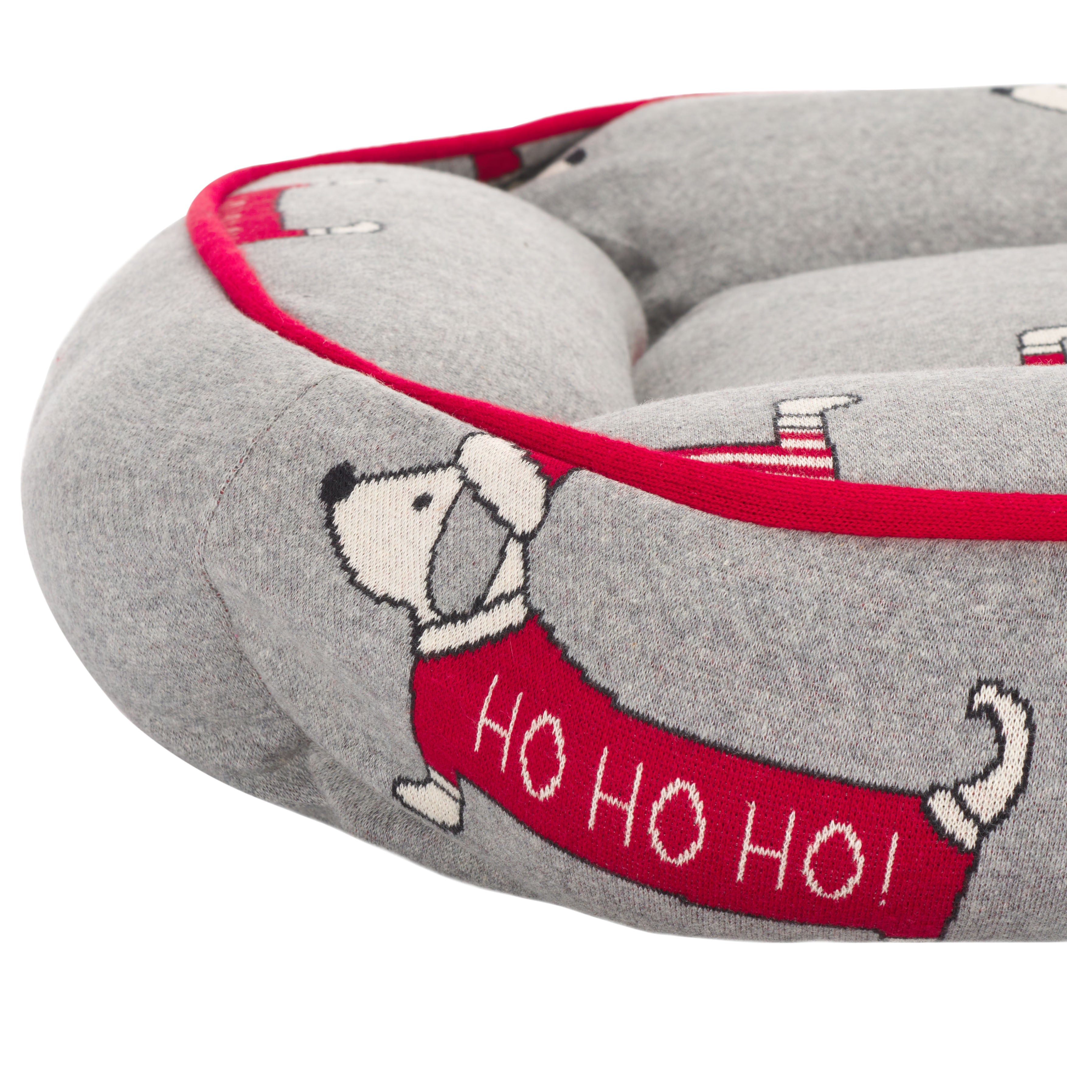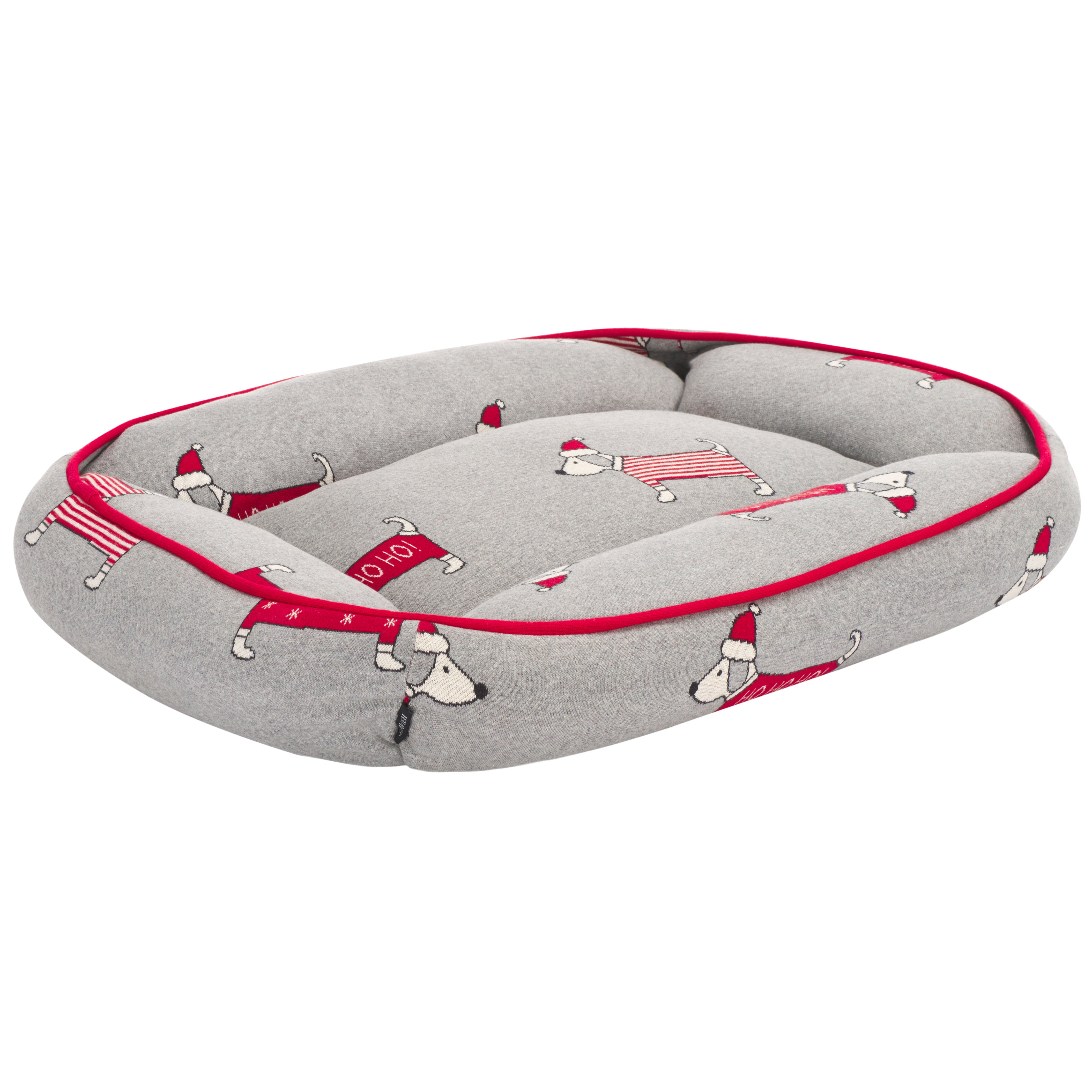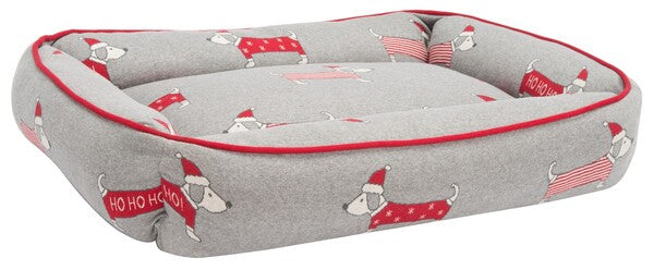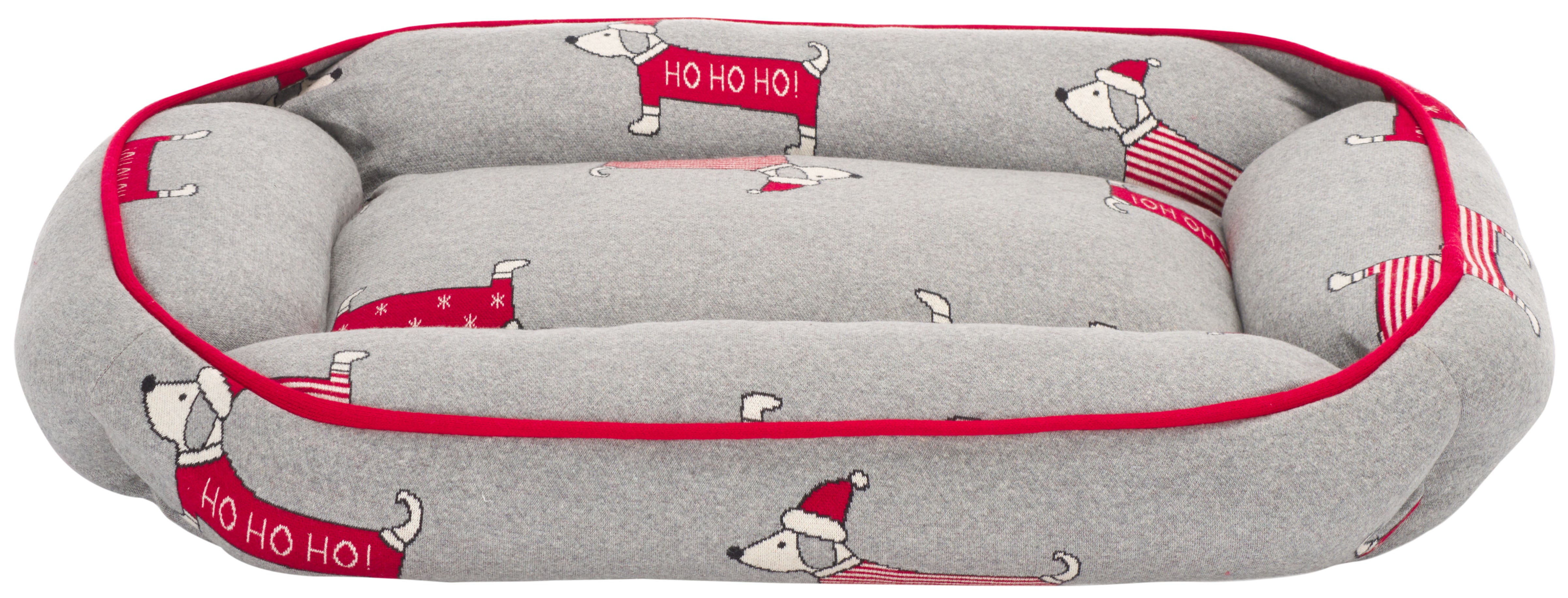 Celebrate the festive season and give your beloved pet the gift of comfort with the HOHOHO Dog Bed! Expertly crafted in India, this rectangular bed is a perfect blend of style and coziness in a grey and red color scheme, ensuring the perfect spot for your furry friend to curl up. The bed features a high-quality cotton cover with a cheerful rug pattern of playful dogs in Santa hats, adding a splash of holiday cheer to any room. The soft, plush filling made of polyester offers incomparable comfort, while the cotton backing guarantees durability. This easy-to-wash bed is as practical as it is charming. Spoil your dog with this soft, plush retreat that's both washable and delightful to look at a dog bed that's truly ho-ho-homey!