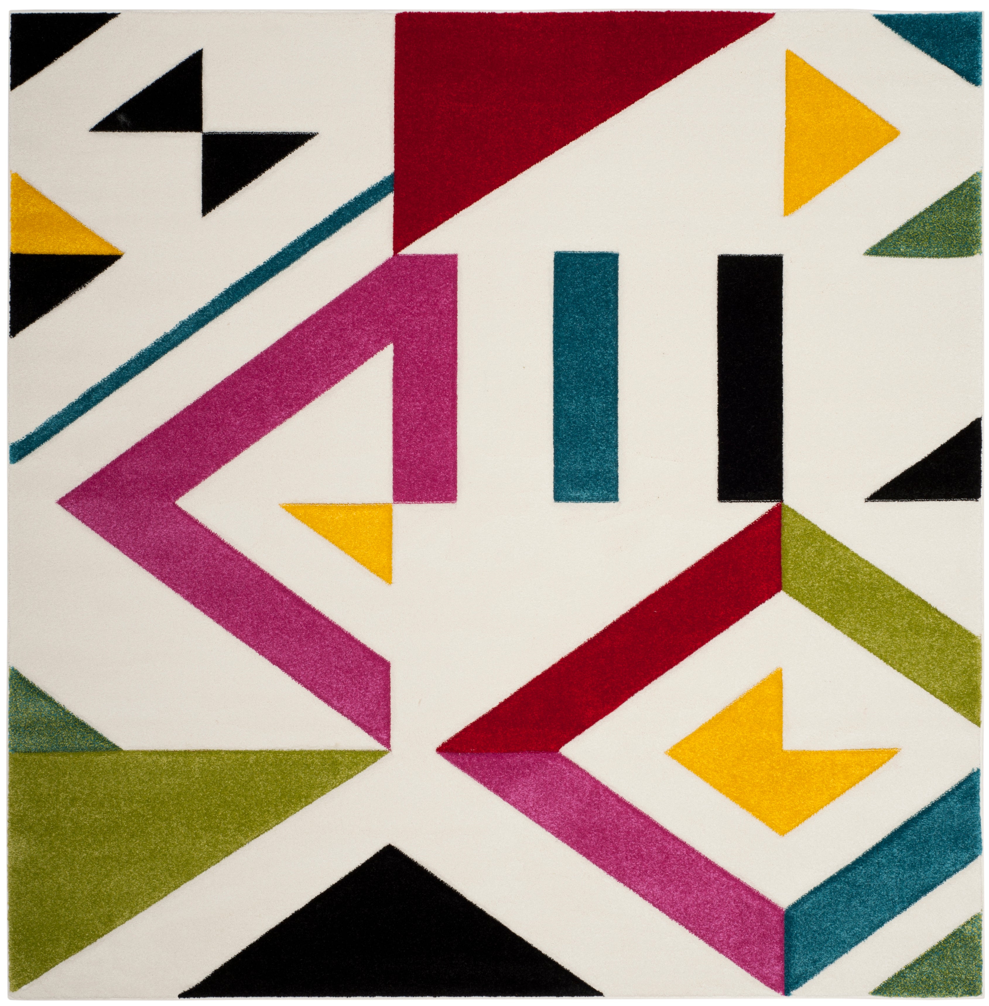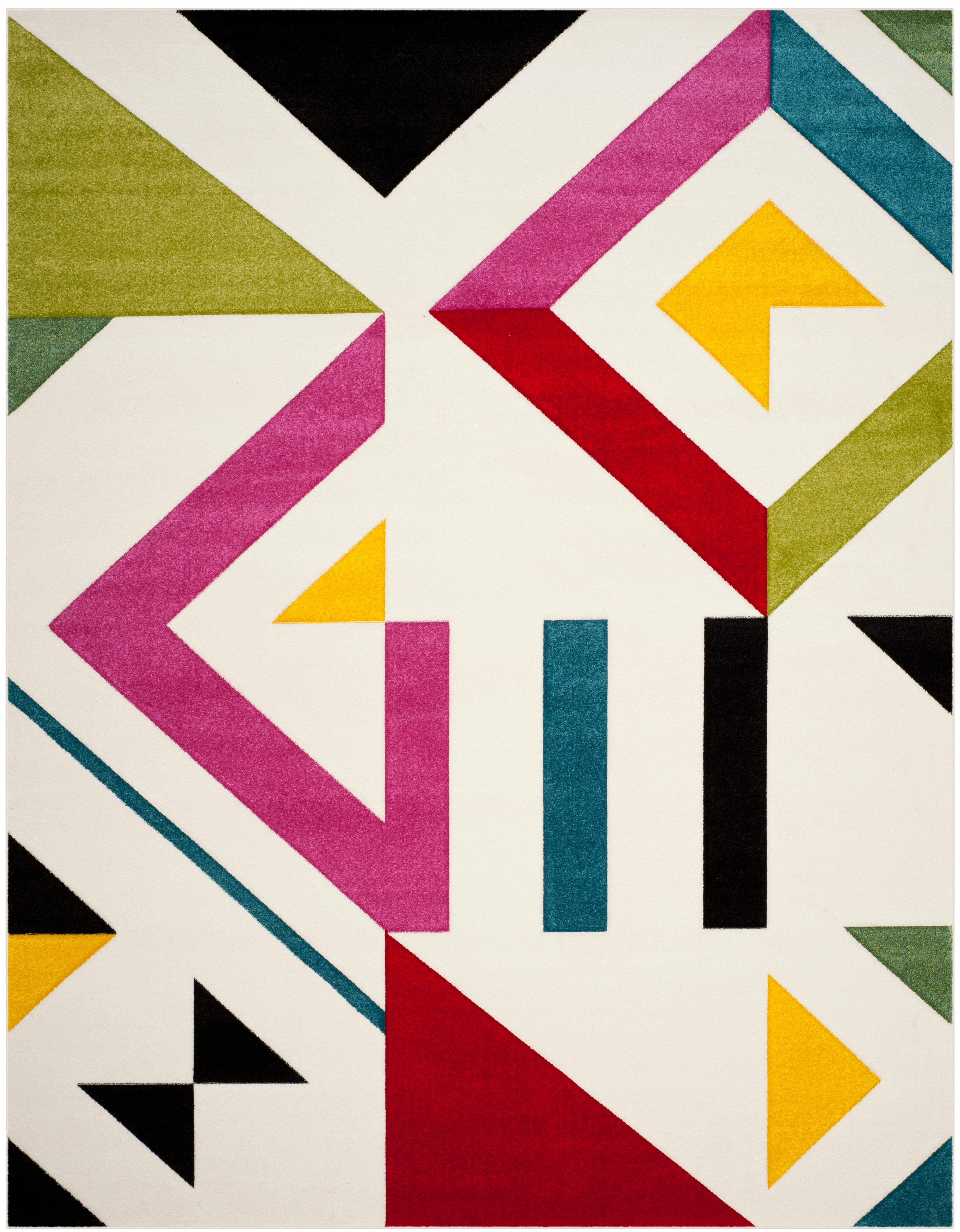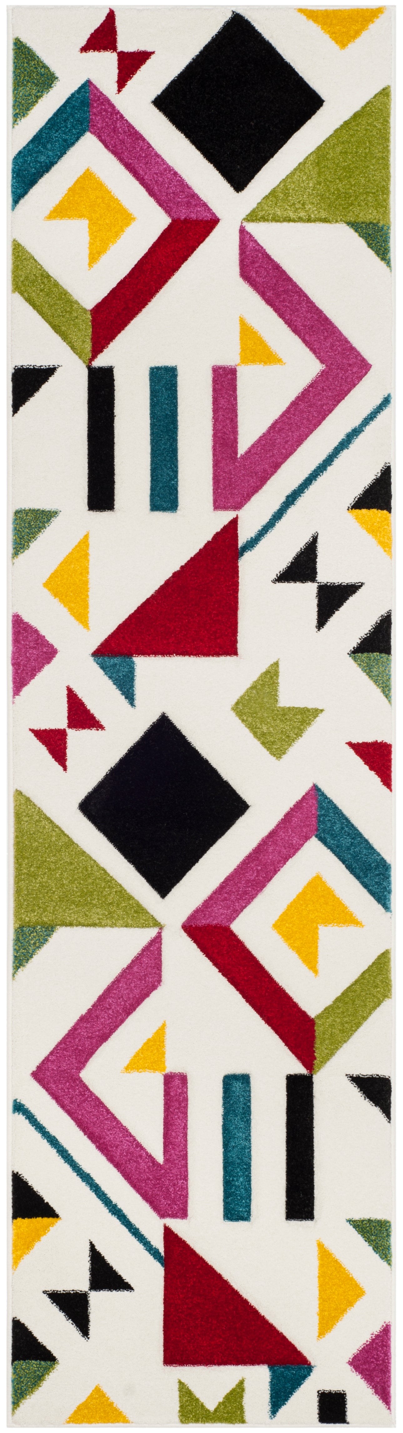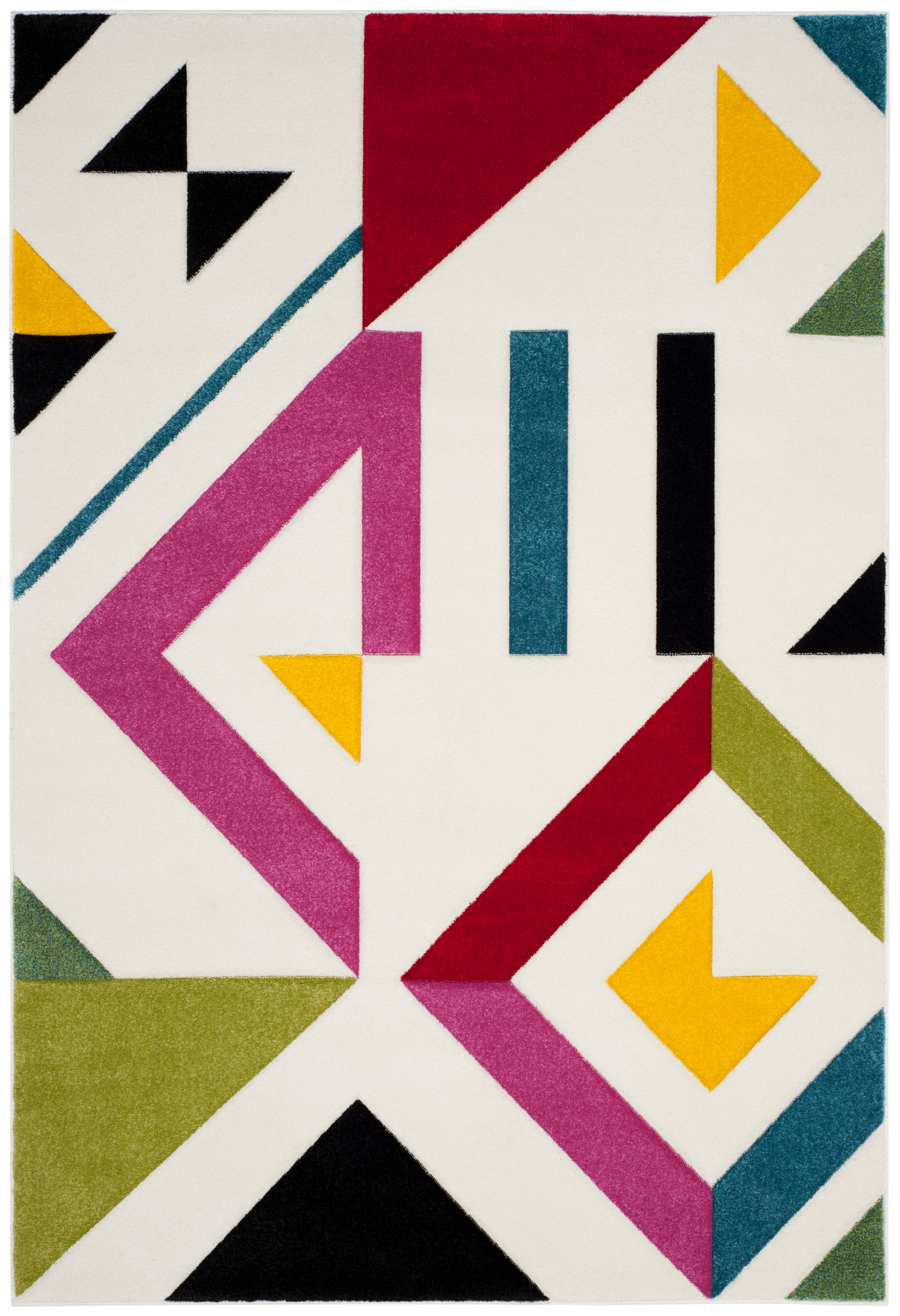 Featuring a harmonious blend of Ivory and Rose hues, the rug presents an eye-catching geometric pattern that artfully combines angular and linear motifs. This striking design will infuse your living space with a modern and dynamic flair, turning heads and sparking conversations.