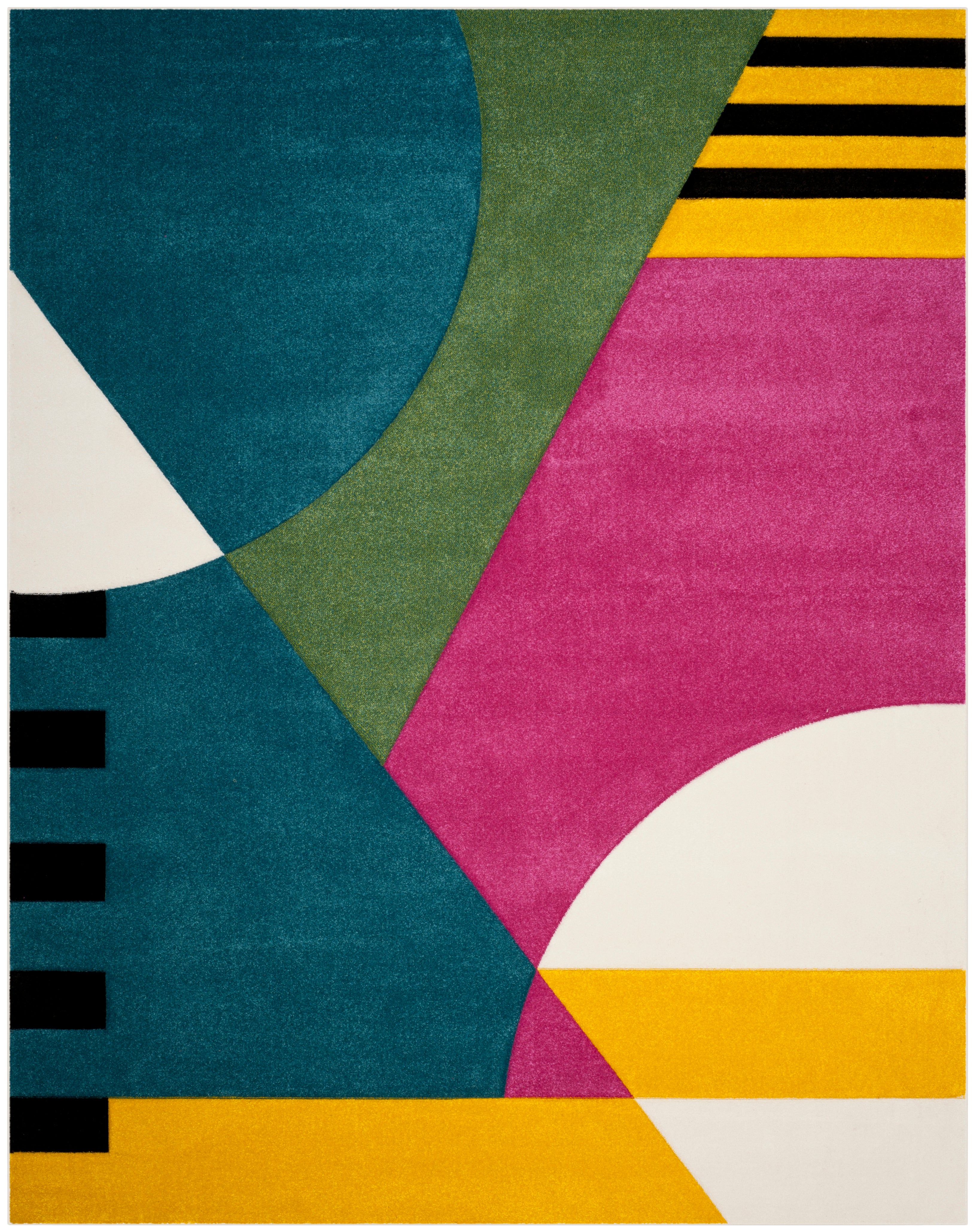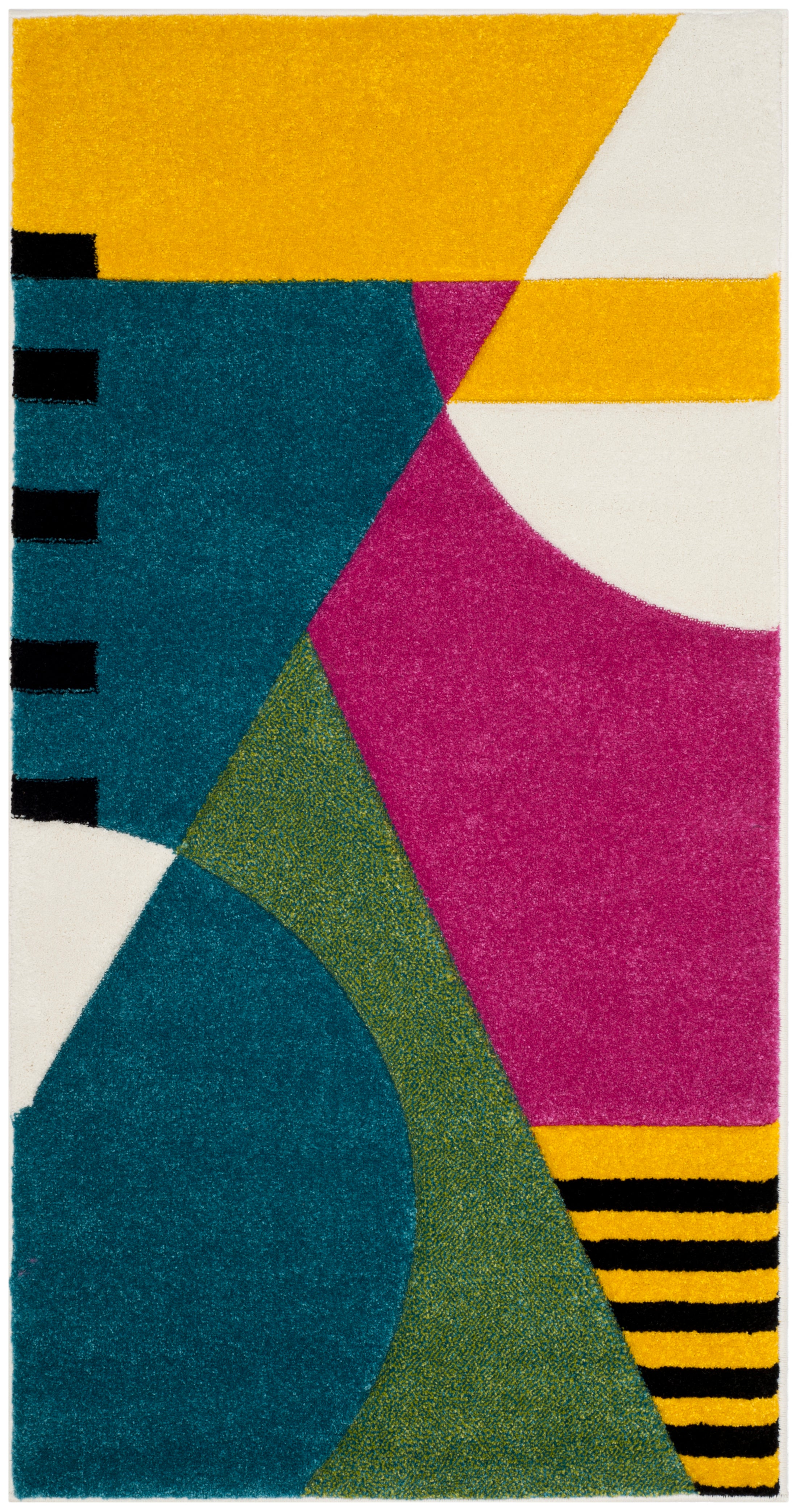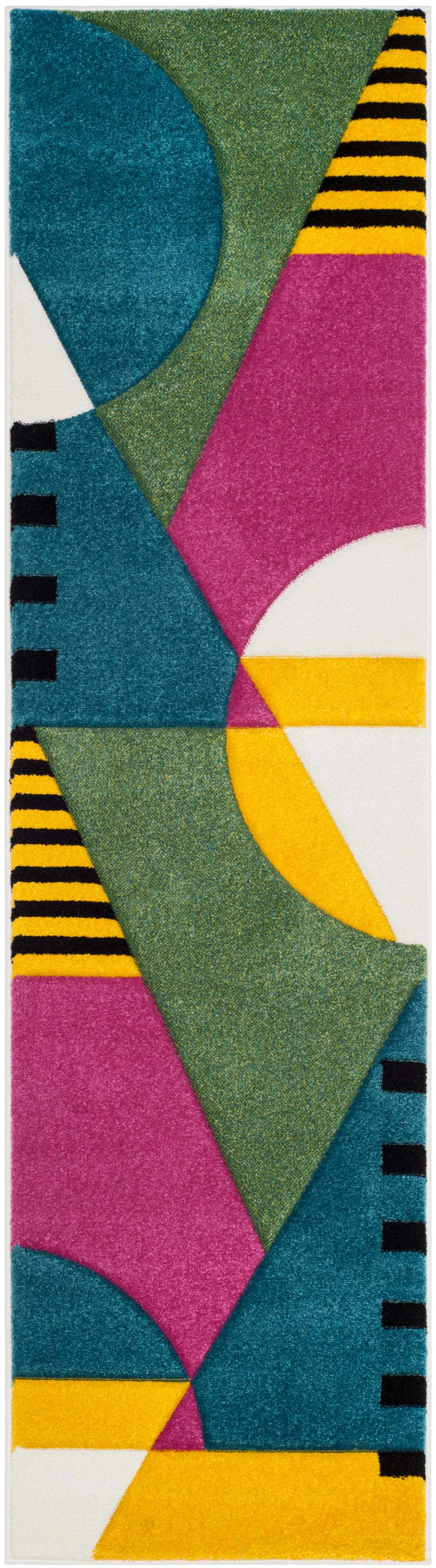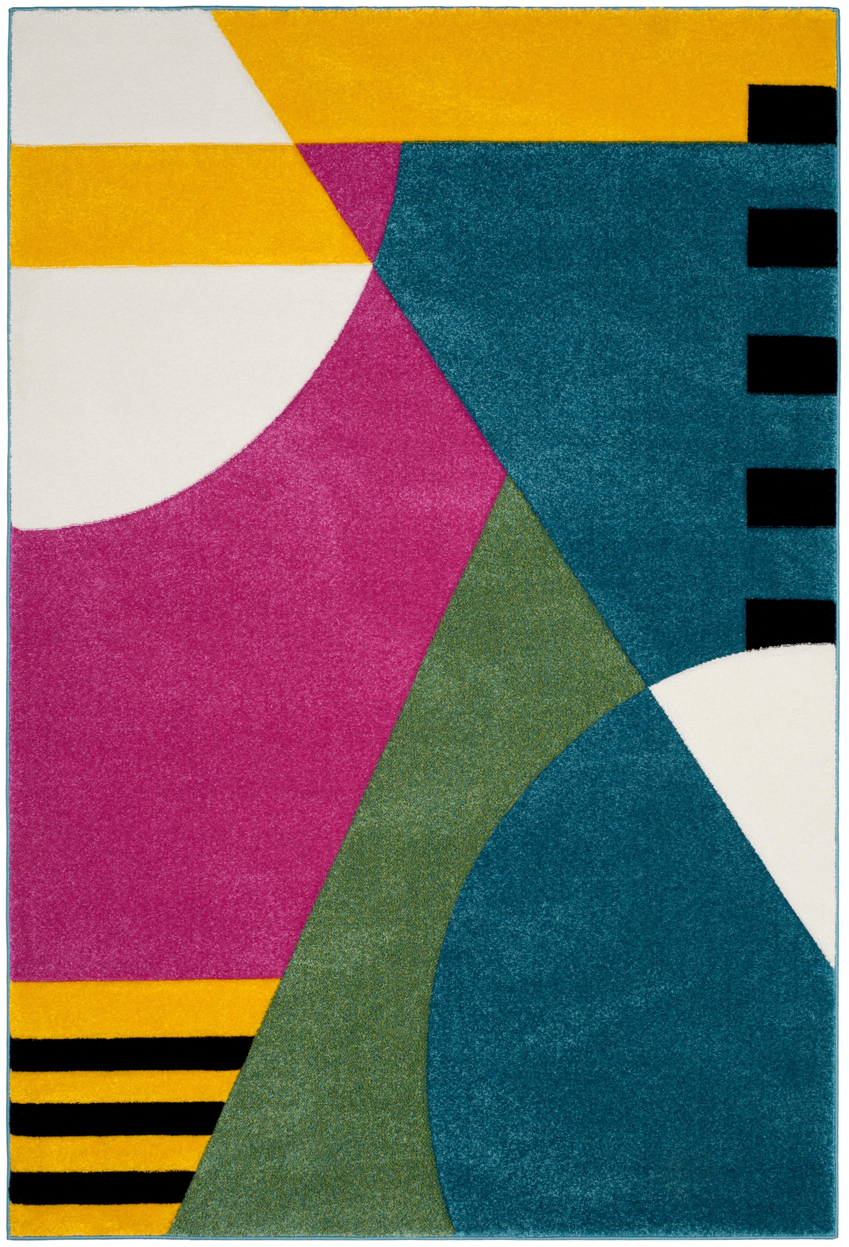 The striking design of this rug exhibits bold peacock blue and fuchsia colors, harmoniously blending to create a visual feast for the eyes. Its contemporary style is punctuated by a compelling pattern that combines abstract geometric shapes and sharp lines, immediately drawing attention and sparking conversation.