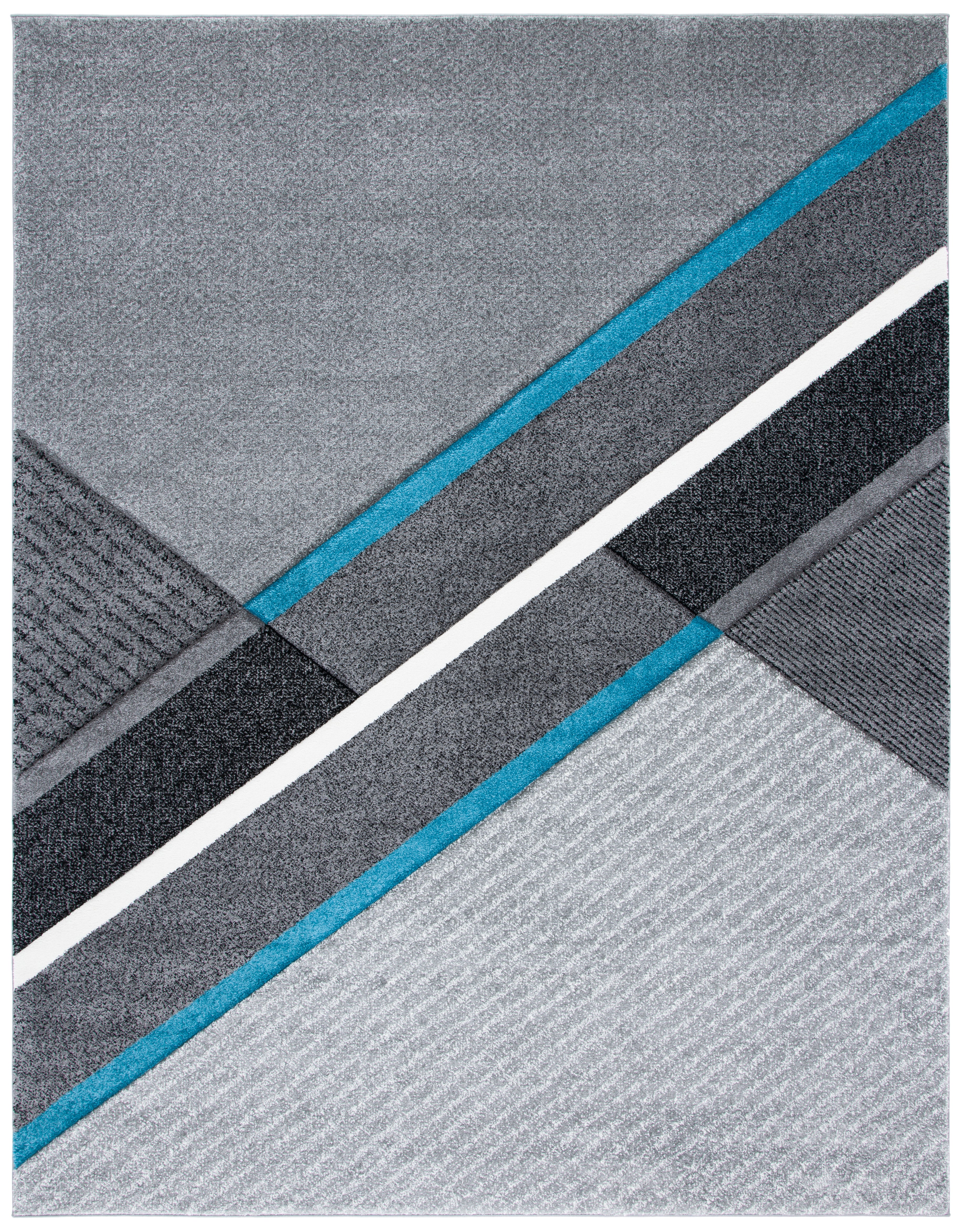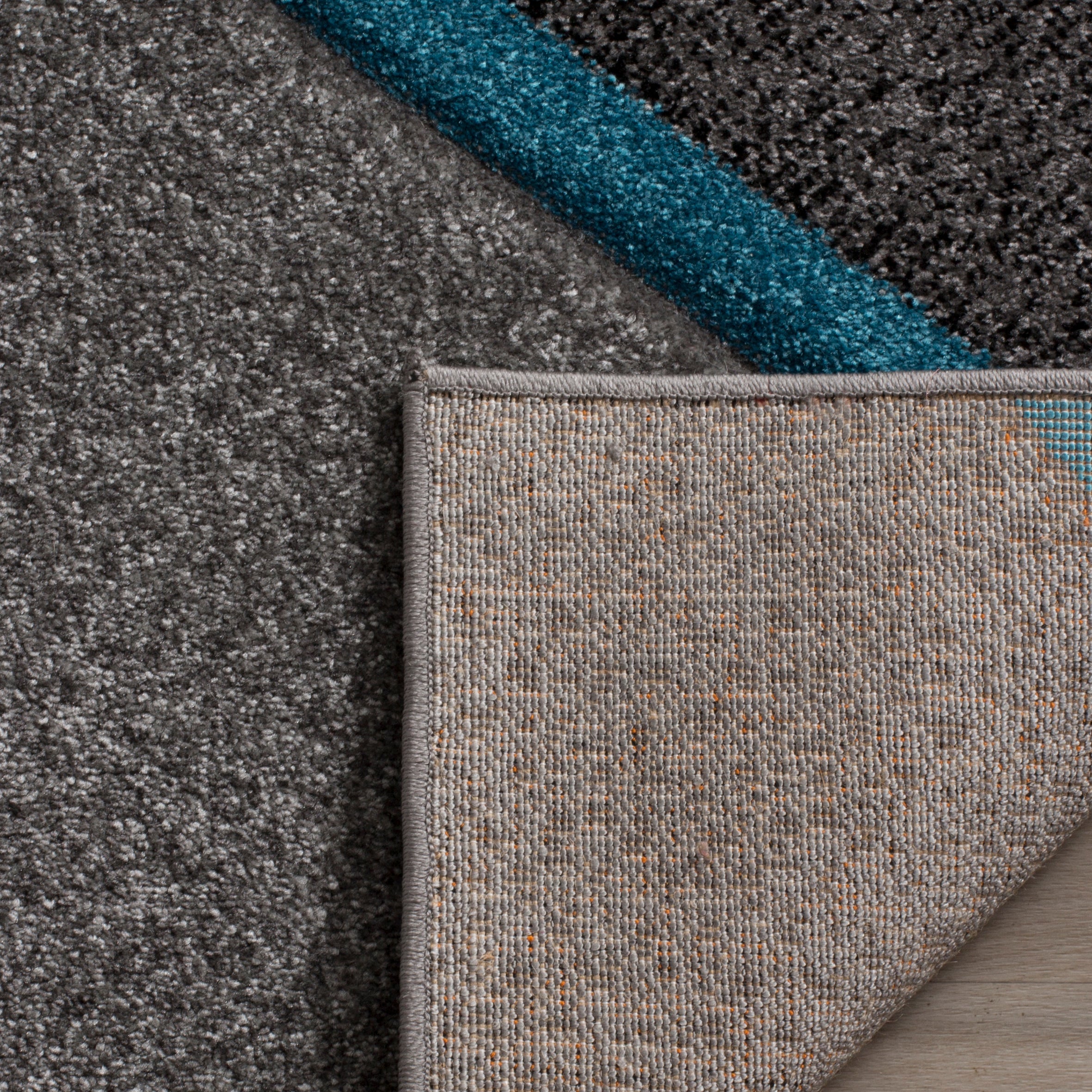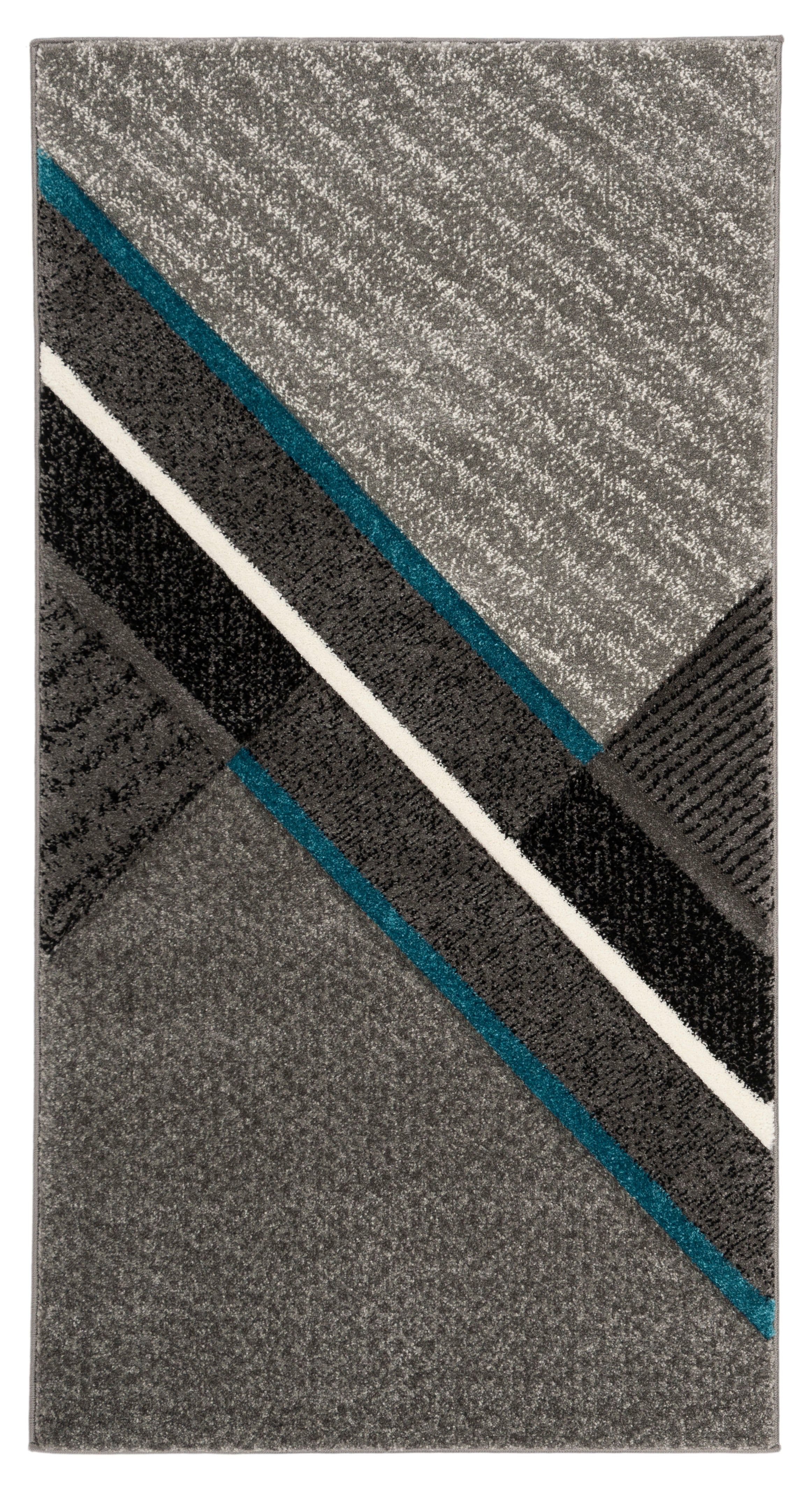 The rug features a dynamic interplay of grey hues complemented by striking teal and crisp white accents, arranged in a bold, angular pattern that creates a sense of motion and depth. The contrast between the dark and light elements offers versatility in styling, allowing the rug to seamlessly integrate into a variety of decor schemes.