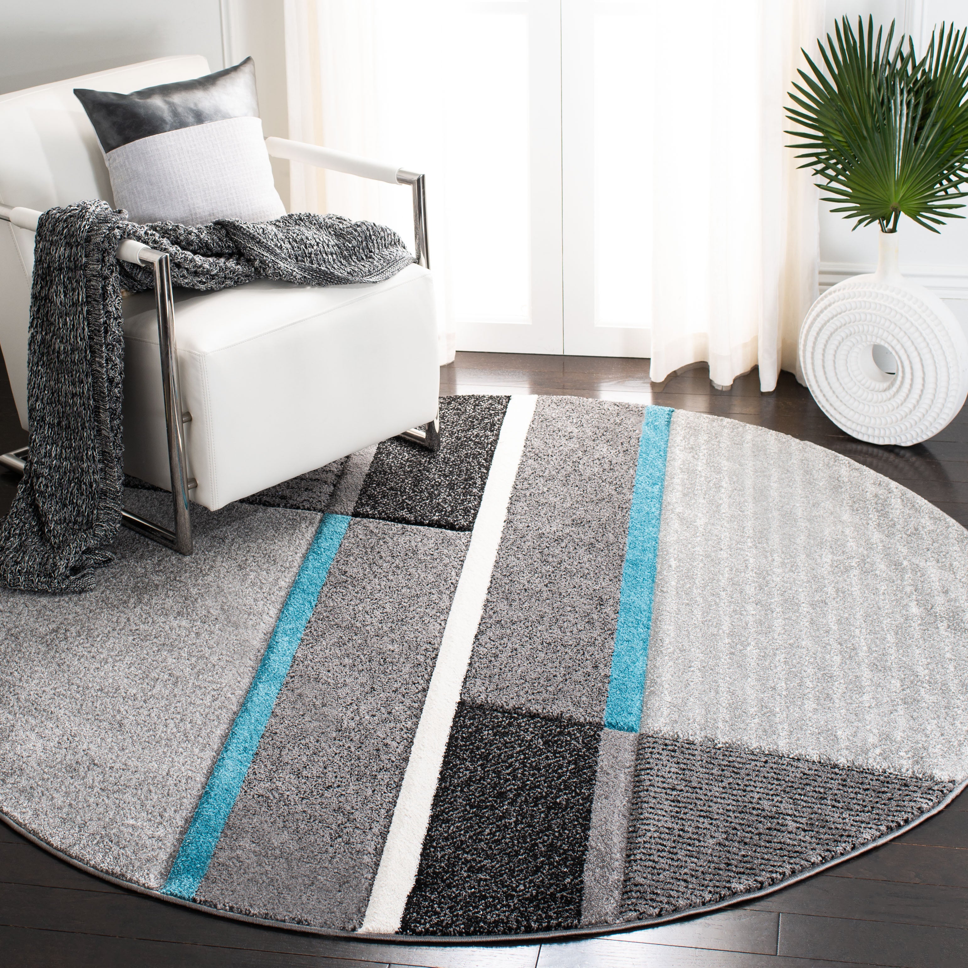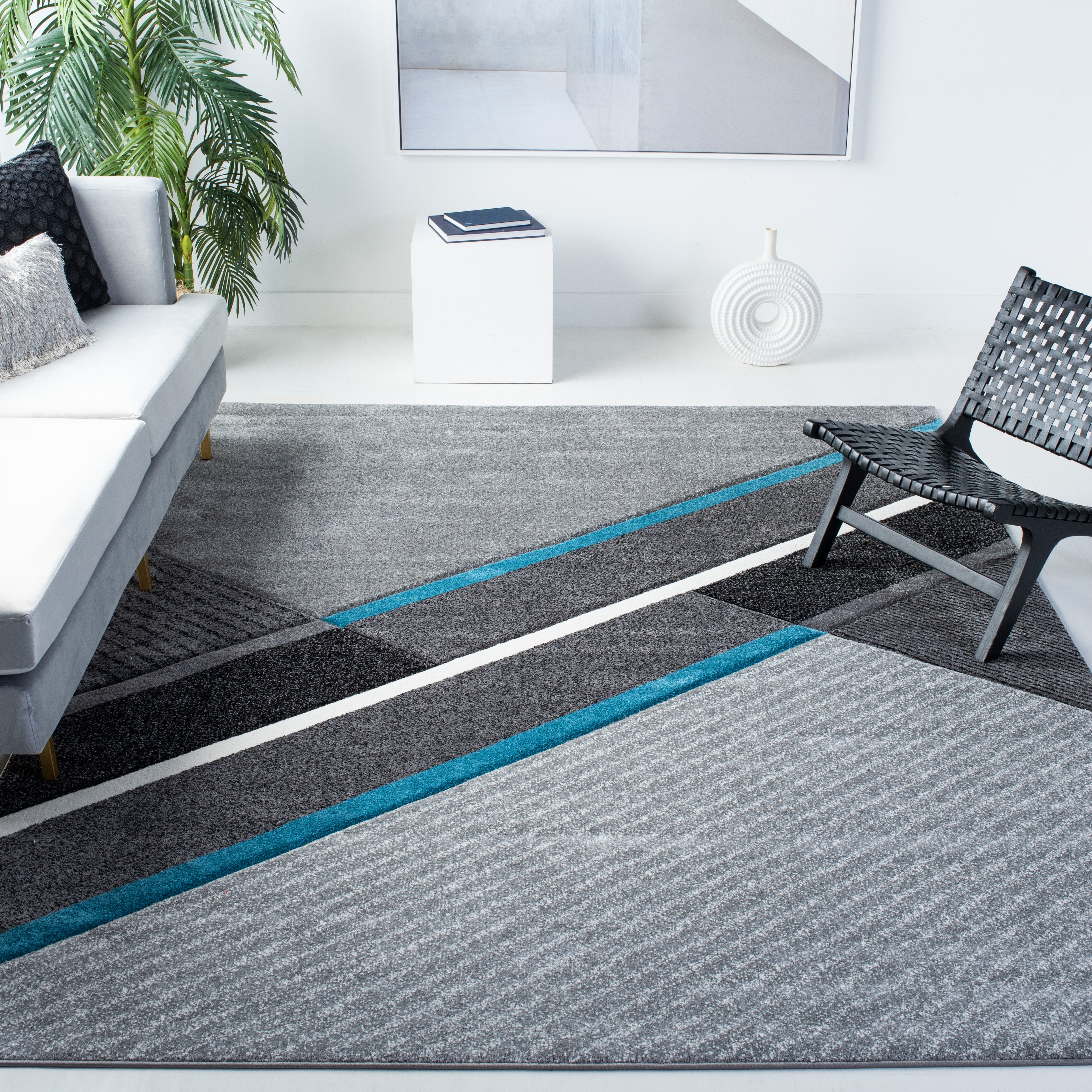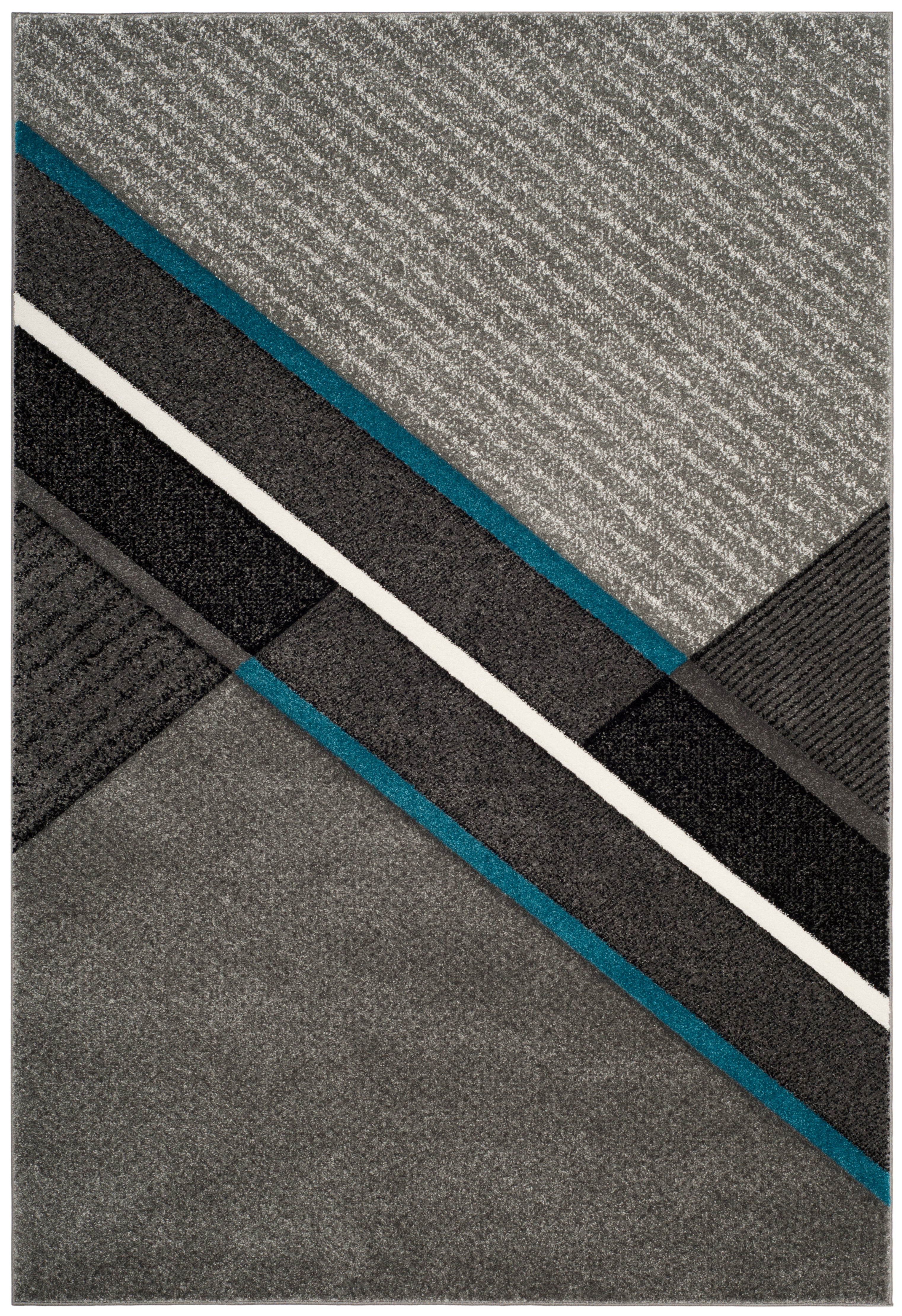 The rug features a dynamic interplay of grey hues complemented by striking teal and crisp white accents, arranged in a bold, angular pattern that creates a sense of motion and depth. The contrast between the dark and light elements offers versatility in styling, allowing the rug to seamlessly integrate into a variety of decor schemes.