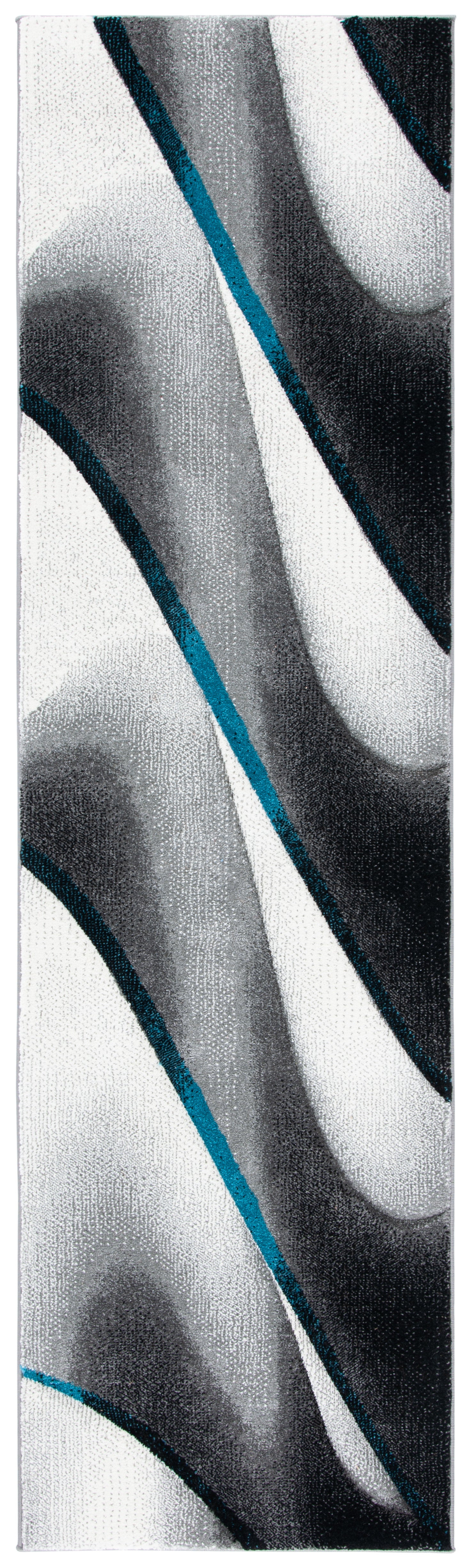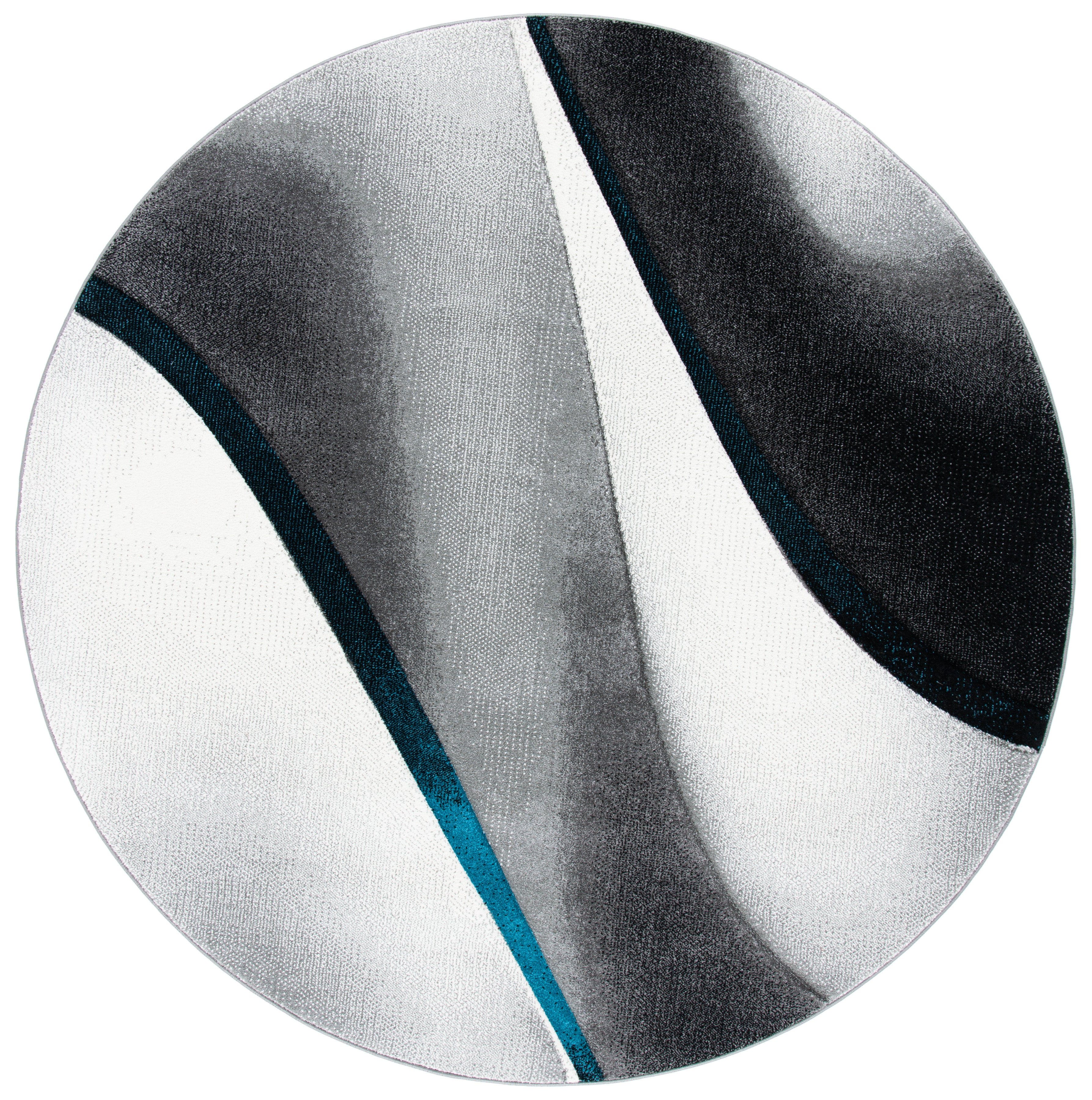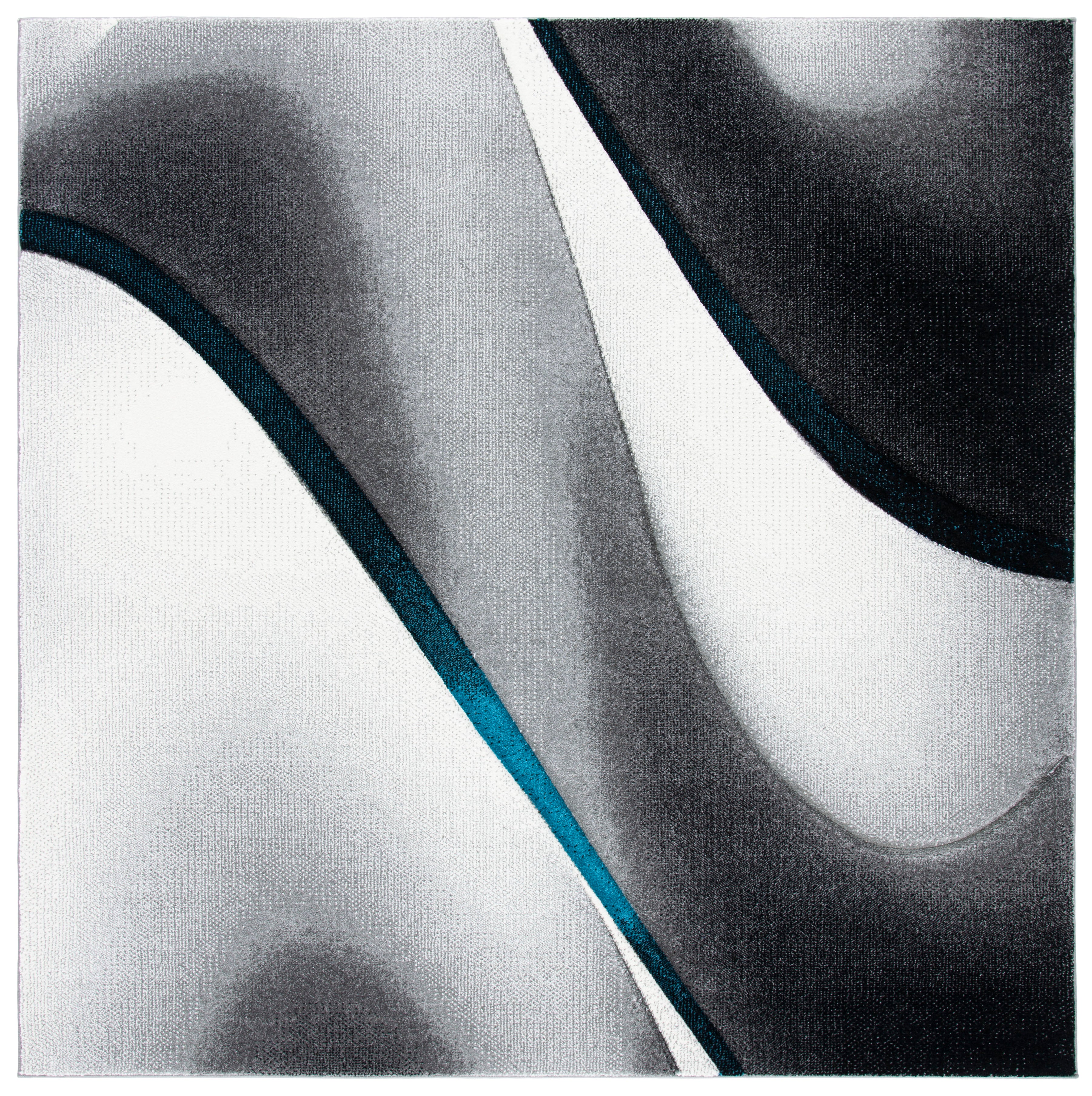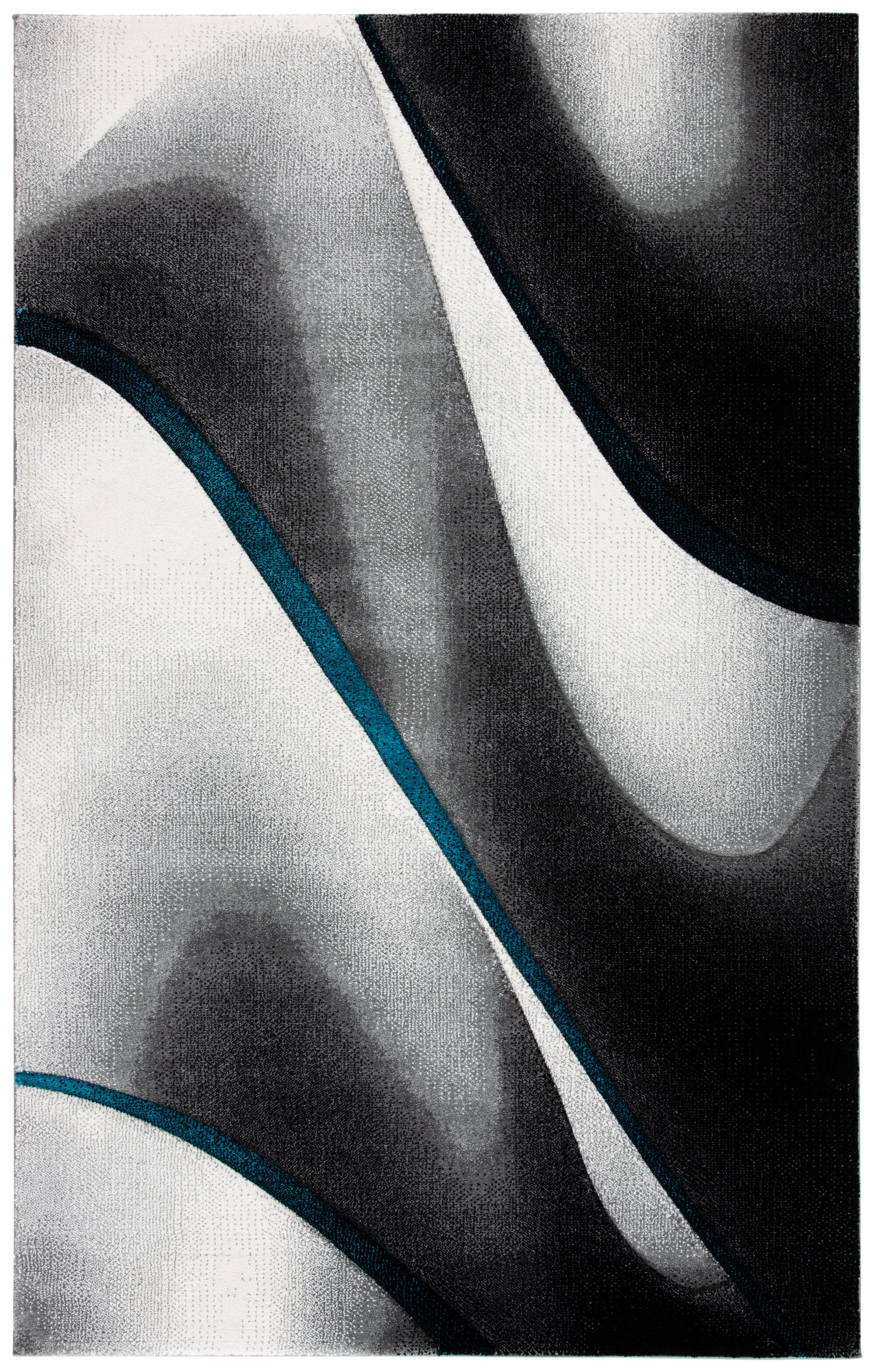 The rug's design features a modern blend of grey and blue hues, with sweeping curves and bold lines that draw the eye across the weave. The sophisticated patterning exudes an artistic, contemporary aesthetic that complements a variety of decors.